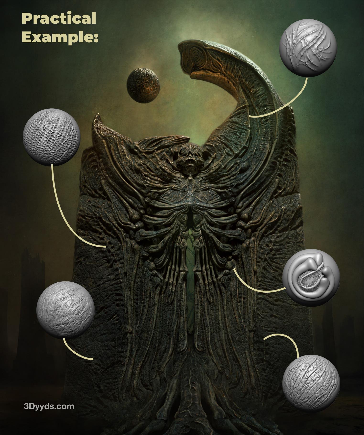 这是 45 种自定义 ZBrush 笔刷的集合,灵感来自 Zdzisław Beksiński 的反乌托邦超现实主义和 Hans Ruedi Giger 的生物机械美学的惊人作品。该包还附带 35 个噪波制造器预设和 11 个自定义 MatCaps。
