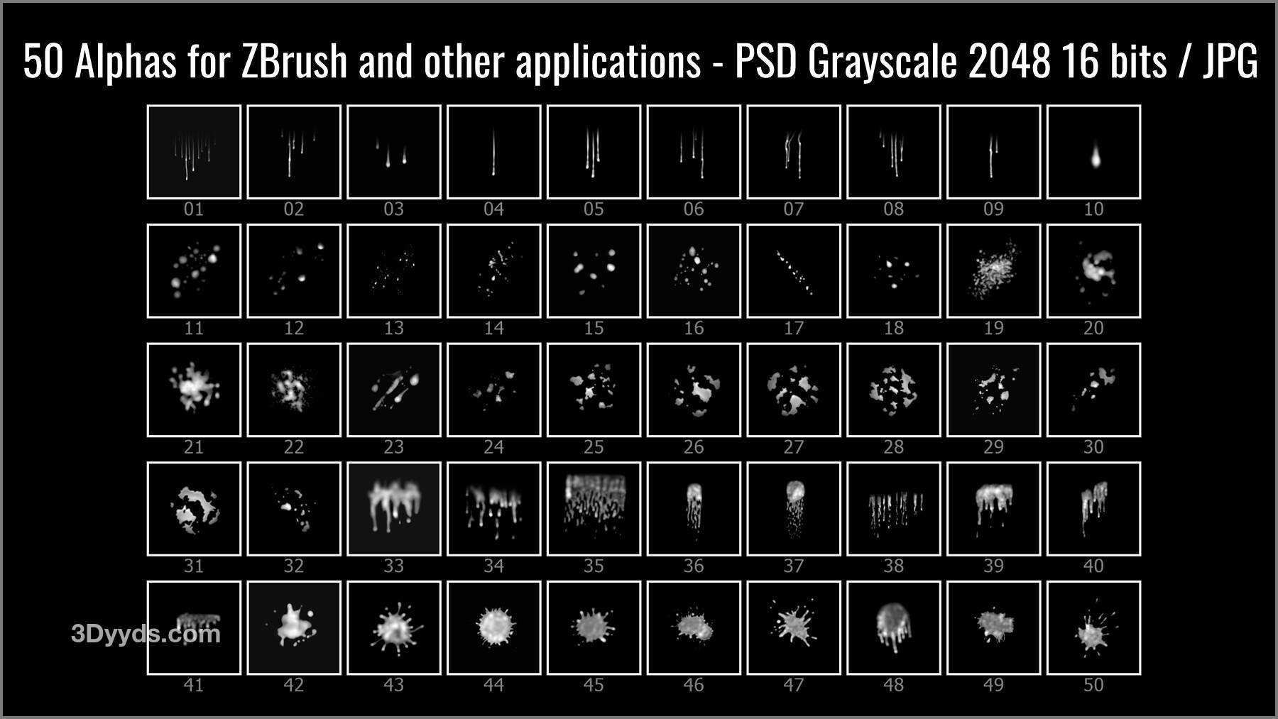 - 50个PSD Alpha通道,适用于ZBrush及其他支持3D Alpha通道并设置中点的3D应用程序。分辨率为2048x2048像素,16位灰度,提供PSD和JPG格式。