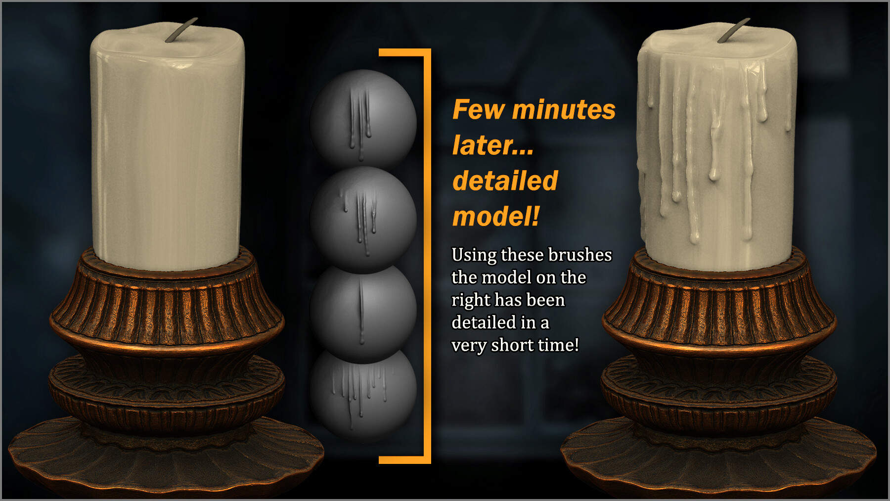 Drips And Splatter Maker是一套完整的笔刷套装,用于雕刻和绘制滴落、水滴、泡沫、水坑、粘液和飞溅效果。无论是水、蜡烛的蜡、泥土、血液、泪水、泡沫、流口水的怪物、粘滑的野兽、融化的表面,还是任何你想要绘制或雕刻的内容,这些笔刷都能派上用场。对于ZBrush艺术家来说,这是必备的工具!