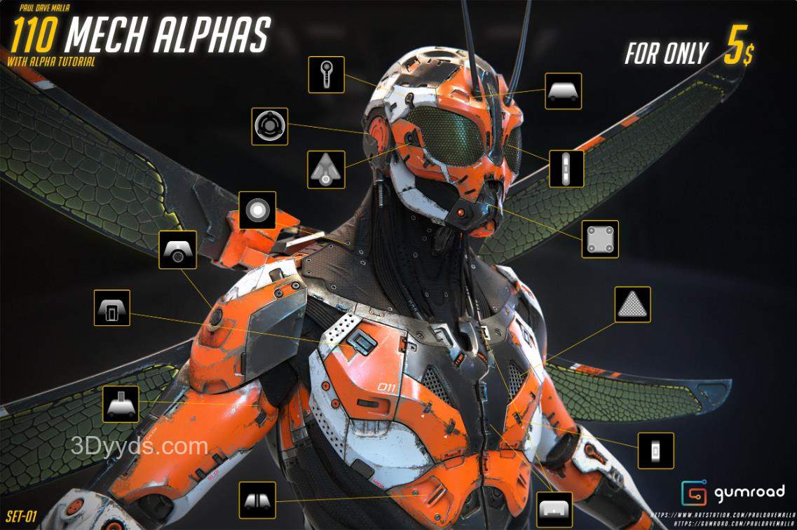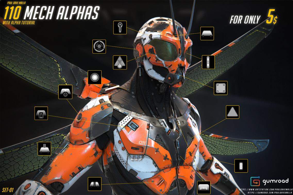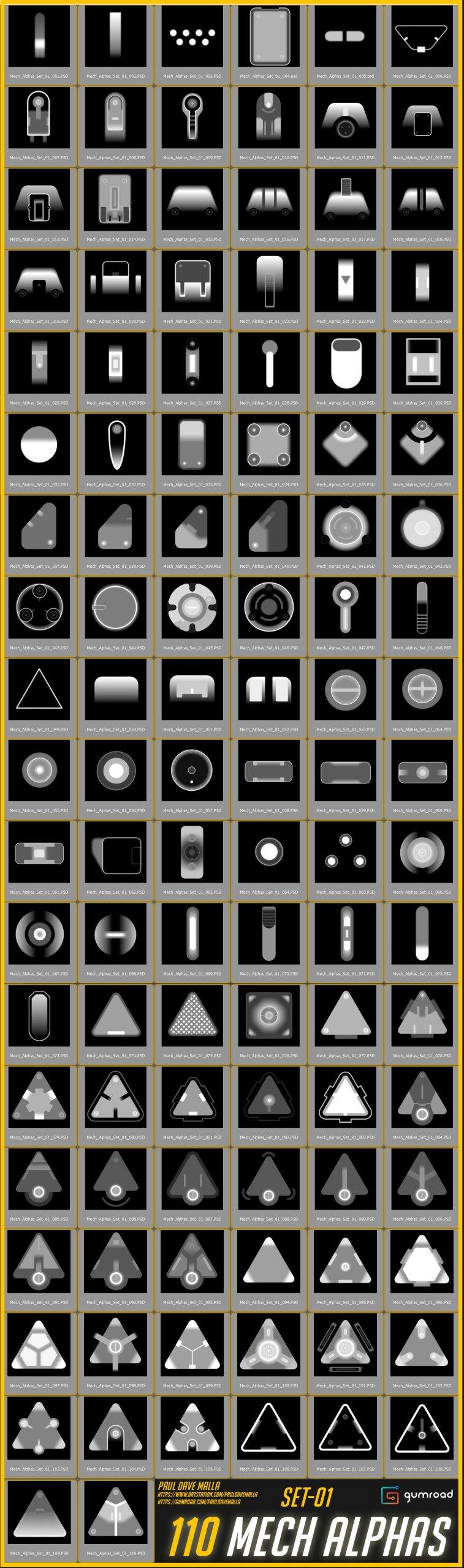 增强机甲细节的alpha贴图,包含110种具有几何图案和详细特征的alpha材质! !