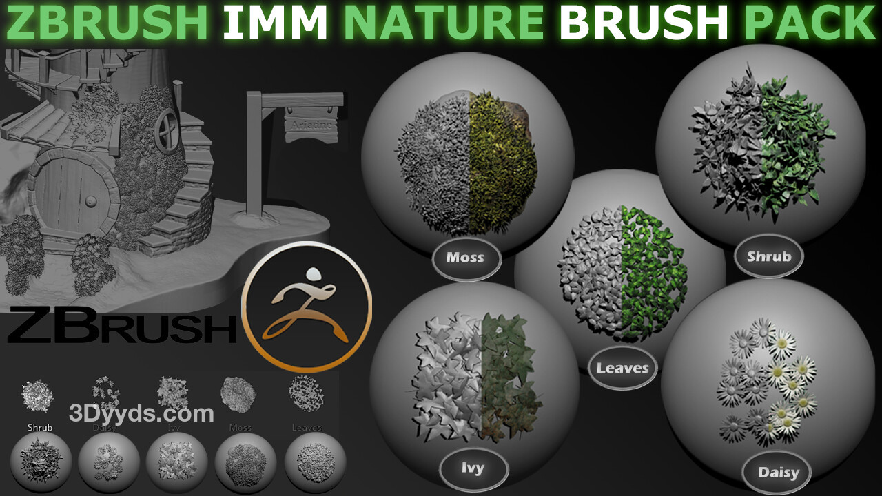 最新发布的 IMM Zbrush 自然画笔包。快速创建逼真的攀缘植物、灌木或苔藓。