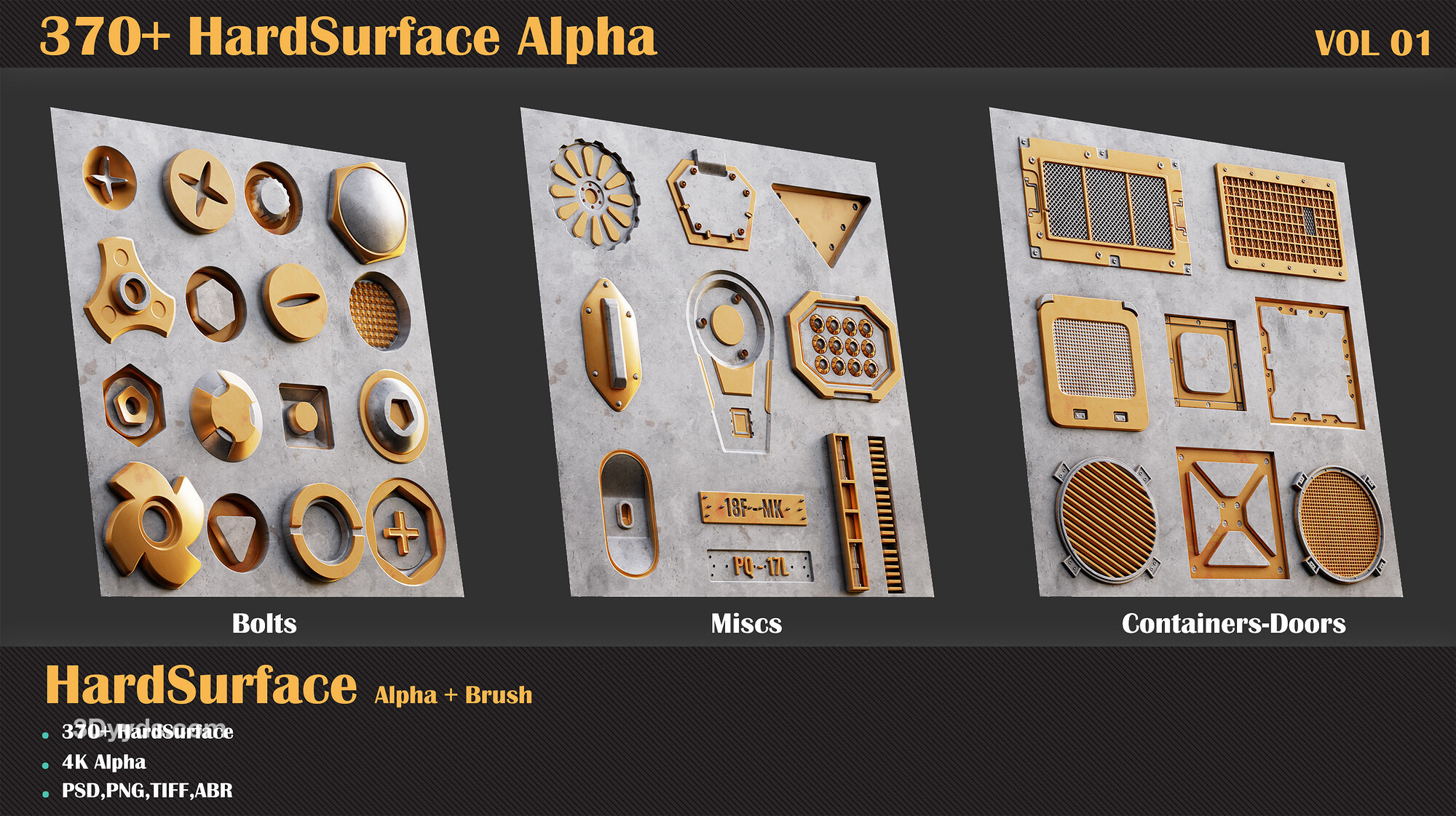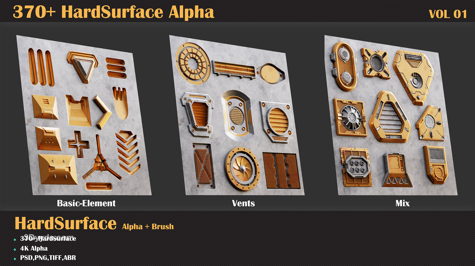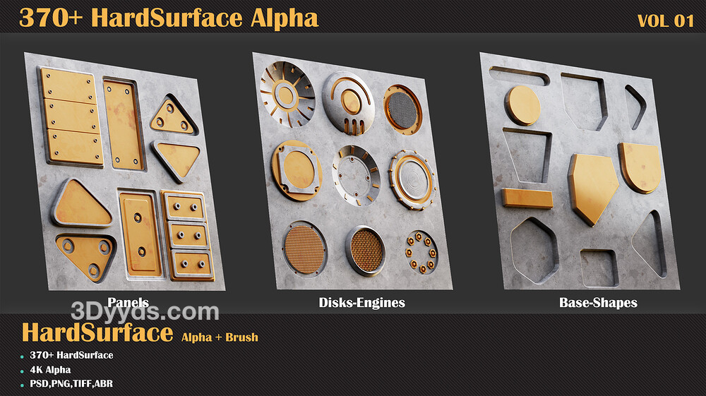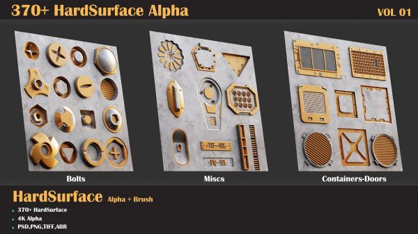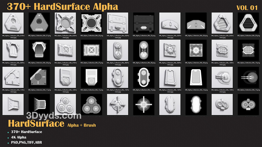 每当您需要创建硬表面模型时,都会有很多小细节,创建这些东西毫无意义。因此,您需要一个装满中小型细节的包,这些细节可以提高您的速度并帮助您创建更好、更令人惊叹的硬表面模型。我们收集了大约 370 多个不同类别的硬表面 alpha,以帮助您满足这方面的需求。这只是第 1 卷,加油!