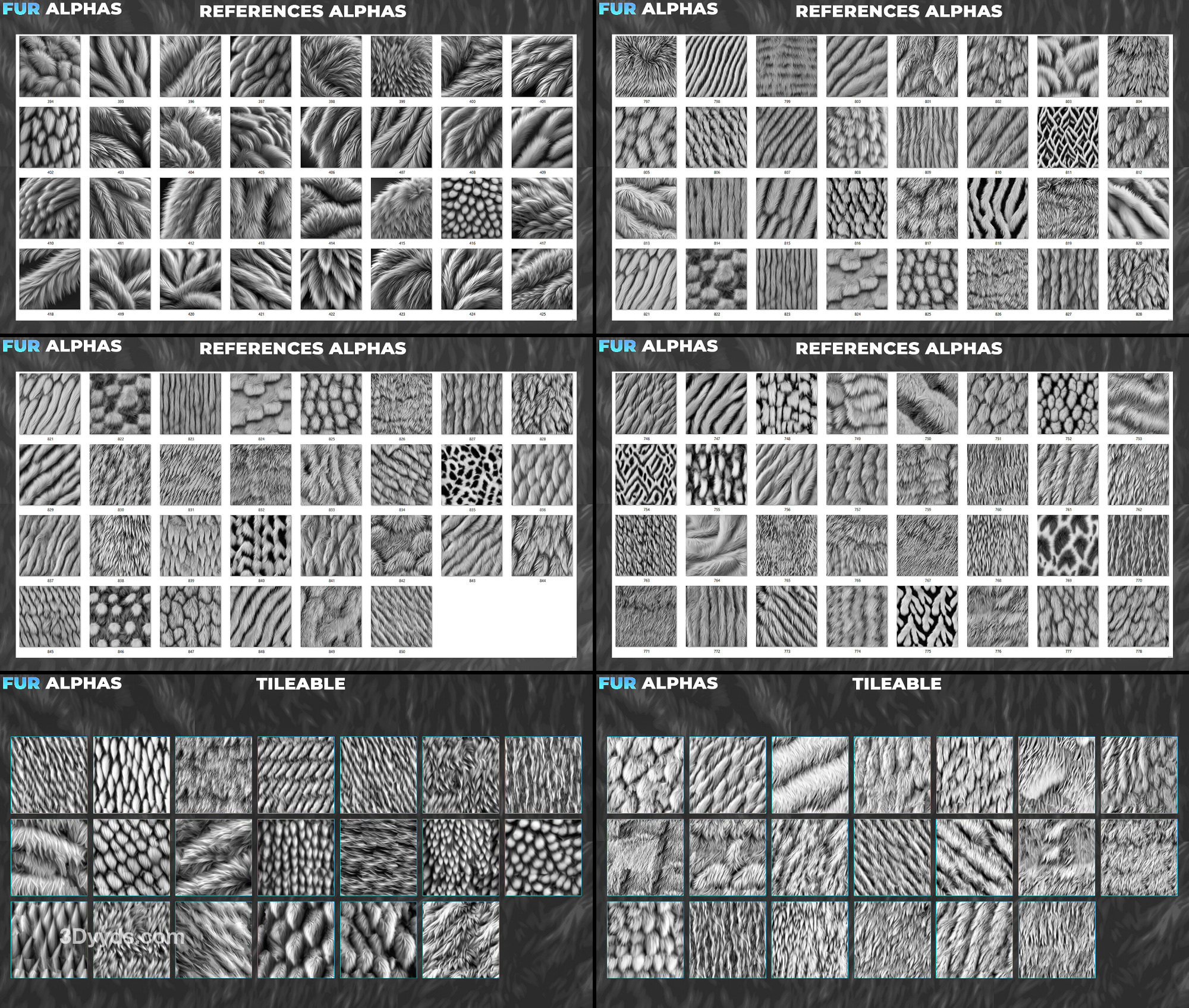 zbrush311-456款动物生物毛发皮毛绒毛Alpha笔刷png纹理贴图