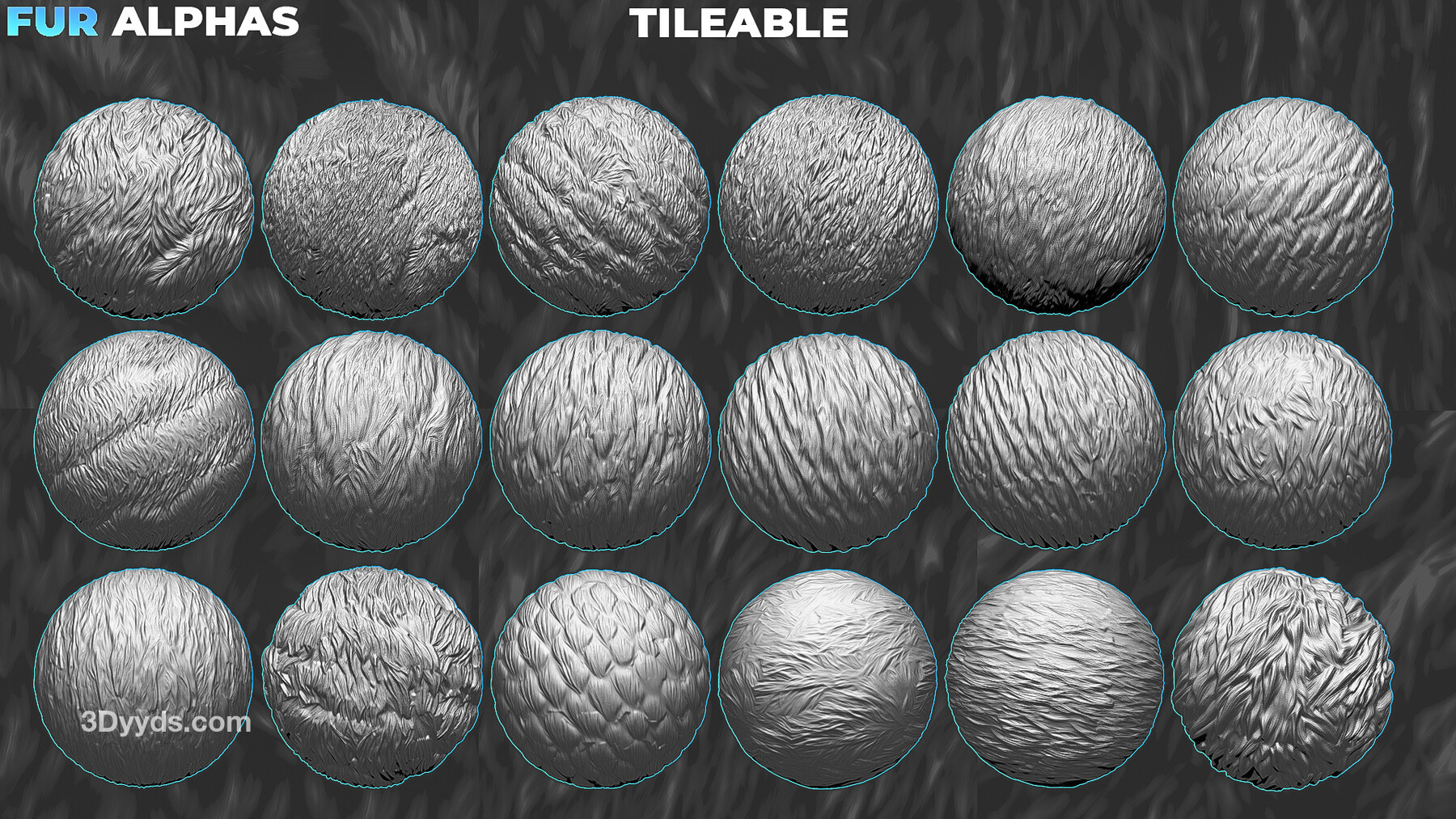 该包包含 492 个置换贴图 (PNG),可在 Zbrush、Substance Painter 和其他程序中为您的网格添加毛发和头发细节。 该产品包含2个文件夹: 1. 40 个可平铺的理想 alpha 用于雕刻羊毛和头发。只需将 alpha 添加到画笔即可。 2. 452 个 alpha 参考也可用于雕刻,只需为您的模型选择必要的 alpha 并调整画笔设置即可。 尺寸:2304x2304