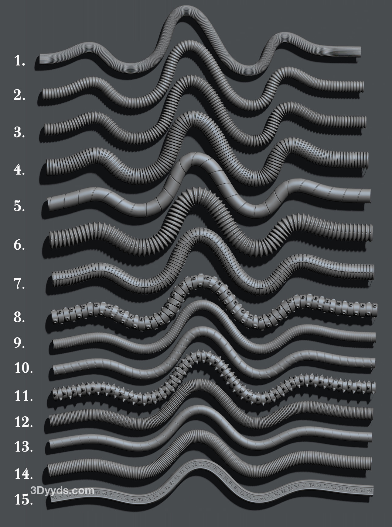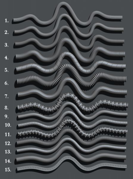 zbrush312-15款机械机器人软管管道科幻防护人物雕刻笔刷