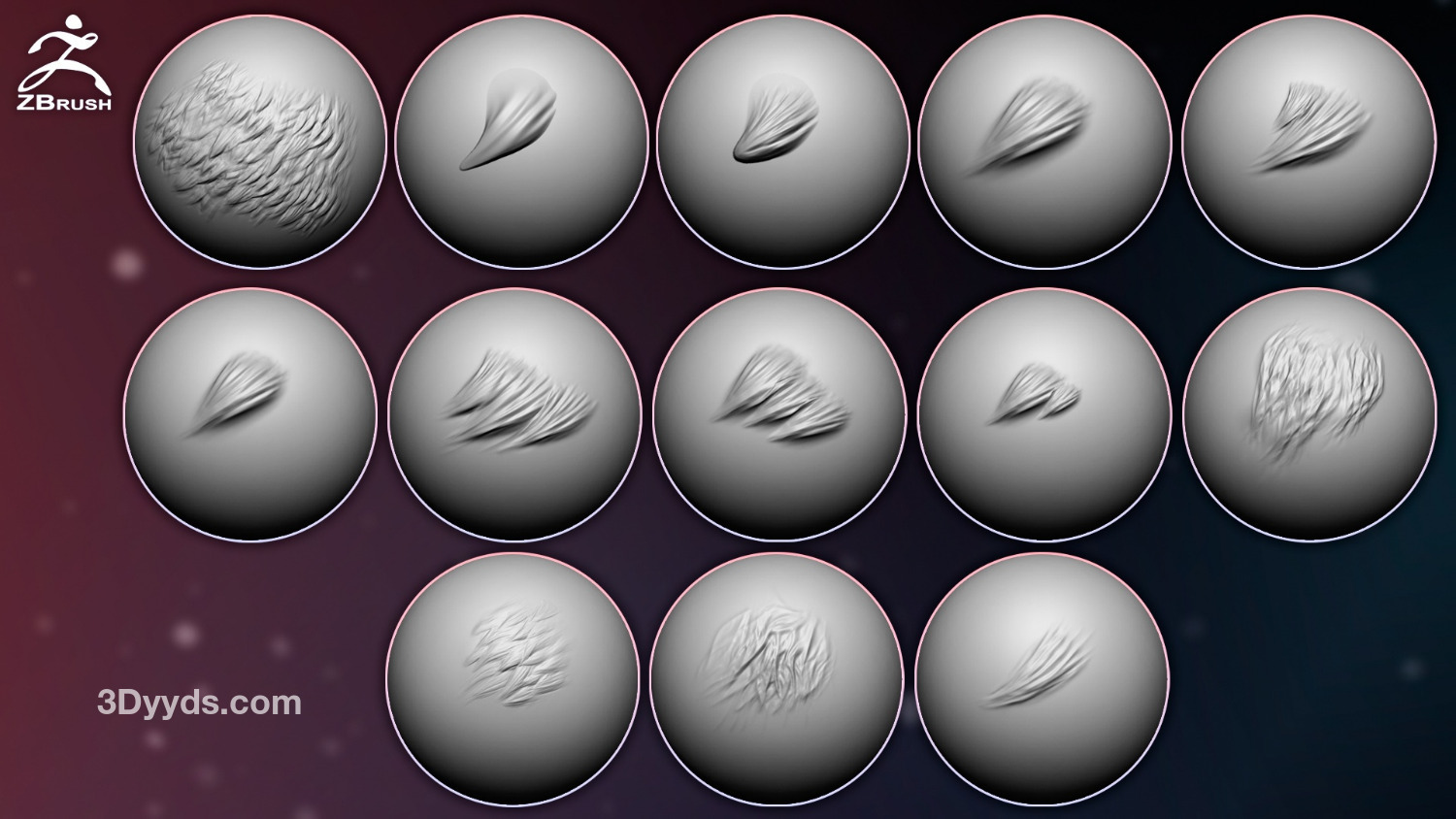 包包含 14 个 vdm画笔和 14 个 alphas 贴图(PSD),用于在 Zbrush 中为网格添加毛发和头发细节。