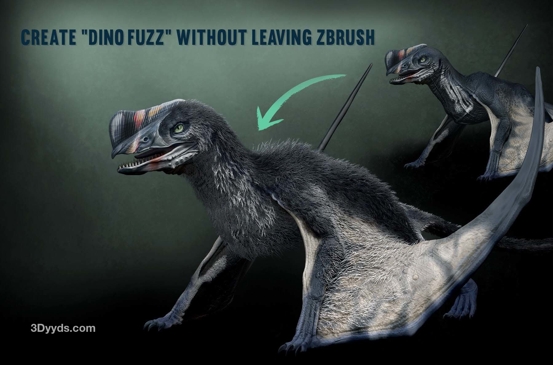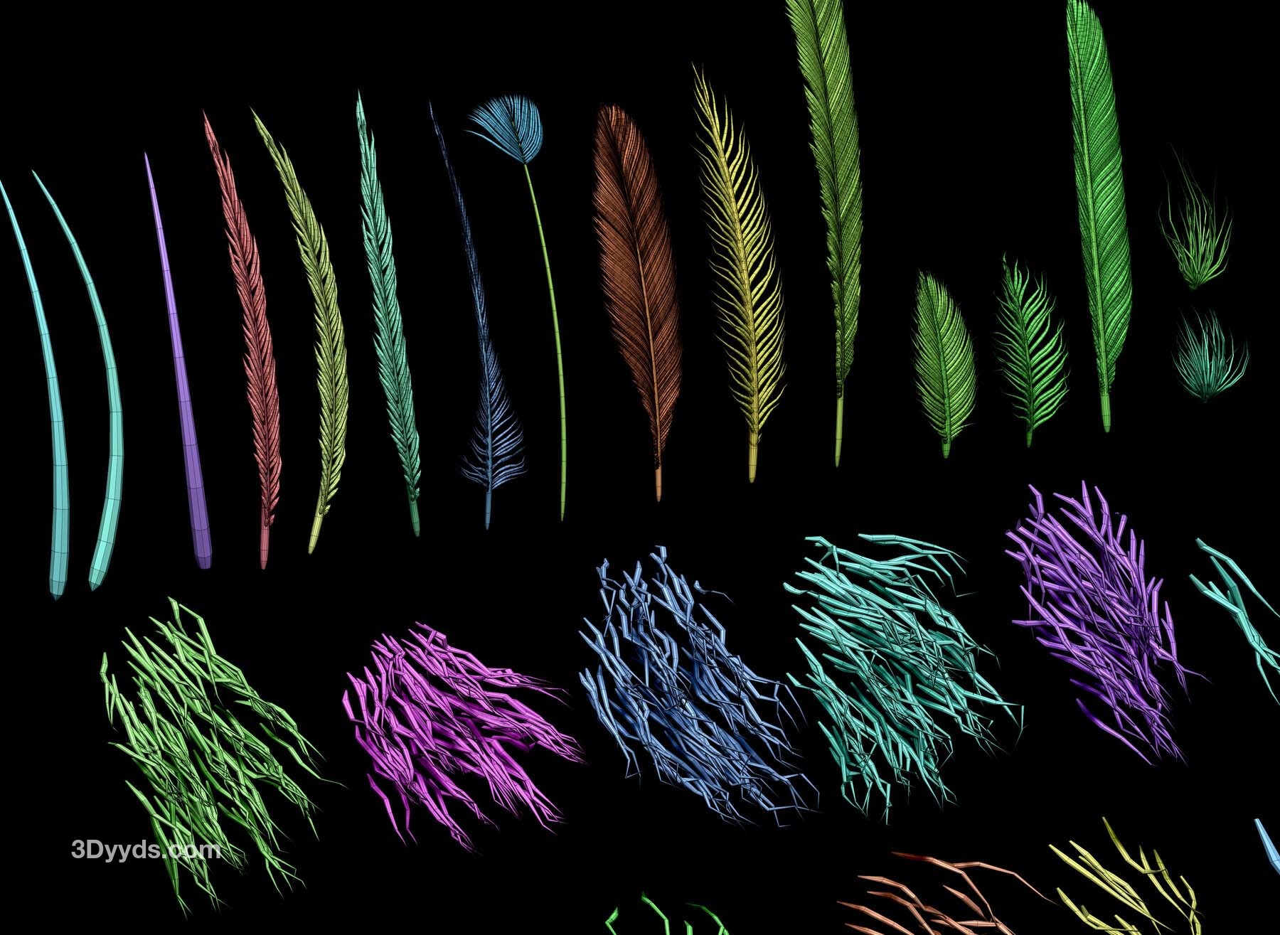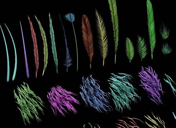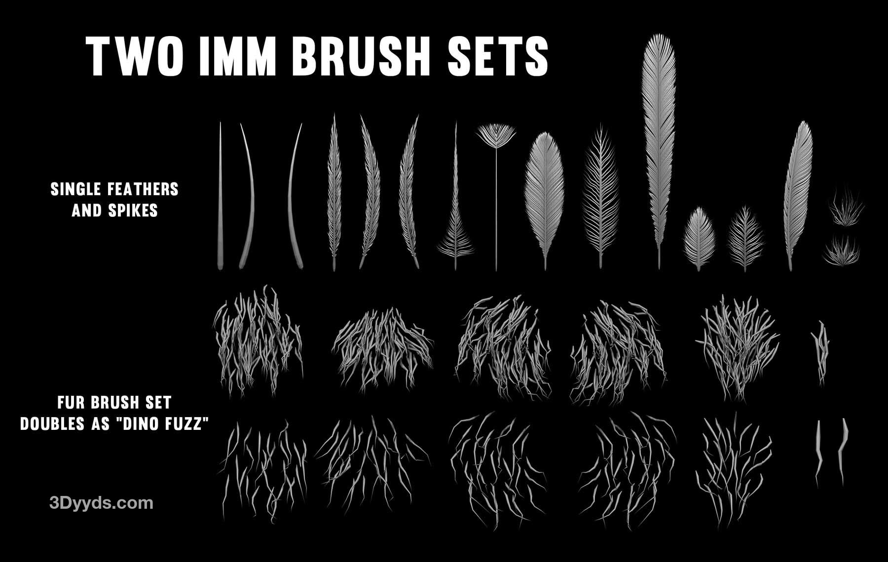 我制作这些 IMM 画笔主要是为了好玩,但我认为其他人也可能会觉得它们有用。第一个 IMM 画笔包含 16 个原始羽毛,根据我的研究,这些羽毛通常比现代羽毛简单且通常是对称的。我在这套画笔中添加了三种带有 UV 的刺,以方便使用。第二套 IMM 画笔是一个毛发或“恐龙毛”画笔,包含 13 个网格。这些可以用来快速在 ZBrush 中创建逼真的毛发,而不必依赖 Fibermesh。创建的几何体非常适合将其烘焙成低多边形网格,或者如果你是在做概念设计的话也很有用。