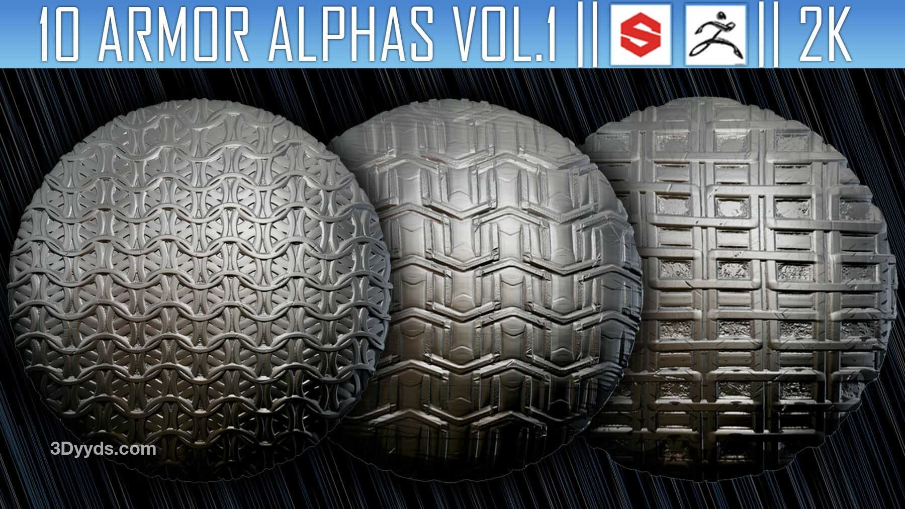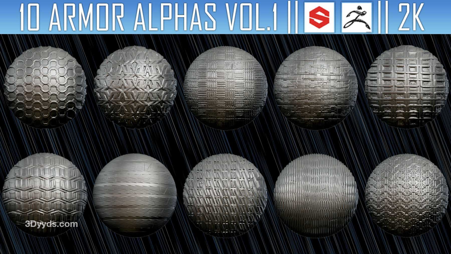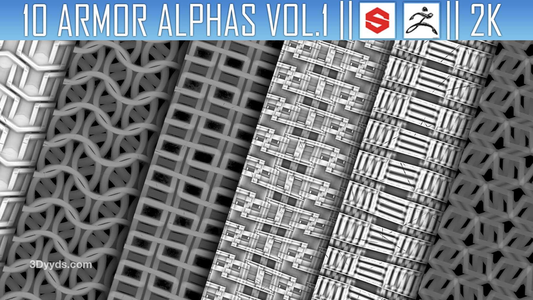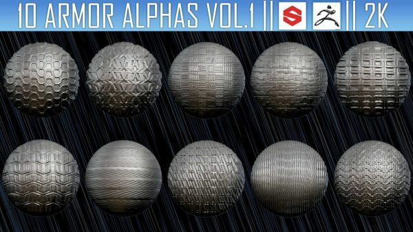 该素材包包含10张Alpha贴图(PNG格式,2K分辨率),可用于在ZBrush、Substance Painter及其他软件中为模型添加盔甲细节