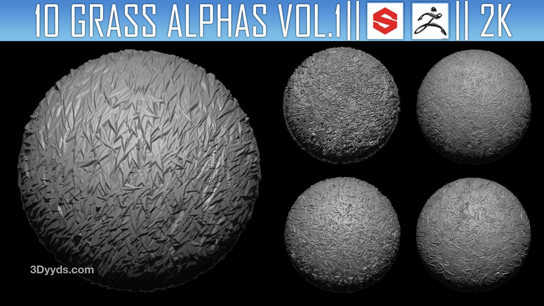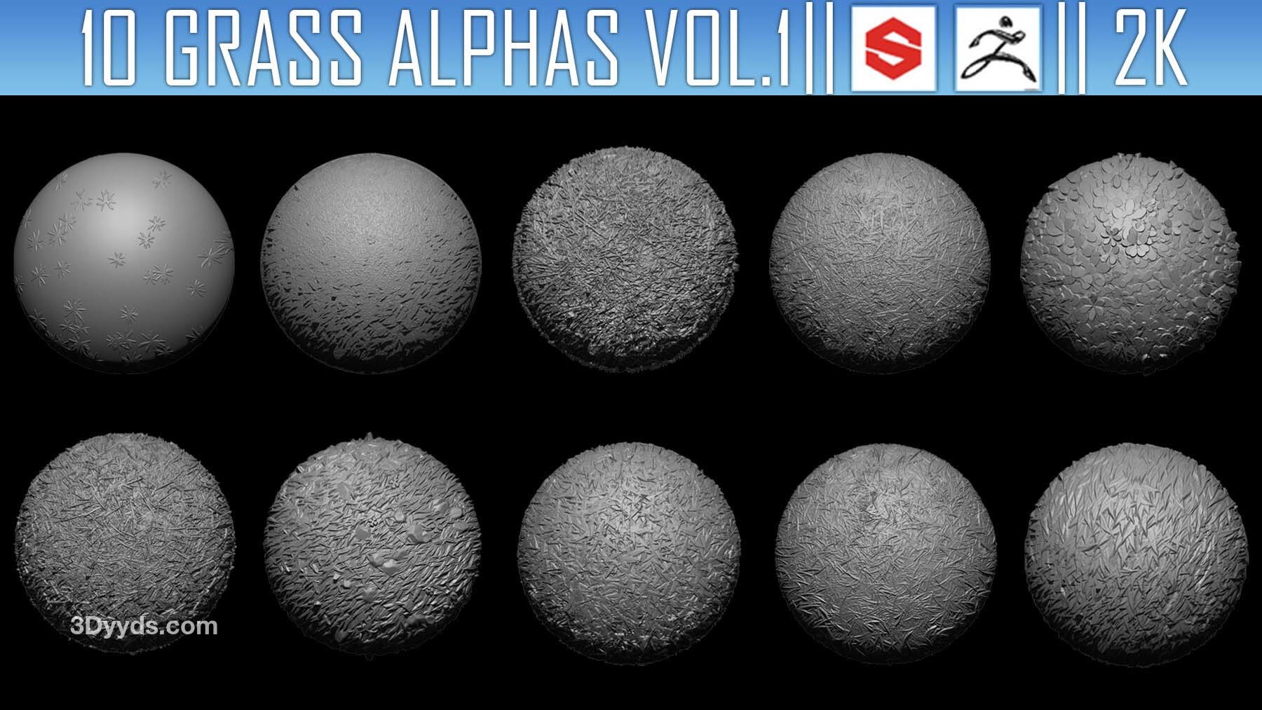 该素材包包含10张Alpha贴图(PNG格式,2K分辨率),可用于在ZBrush、Substance Painter及其他软件中为模型添加草地细节
