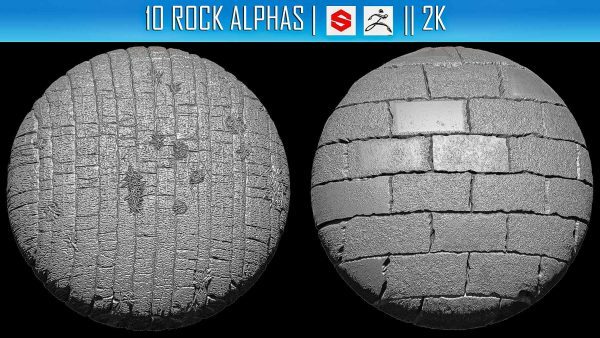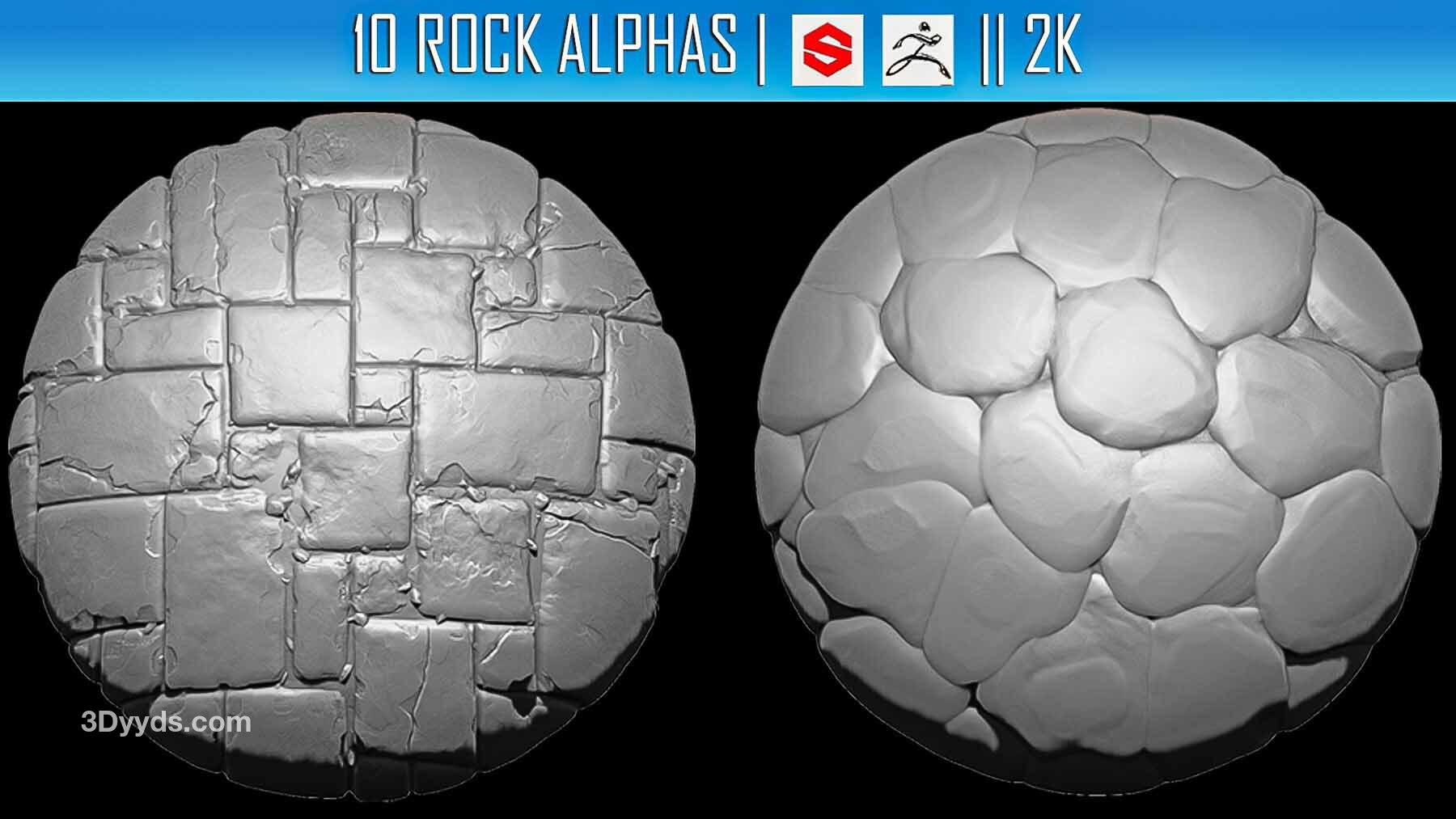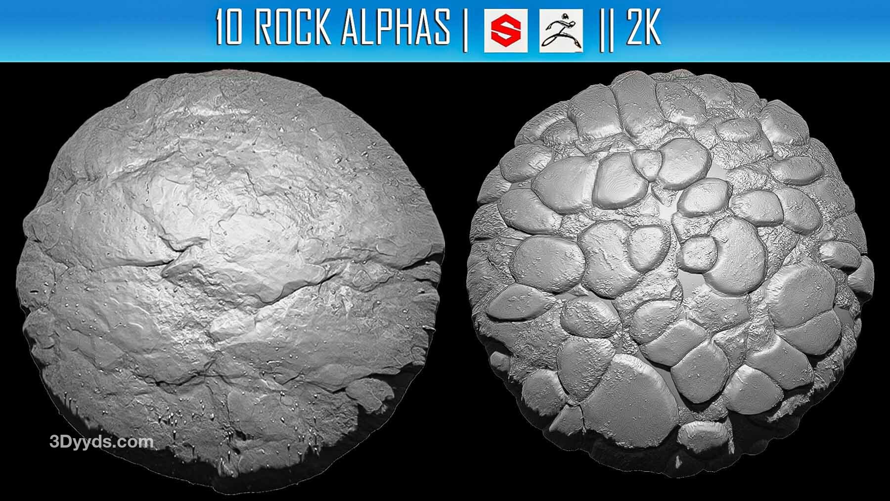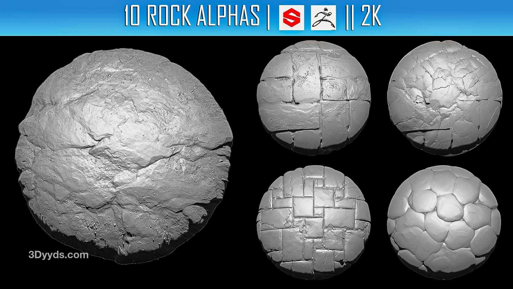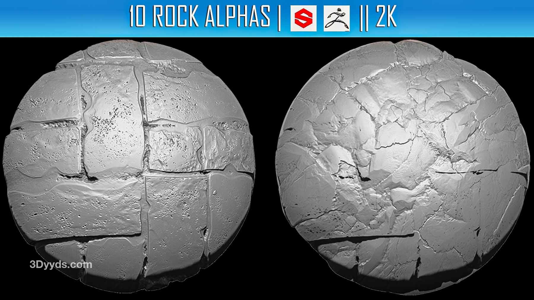 该素材包包含10张岩石Alpha贴图(PNG格式,2K分辨率),可用于在ZBrush、Substance Painter及其他软件中为模型添加岩石细节