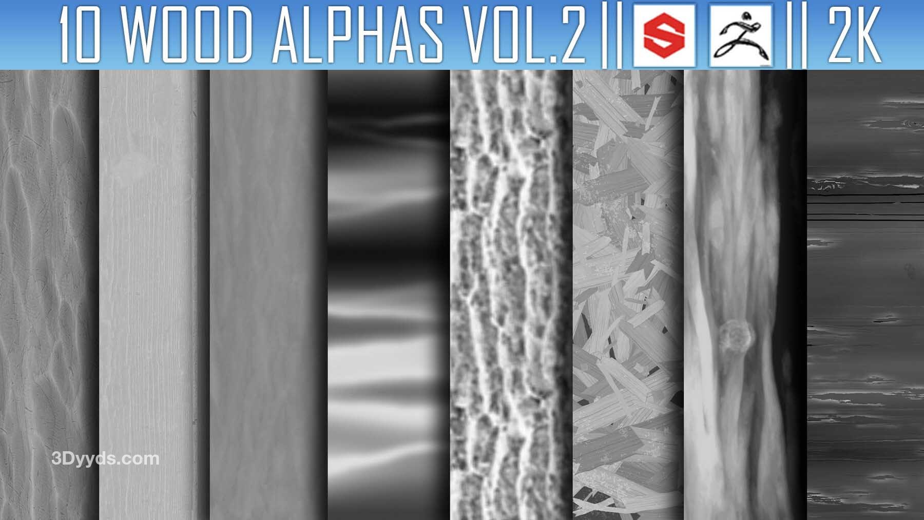 该素材包包含10张Alpha贴图(PNG格式,2K分辨率),可用于在ZBrush、Substance Painter及其他软件中为模型添加木材细节