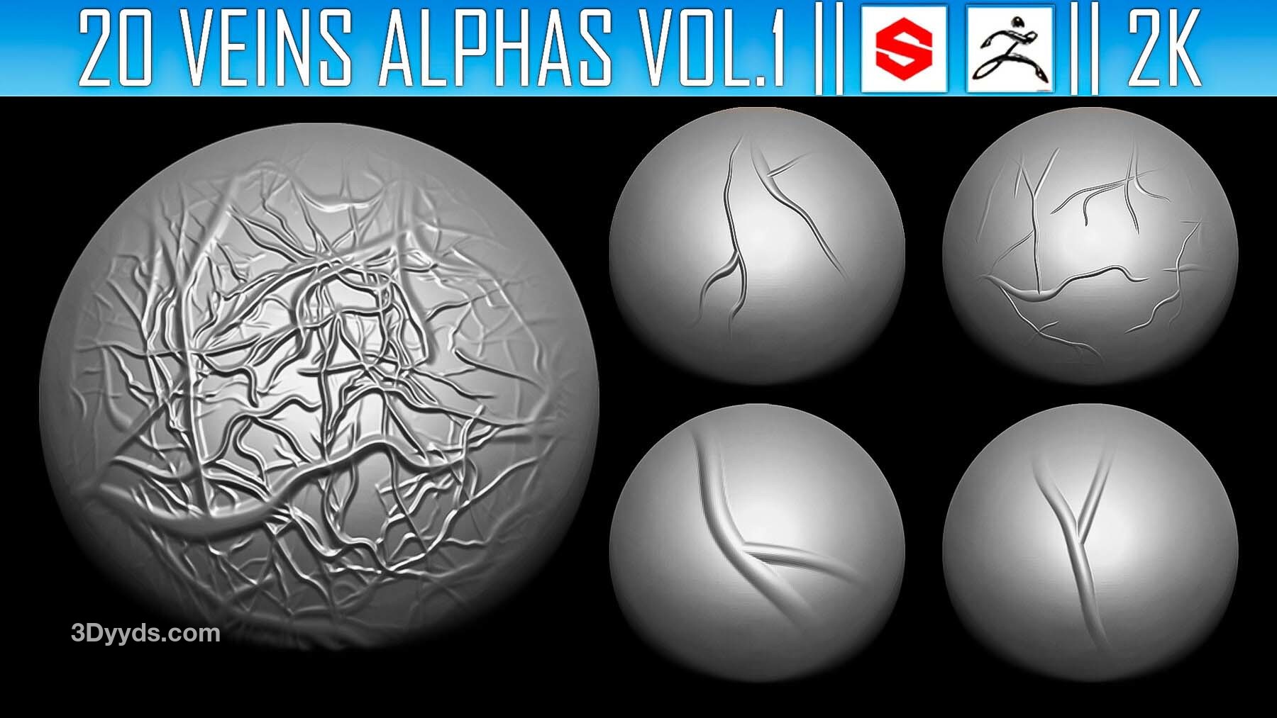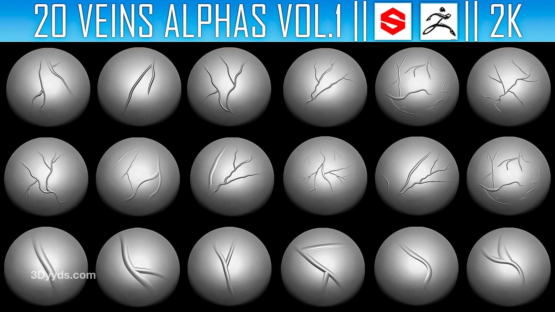 该素材包包含20张Alpha贴图(PNG格式,2K分辨率),可用于在ZBrush、Substance Painter及其他软件中为模型添加血管细节
