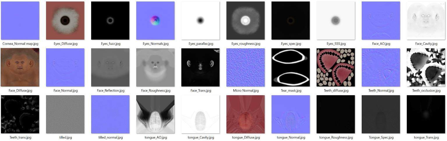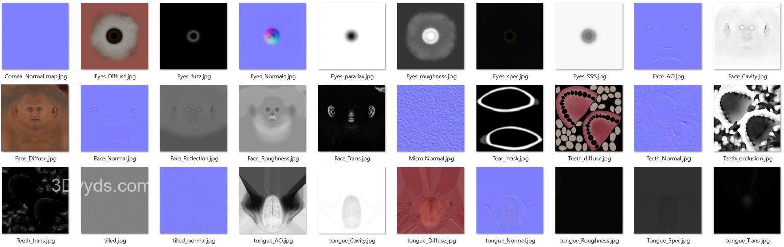 - 1 个包含头部、睫毛、眉毛、眼球、牙齿和舌头的 7 个细分级别的 Zbrush 工具(需要最新版本的 Zbrush)