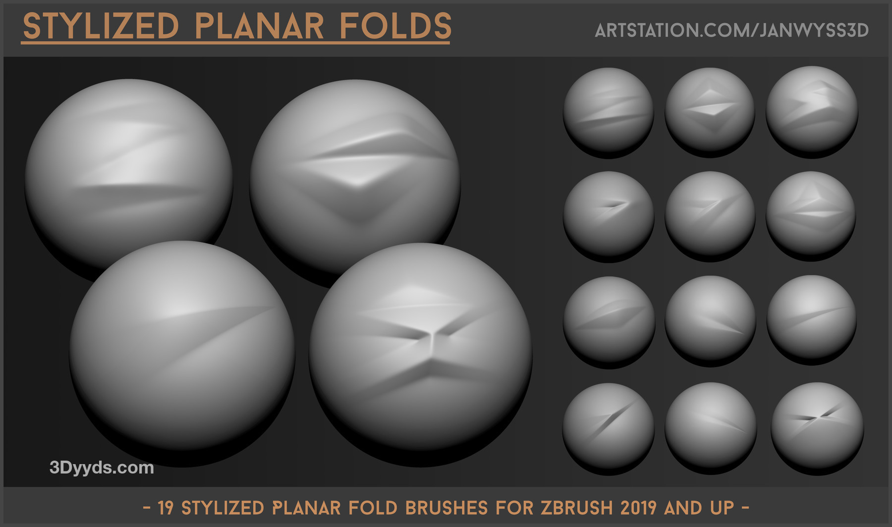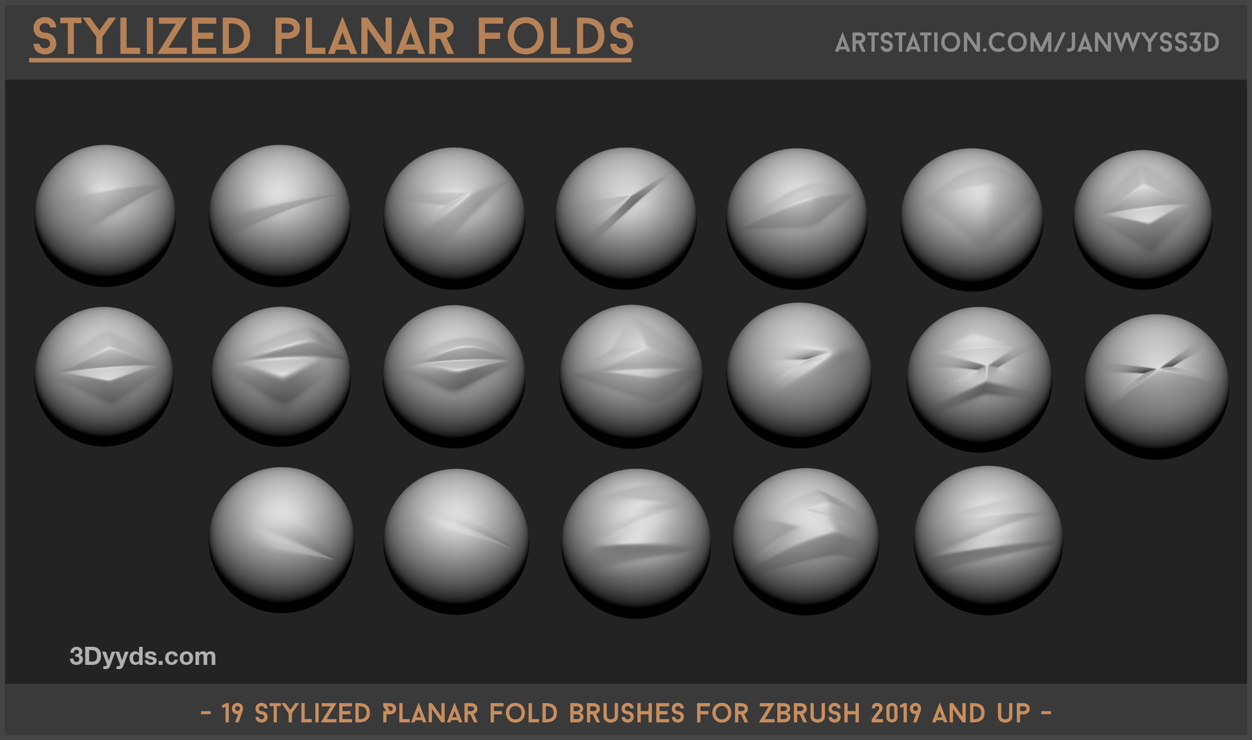 19 种风格化的平面折叠画笔,适用于 Zbrush 2019 及更高版本。