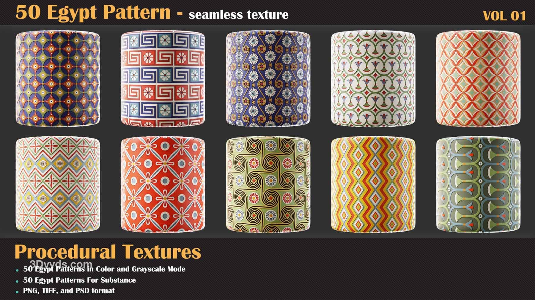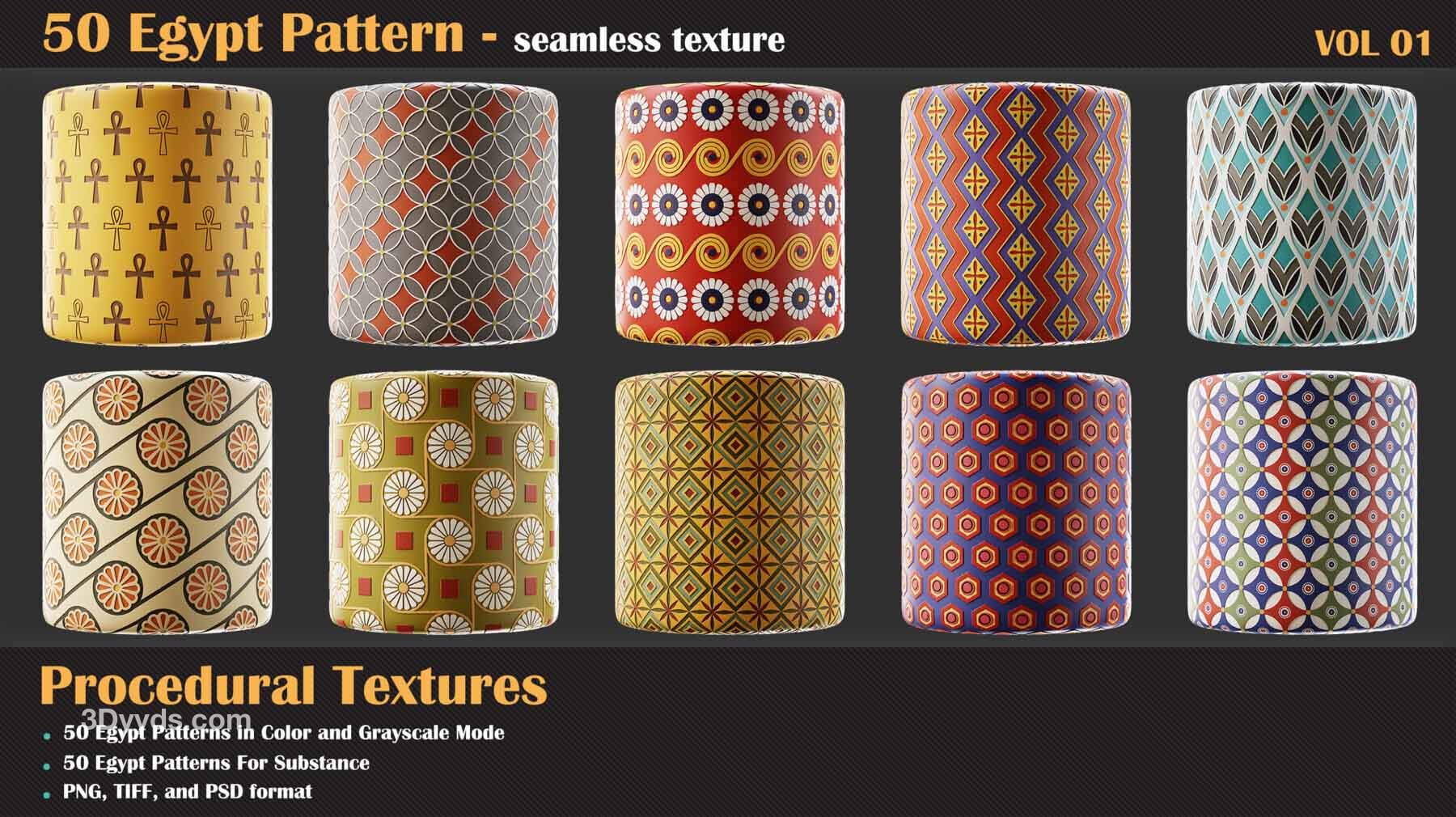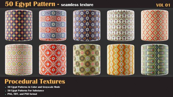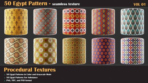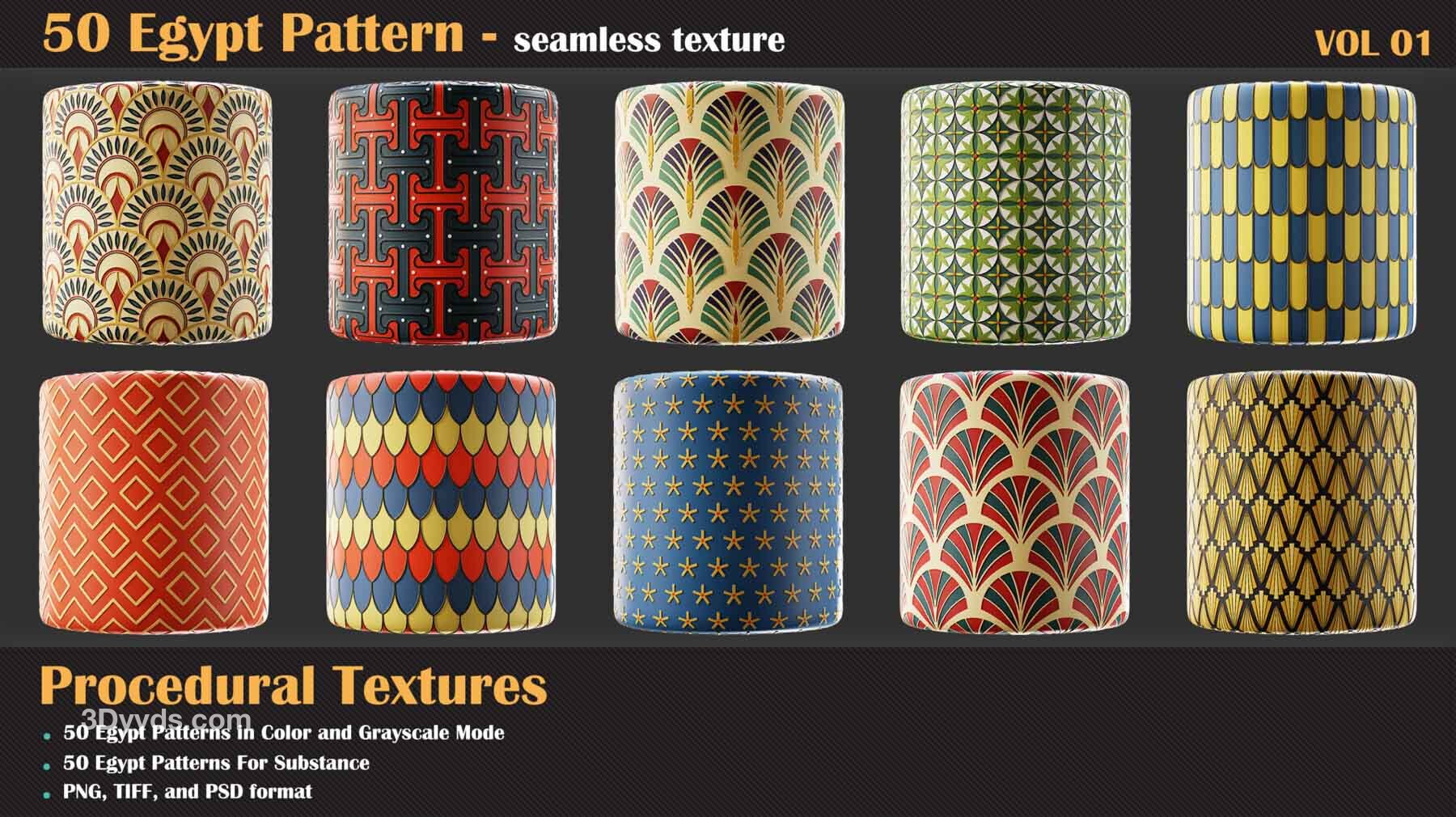 我们为您收集了 50 个埃及图案在一个包裹中。在这里,您可以找到简单和复杂的埃及风格模式,您可以在您的项目中使用它们。您可以在不同的工作流程和软件中使用这些映射作为基础或主要模式。 您将获得 :