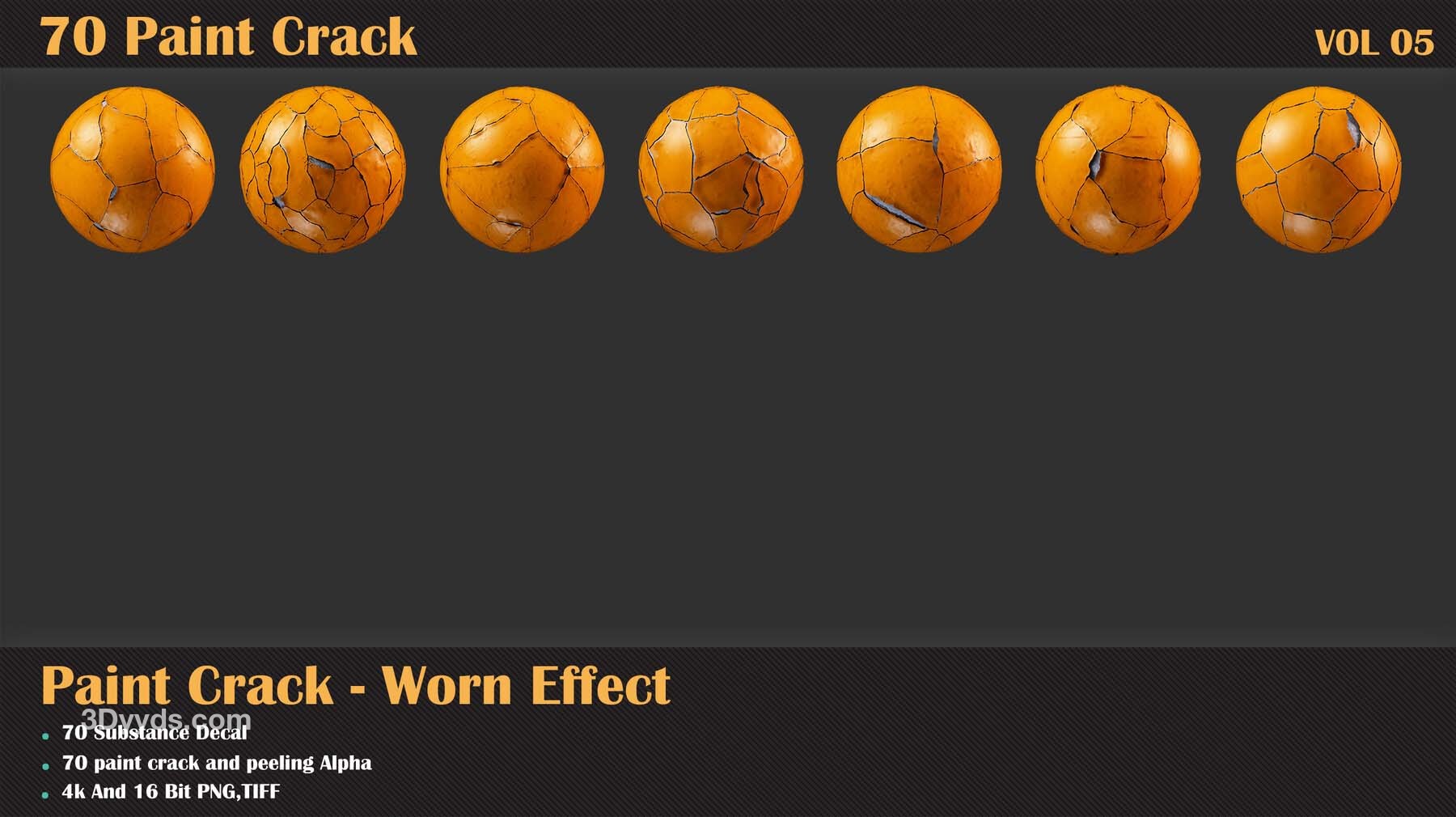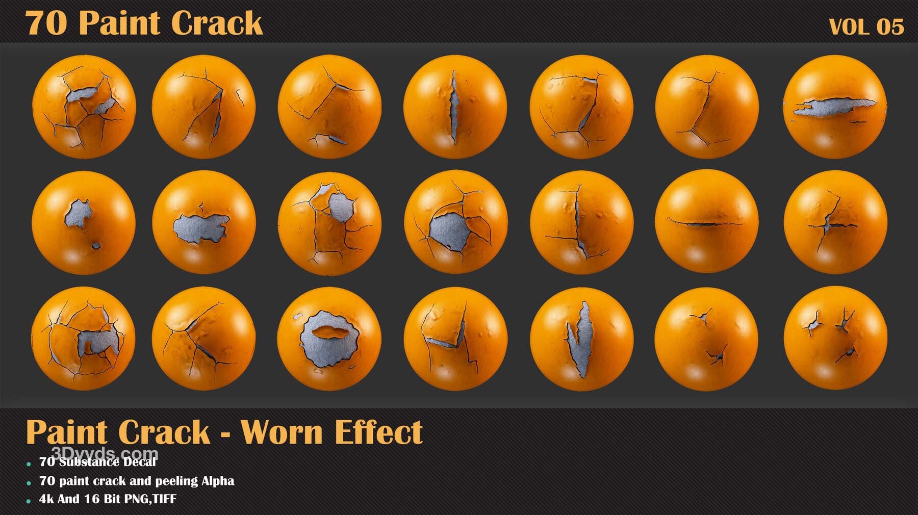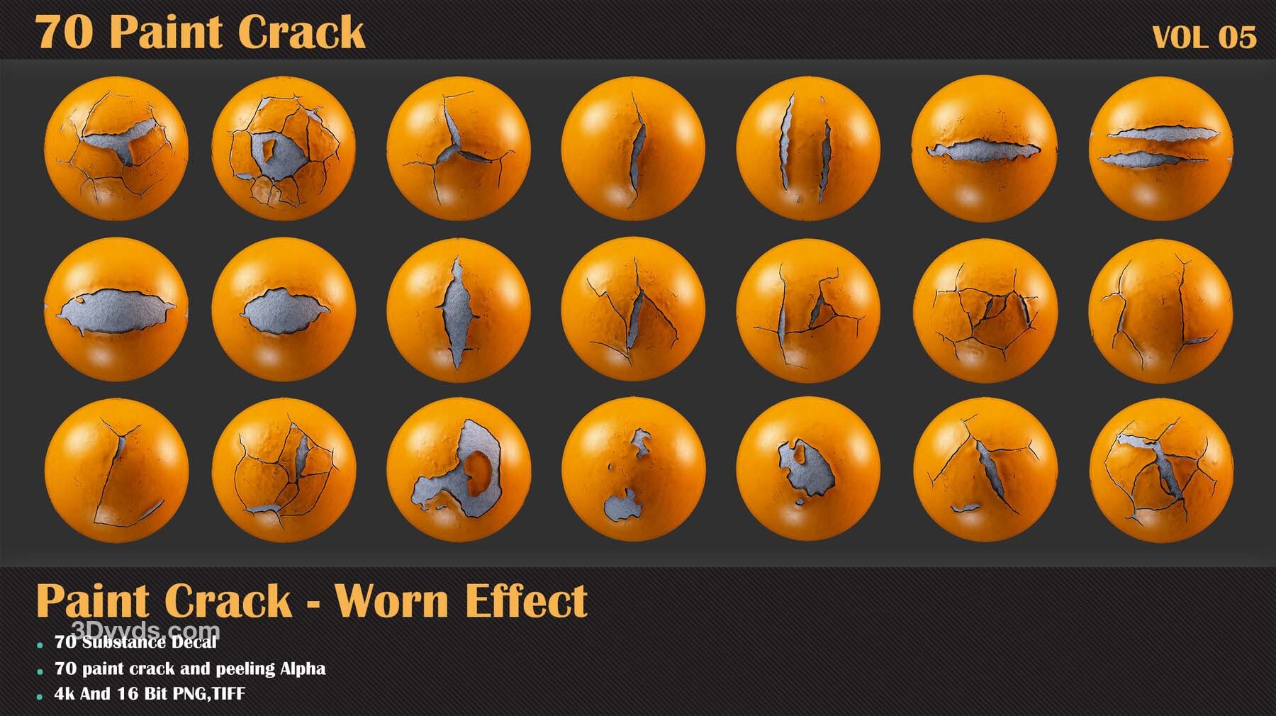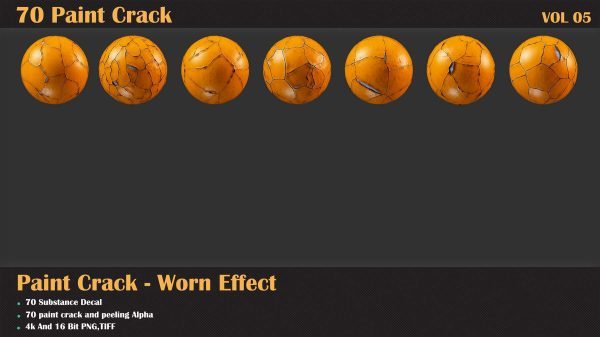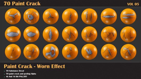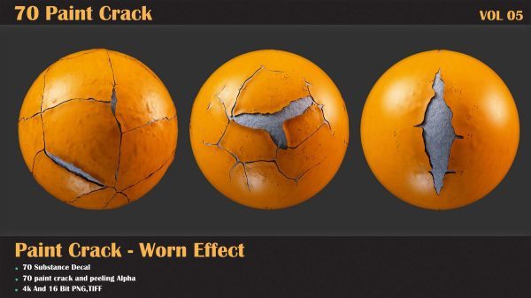 60 个单一 + 10 个无缝油漆剥落效果贴花,适用于 Substance Painter