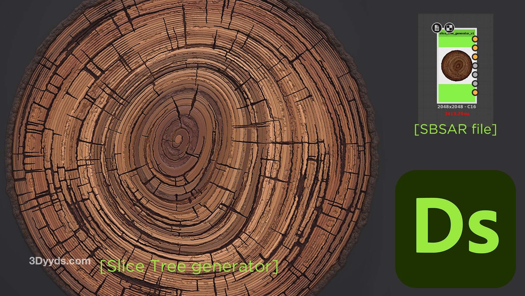 切片树生成器。SBSAR 文件。输出 BaseColor、Normal、Roughness、AmbientOclusion、Height 和 Mask。为您的树桩派上用场