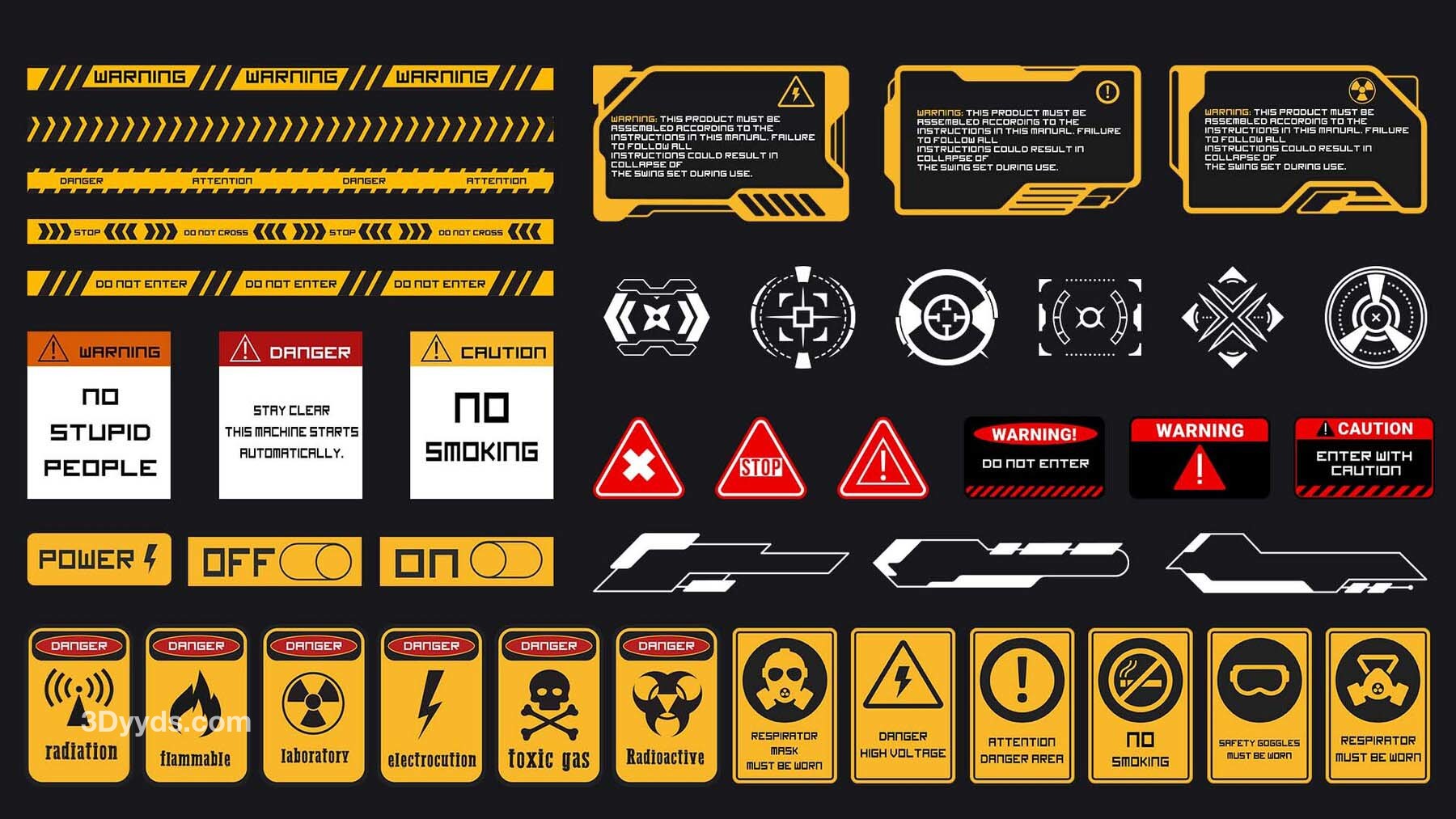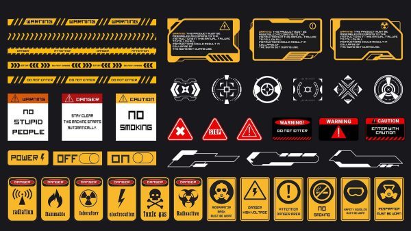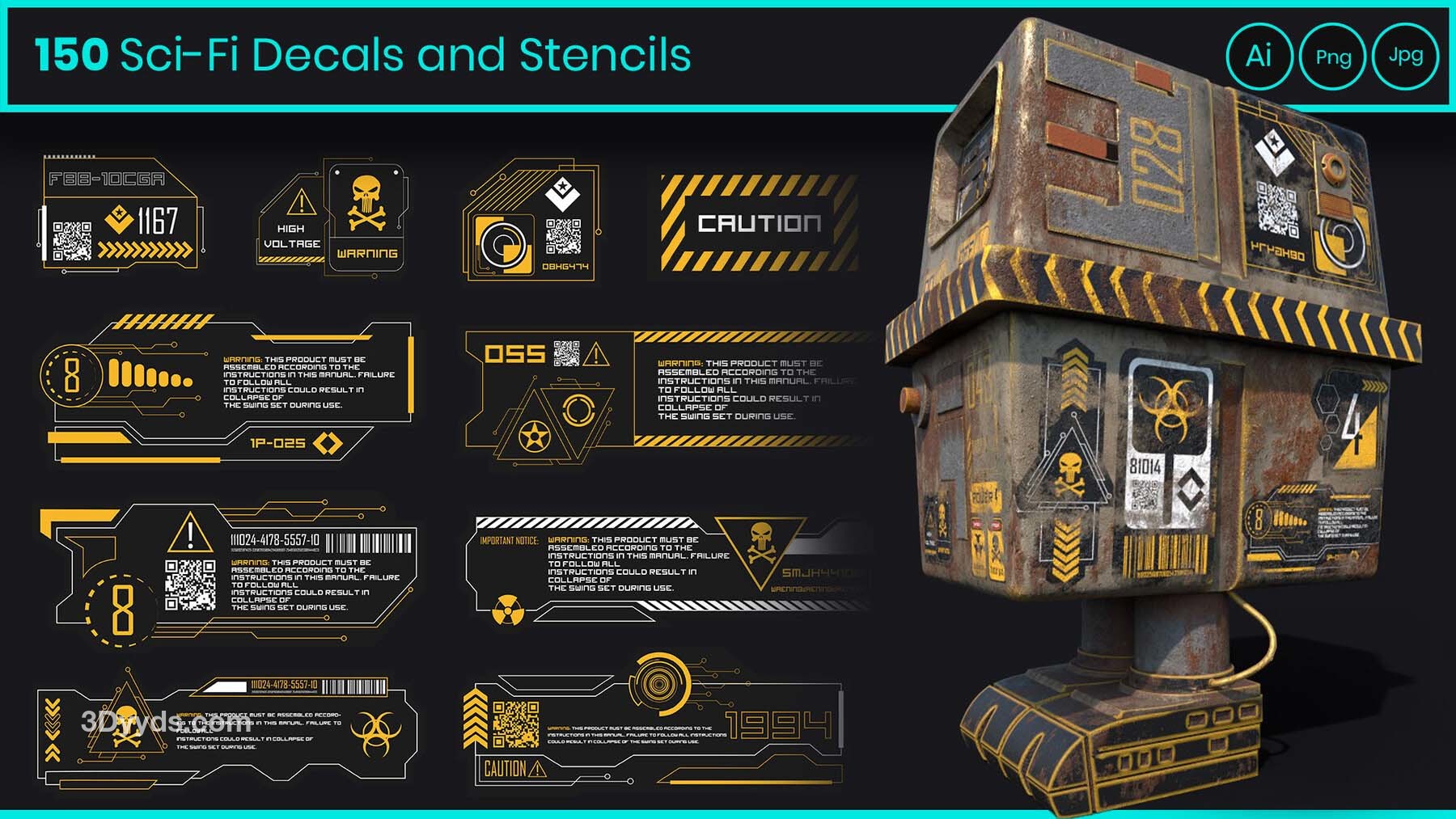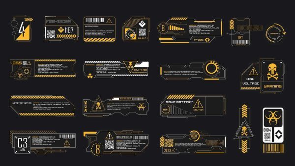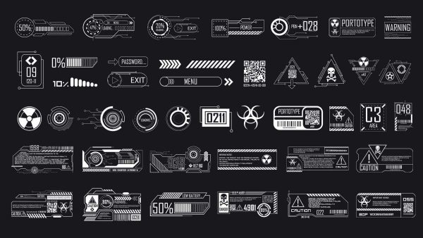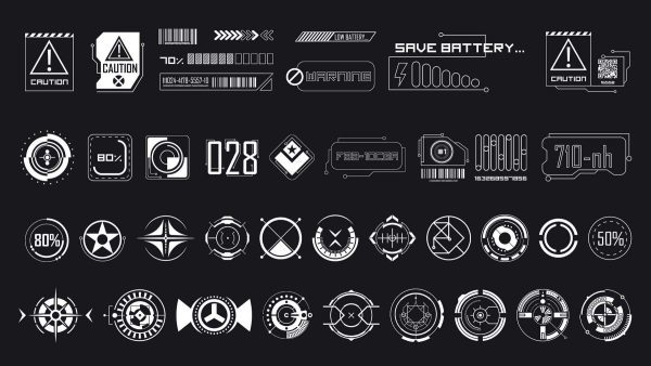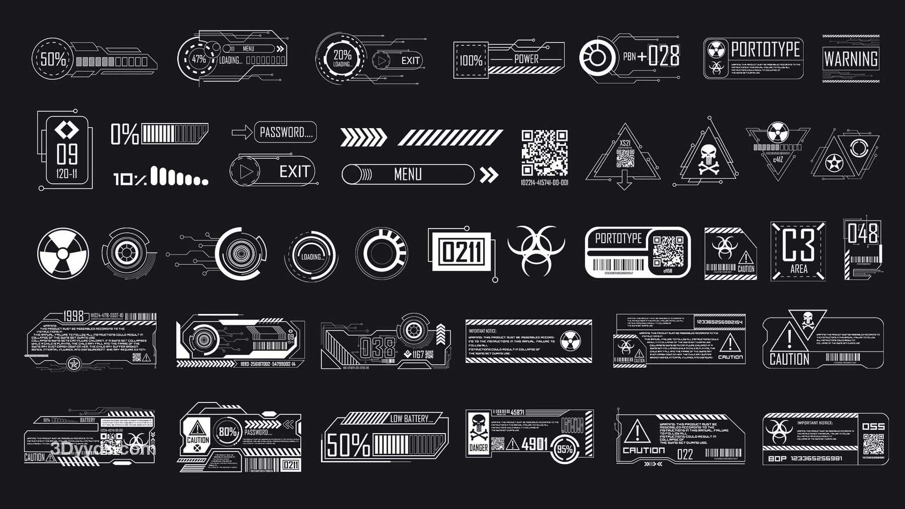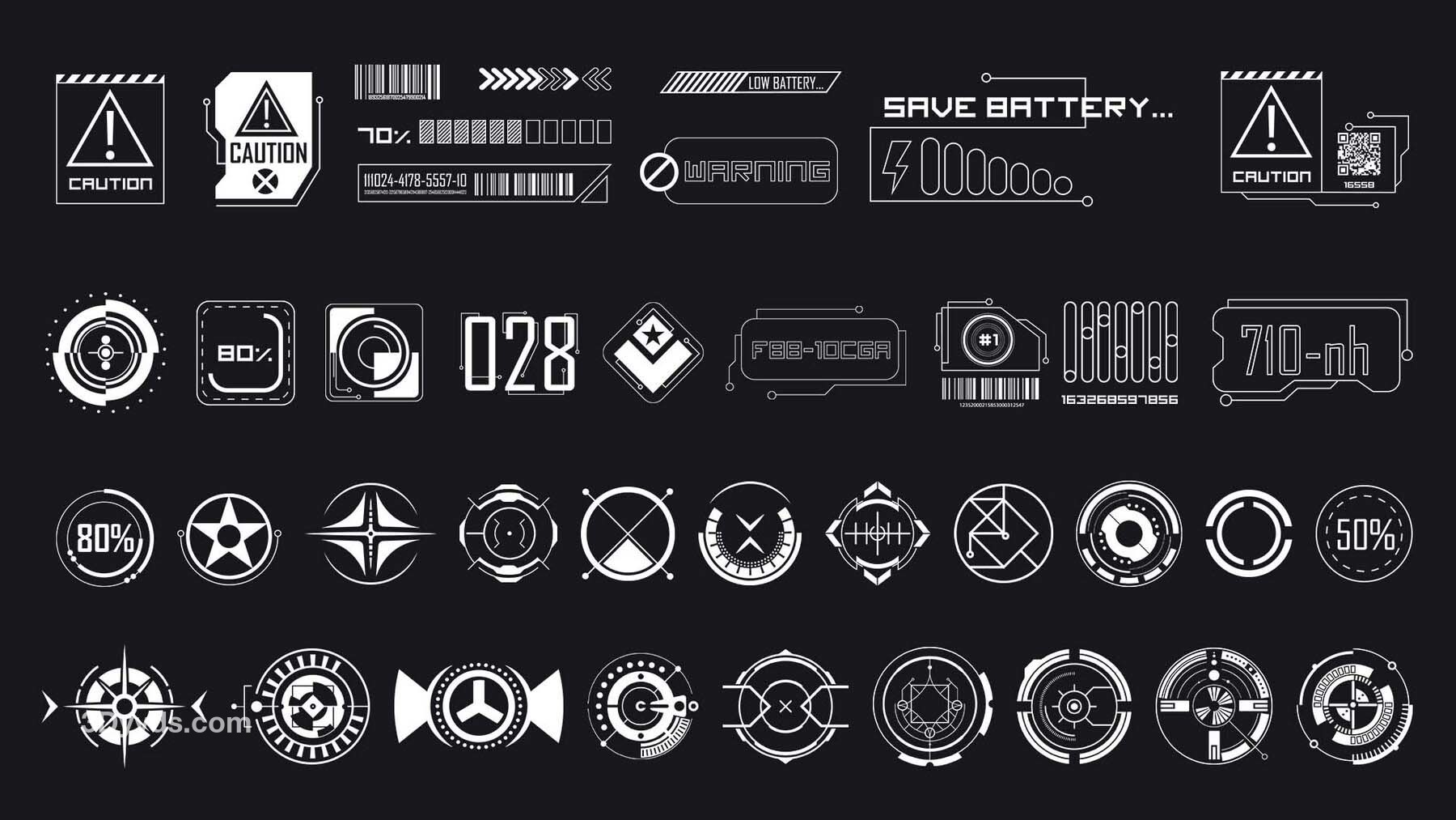 这是一套150个科幻贴纸和模板,适用于2D或3D艺术作品,包括标志、符号、图标、基本形状、科幻工业标志、科技与科学形状、信息贴纸、模板、海报和阿尔法