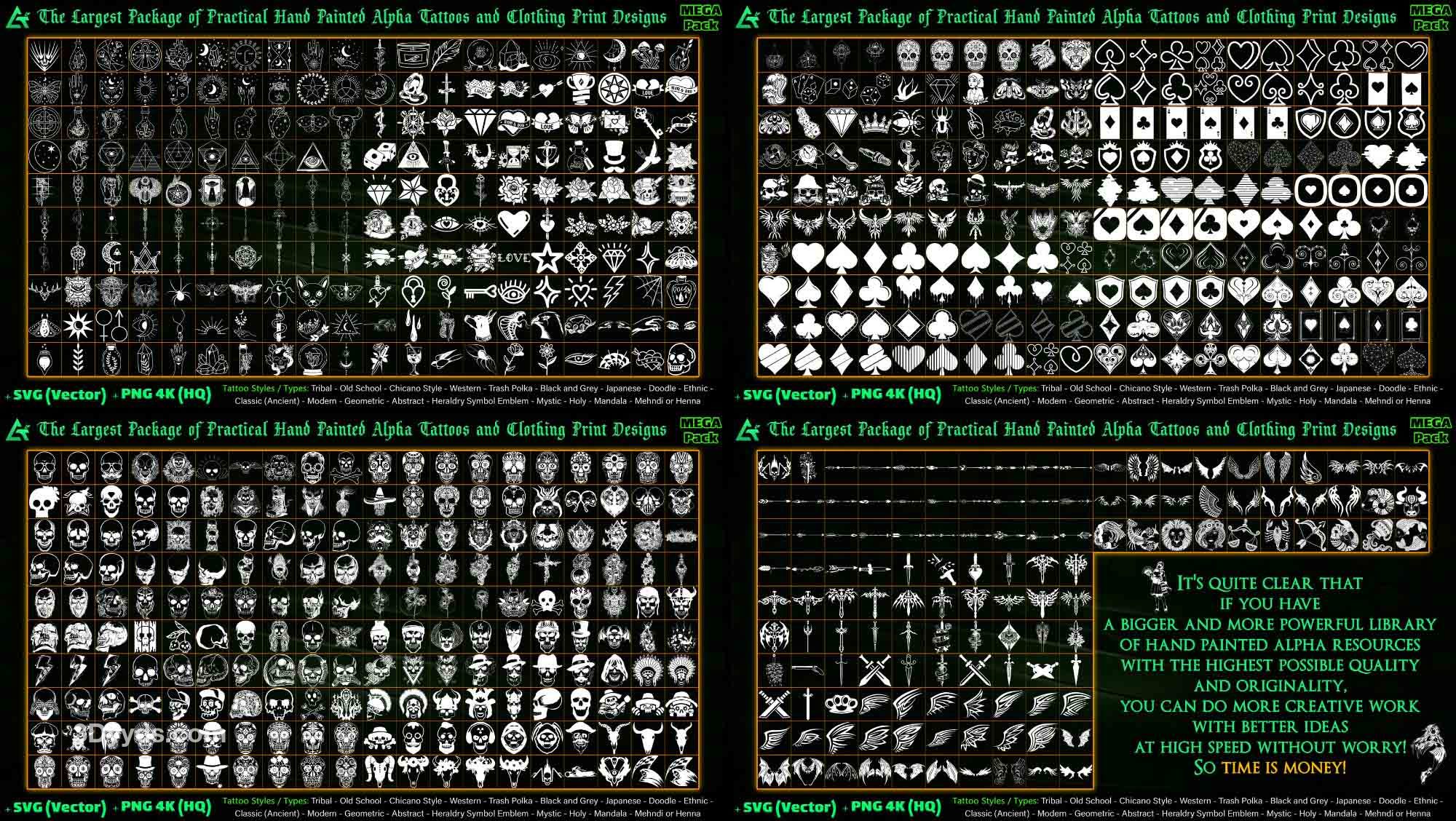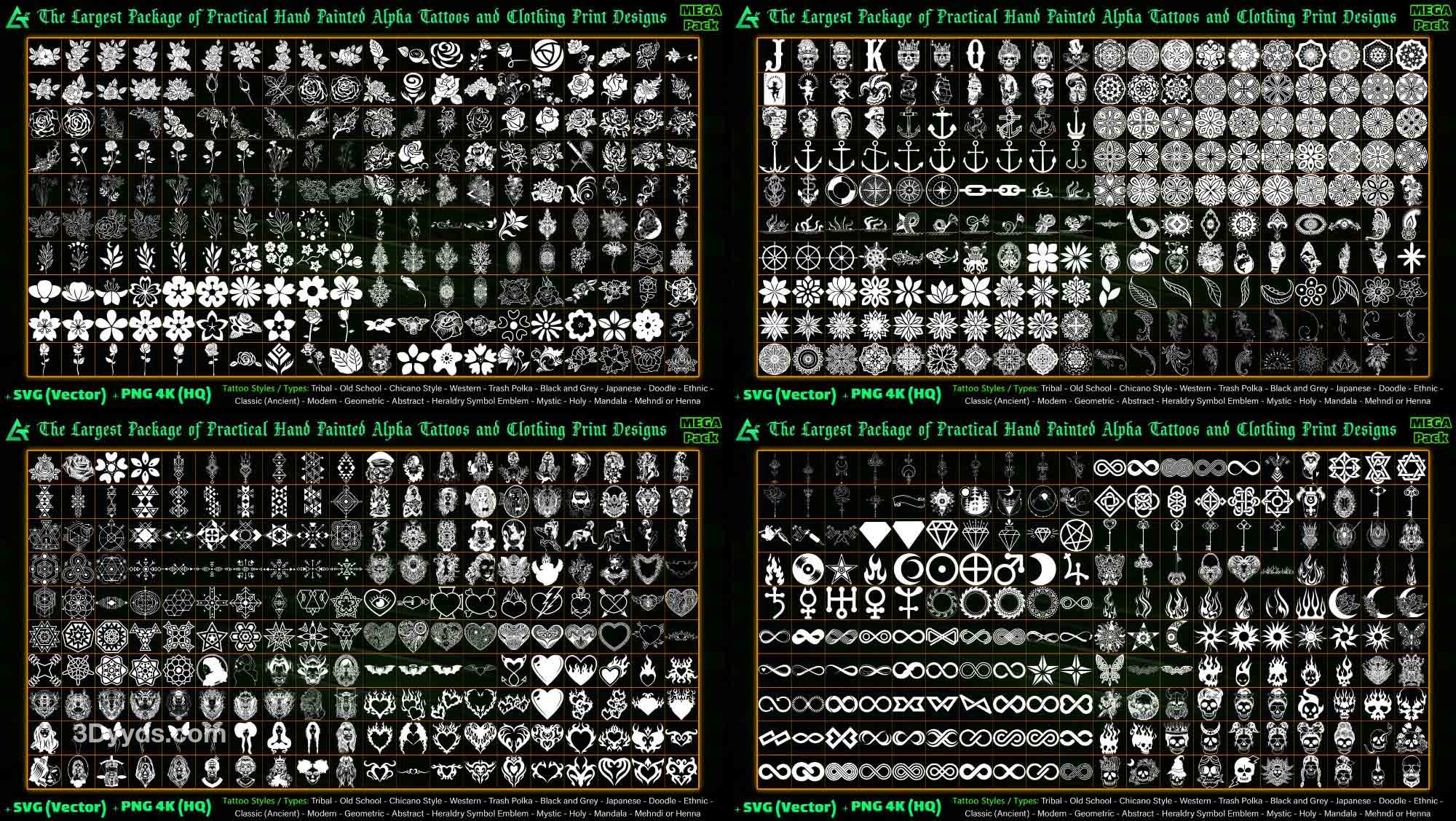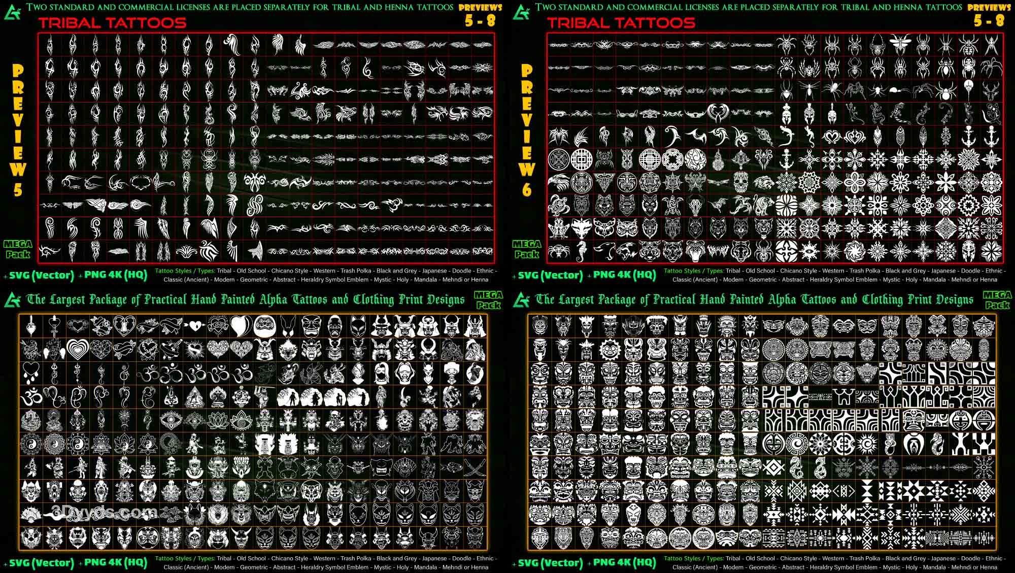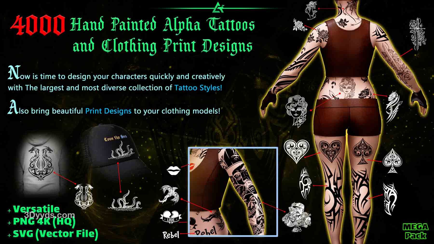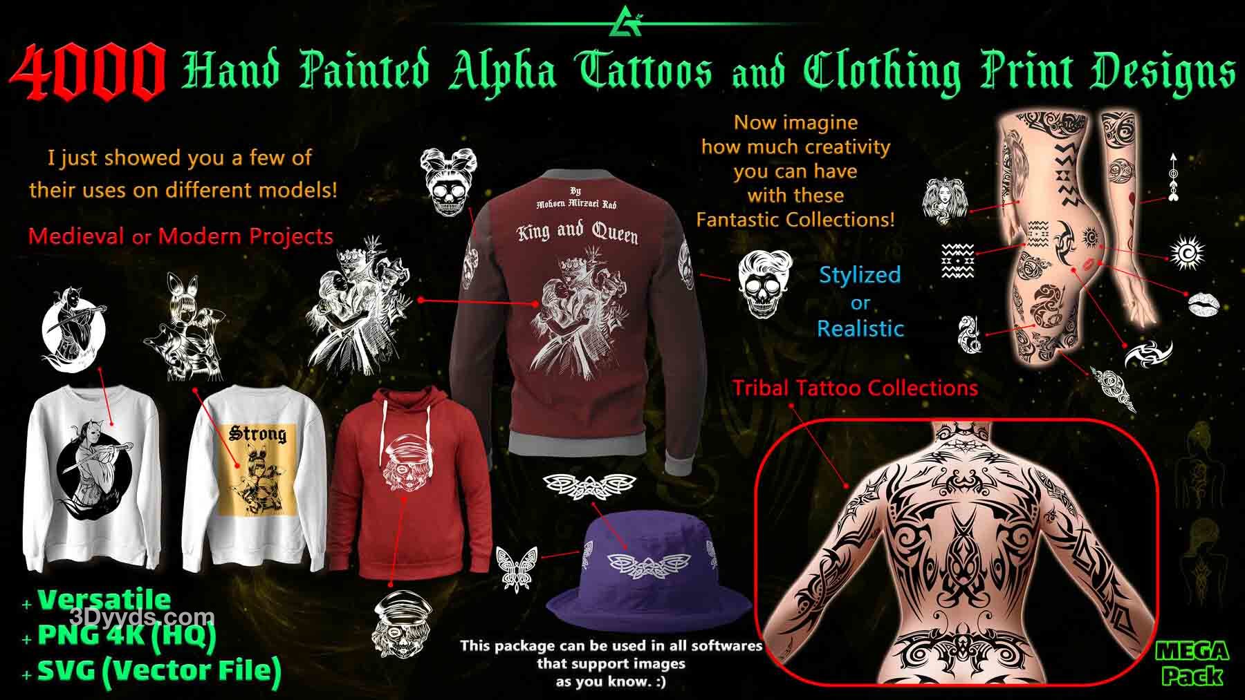 - 4000个手绘阿尔法纹身和服装印花设计(50个阿尔法是免费部分)包含:~