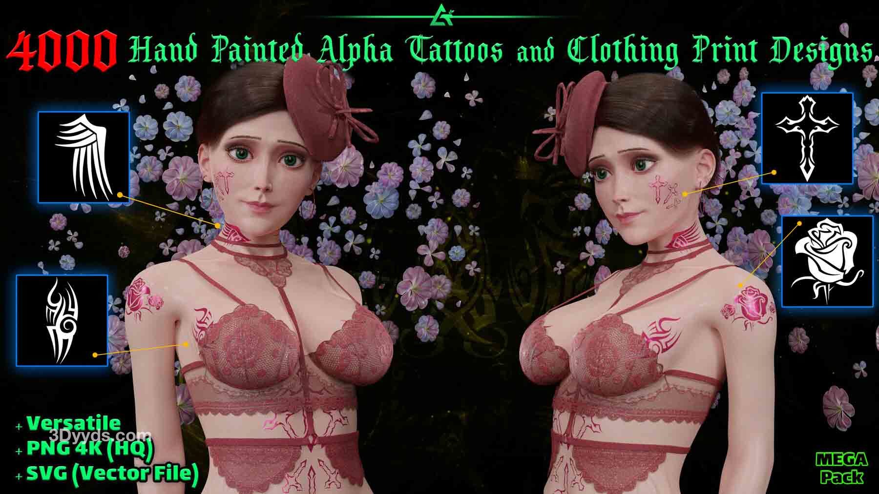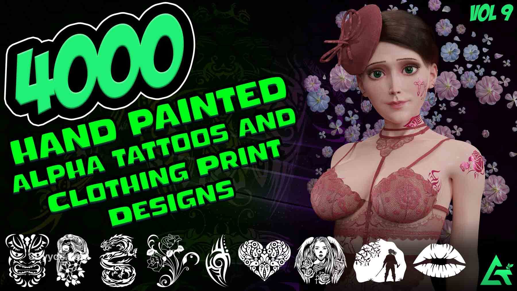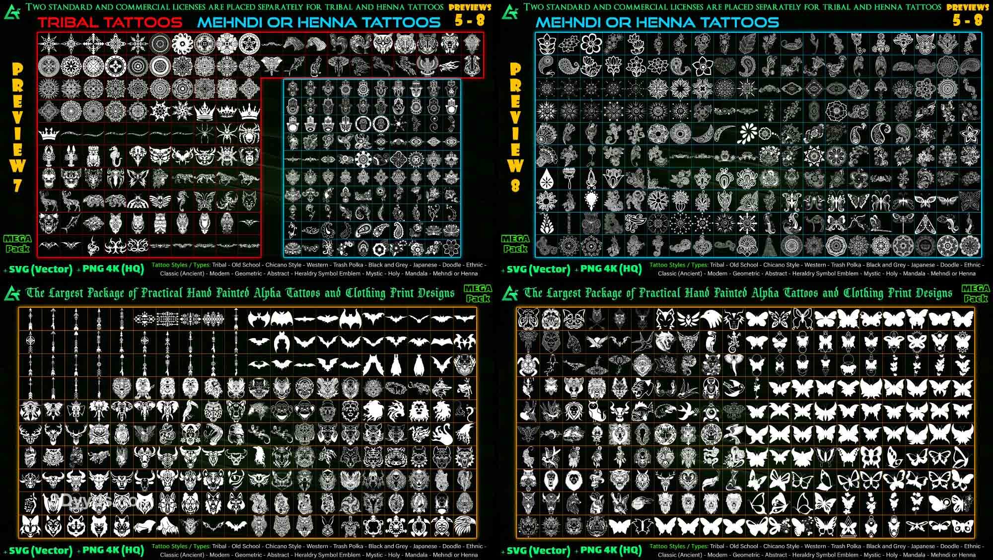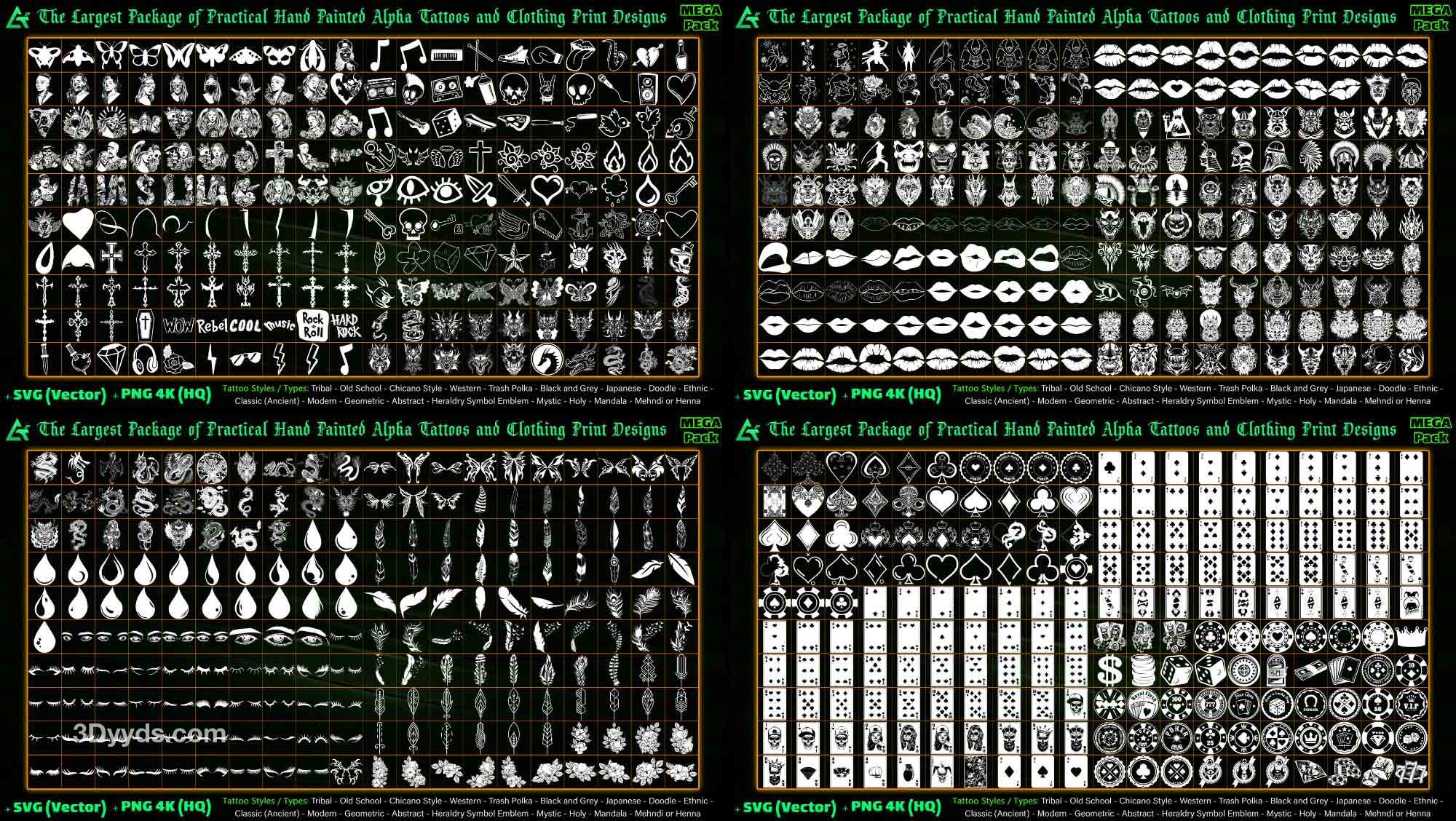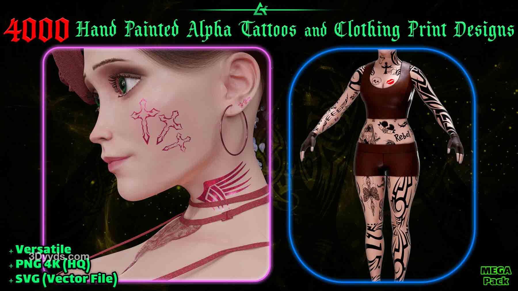- 4000个手绘阿尔法纹身和服装印花设计(50个阿尔法是免费部分)包含:~