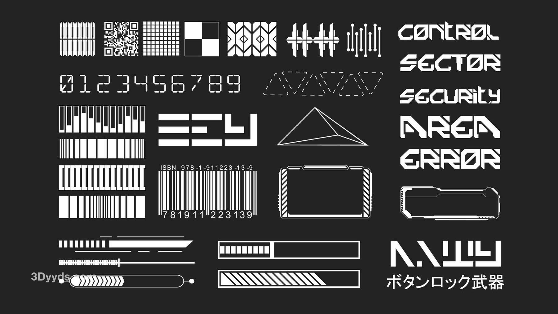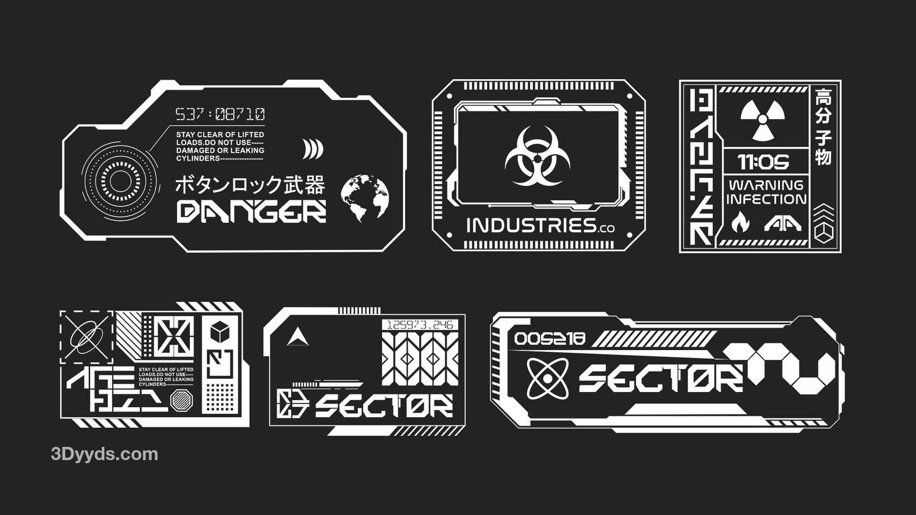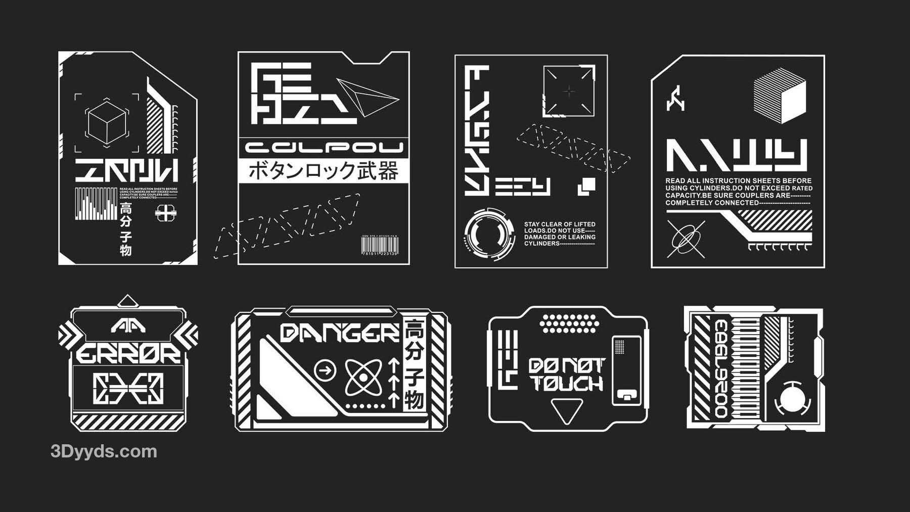 这是一套150个科幻贴纸和阿尔法用于2D或3D艺术作品,包括标志、符号、图标、基本形状、工业和科幻标志、科技和科学形状、信息贴纸、海报和阿尔法