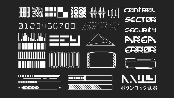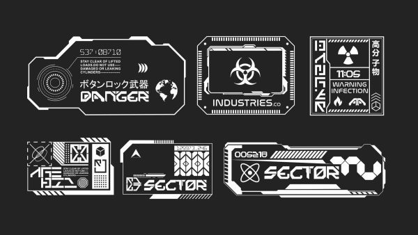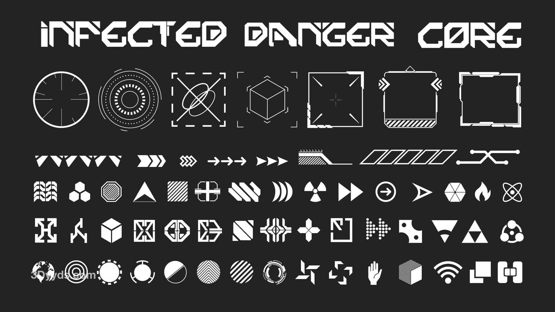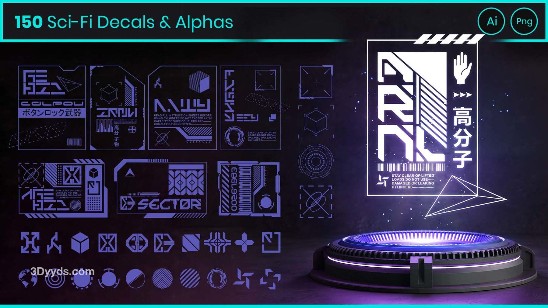 这是一套150个科幻贴纸和阿尔法用于2D或3D艺术作品,包括标志、符号、图标、基本形状、工业和科幻标志、科技和科学形状、信息贴纸、海报和阿尔法