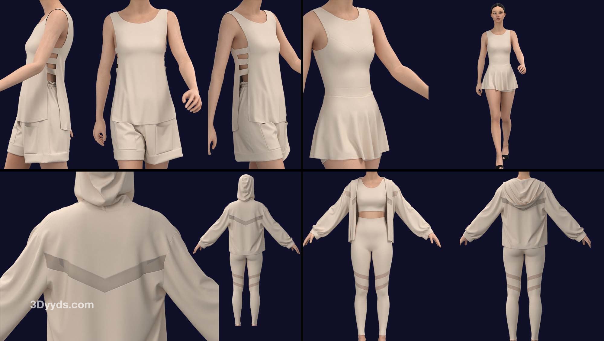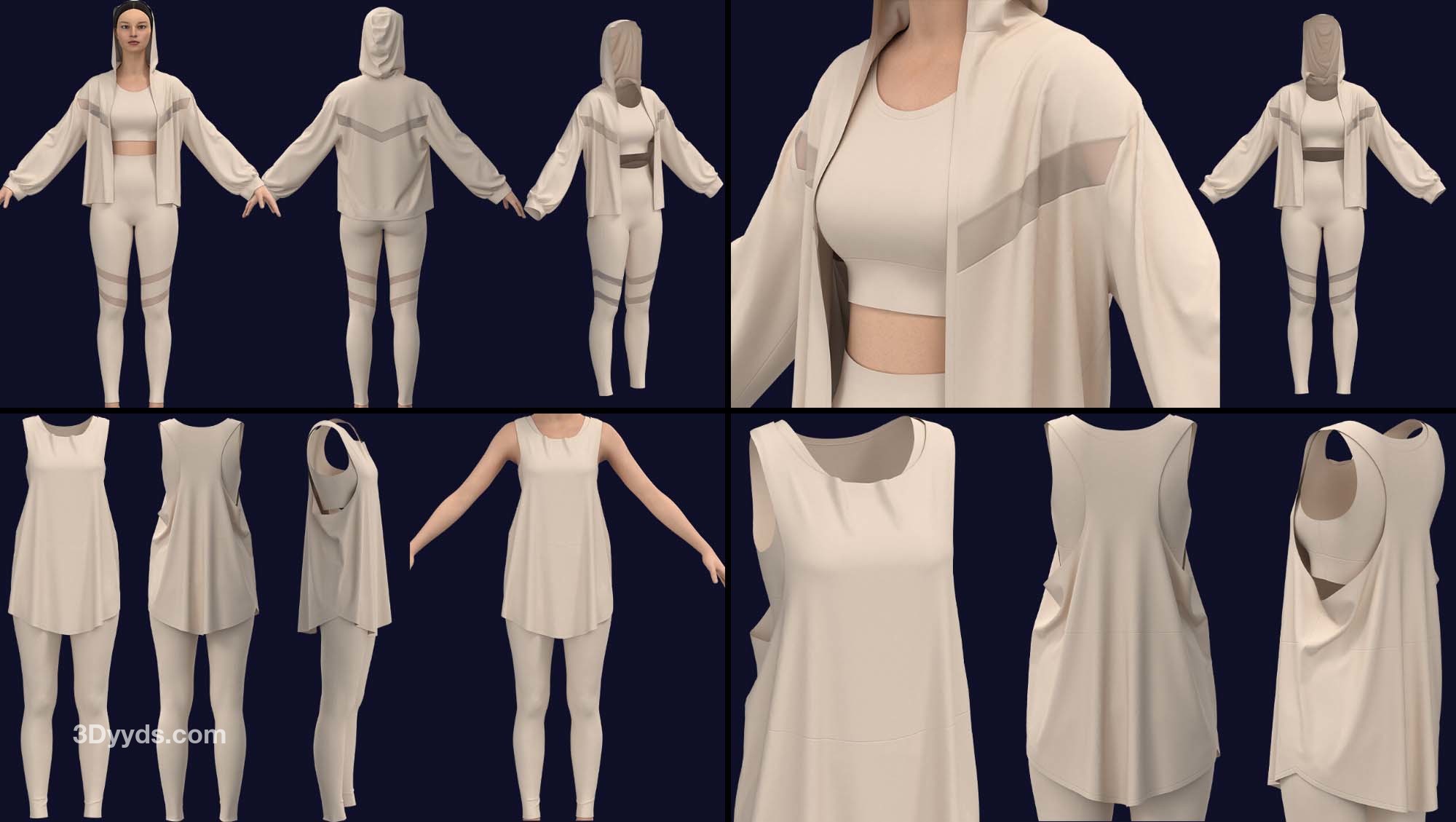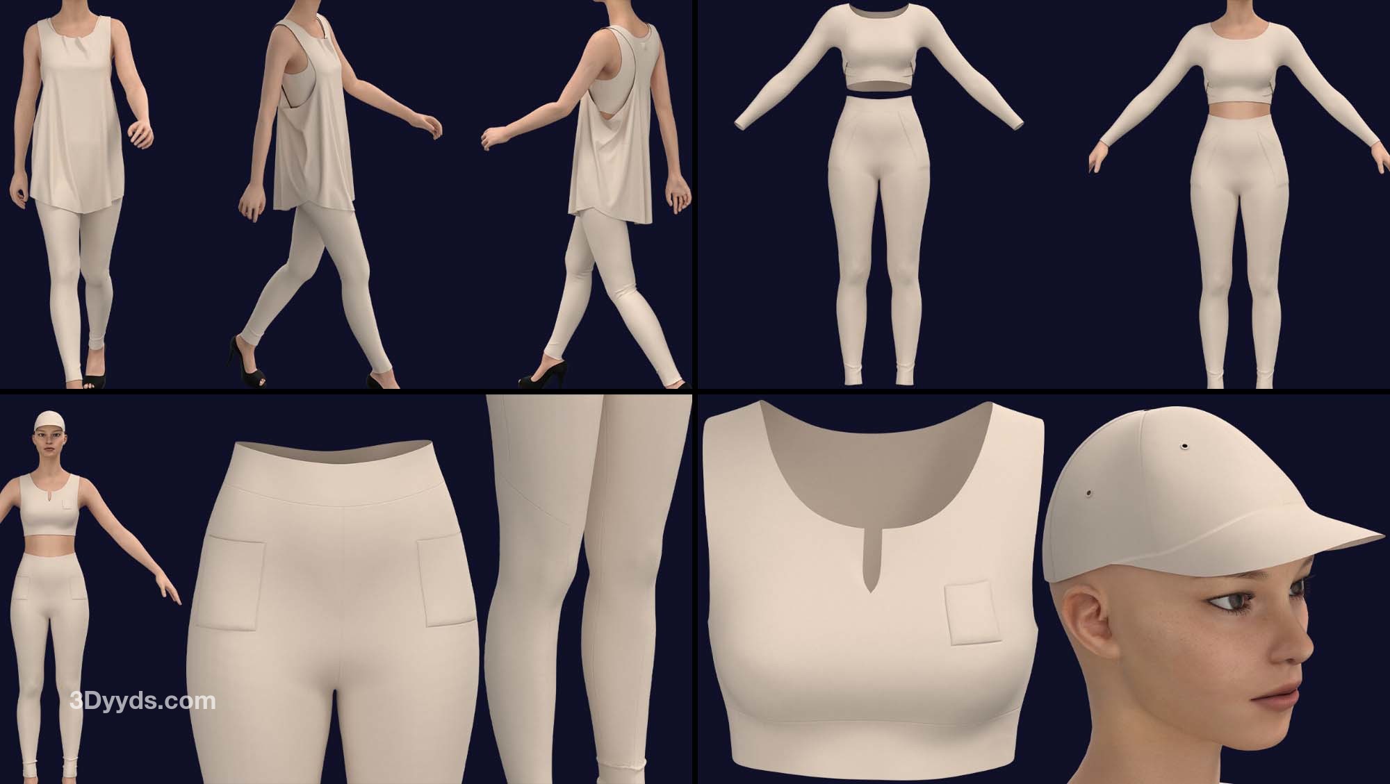 在这个包中,我们准备了 10 款基本款式的女式运动服(在 clo3d 版本 6.2.234 中设计):