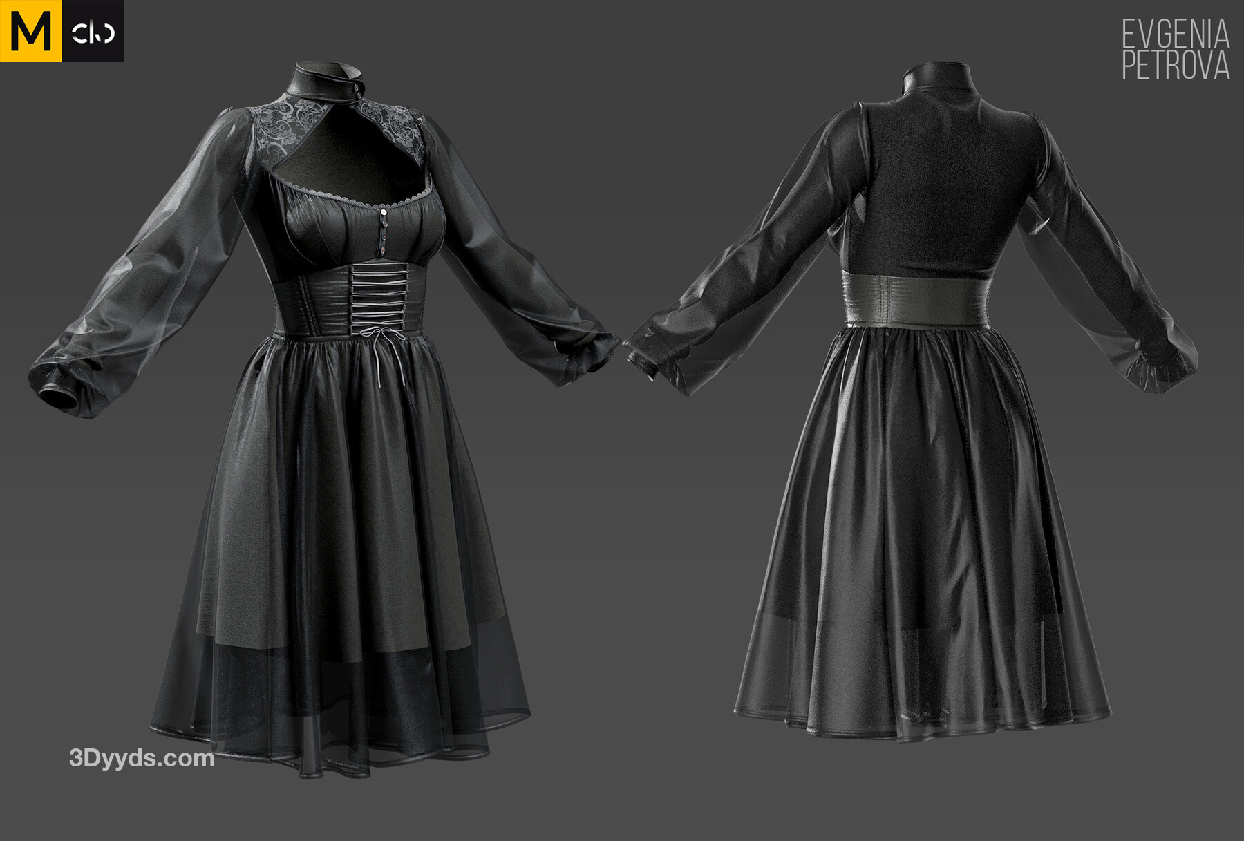 深色连衣裙。Marvelous Designer Clo3d 项目 + OBJ
