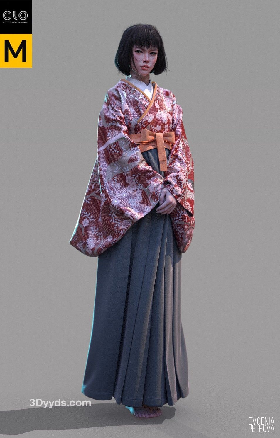 MD349日式少女袴褶和服亚洲古装服装zprj模型OBJ