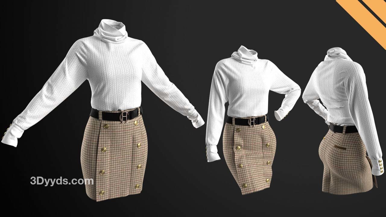 MD374-CLO3D复古女装高领毛线衣铅笔裙3D模型zprj服装OBJ