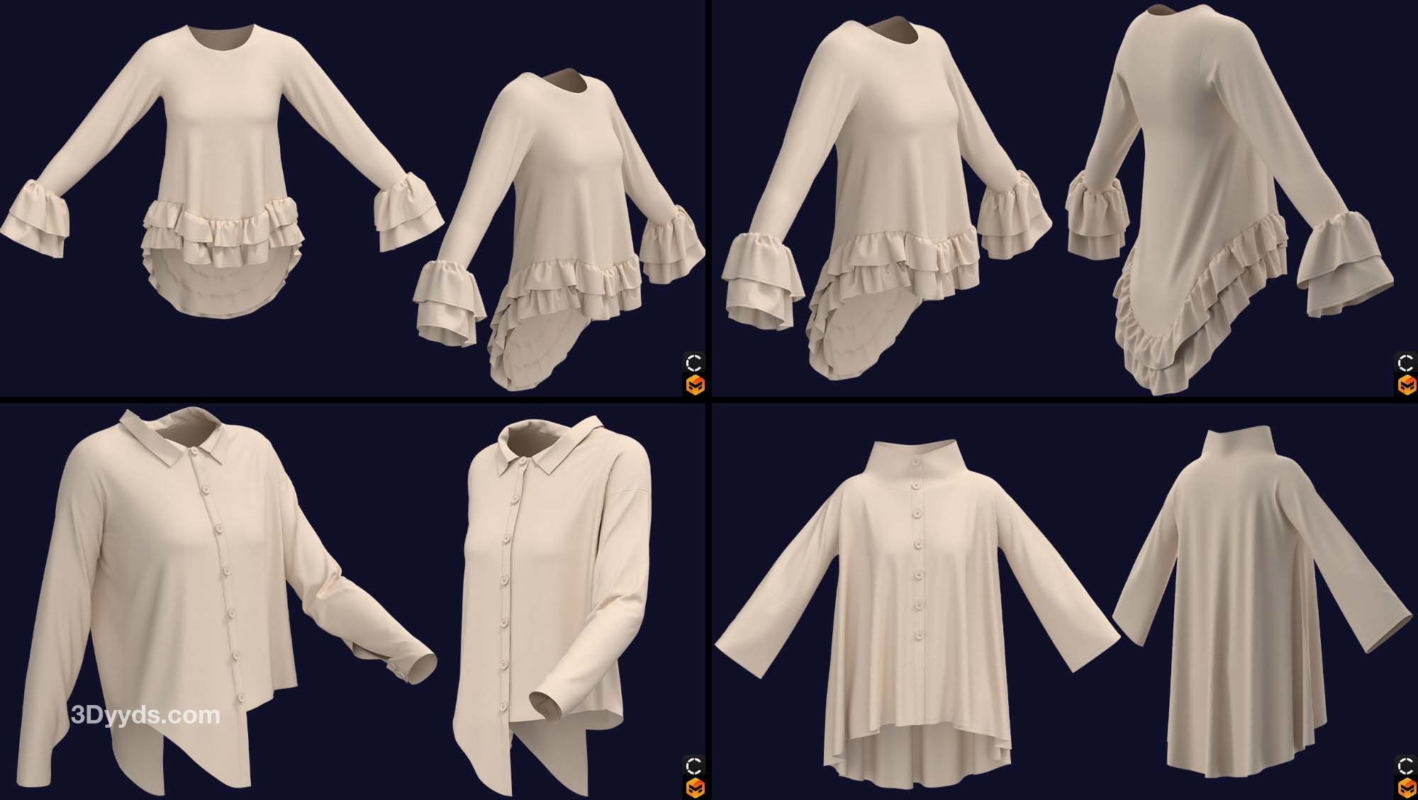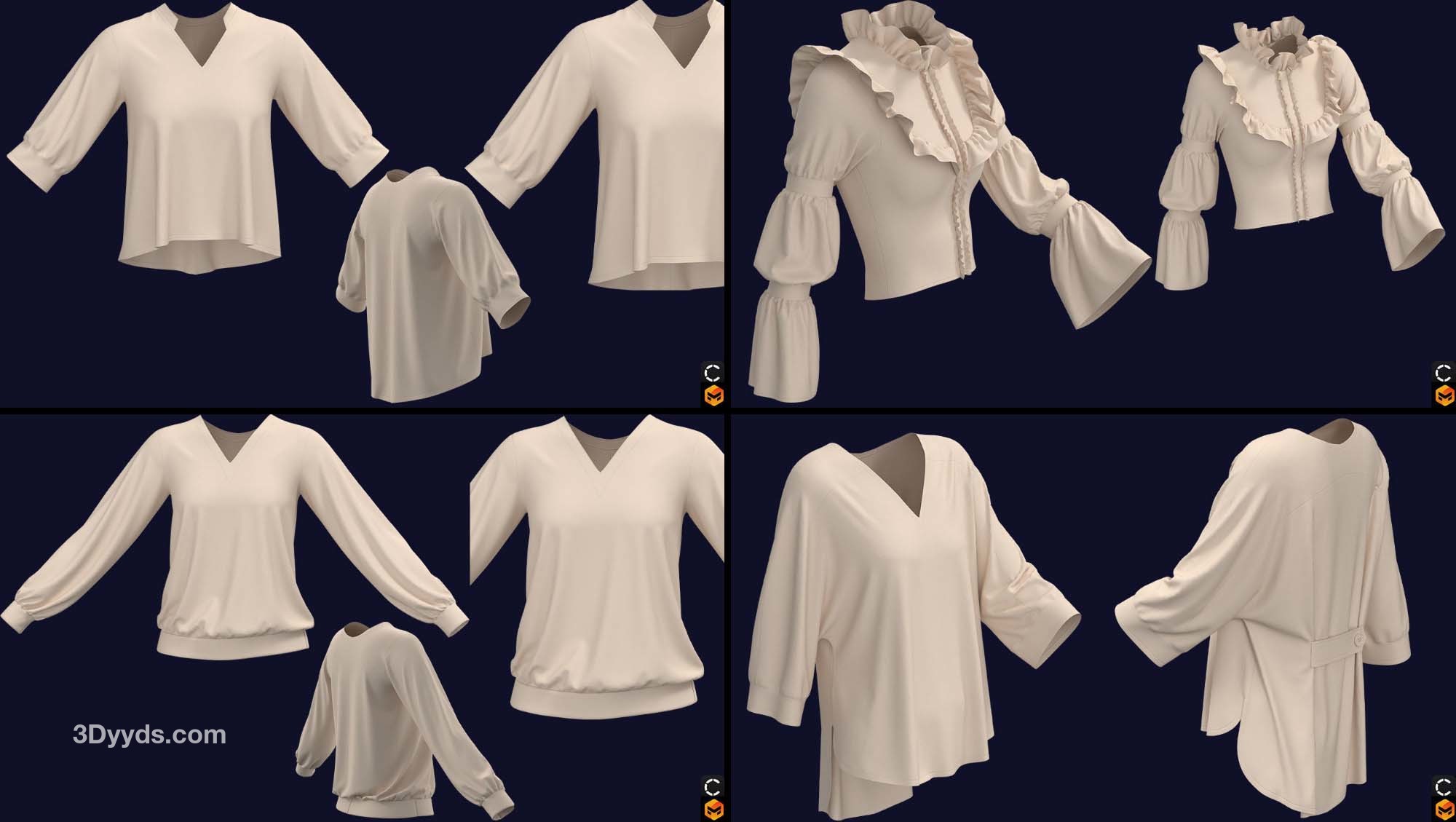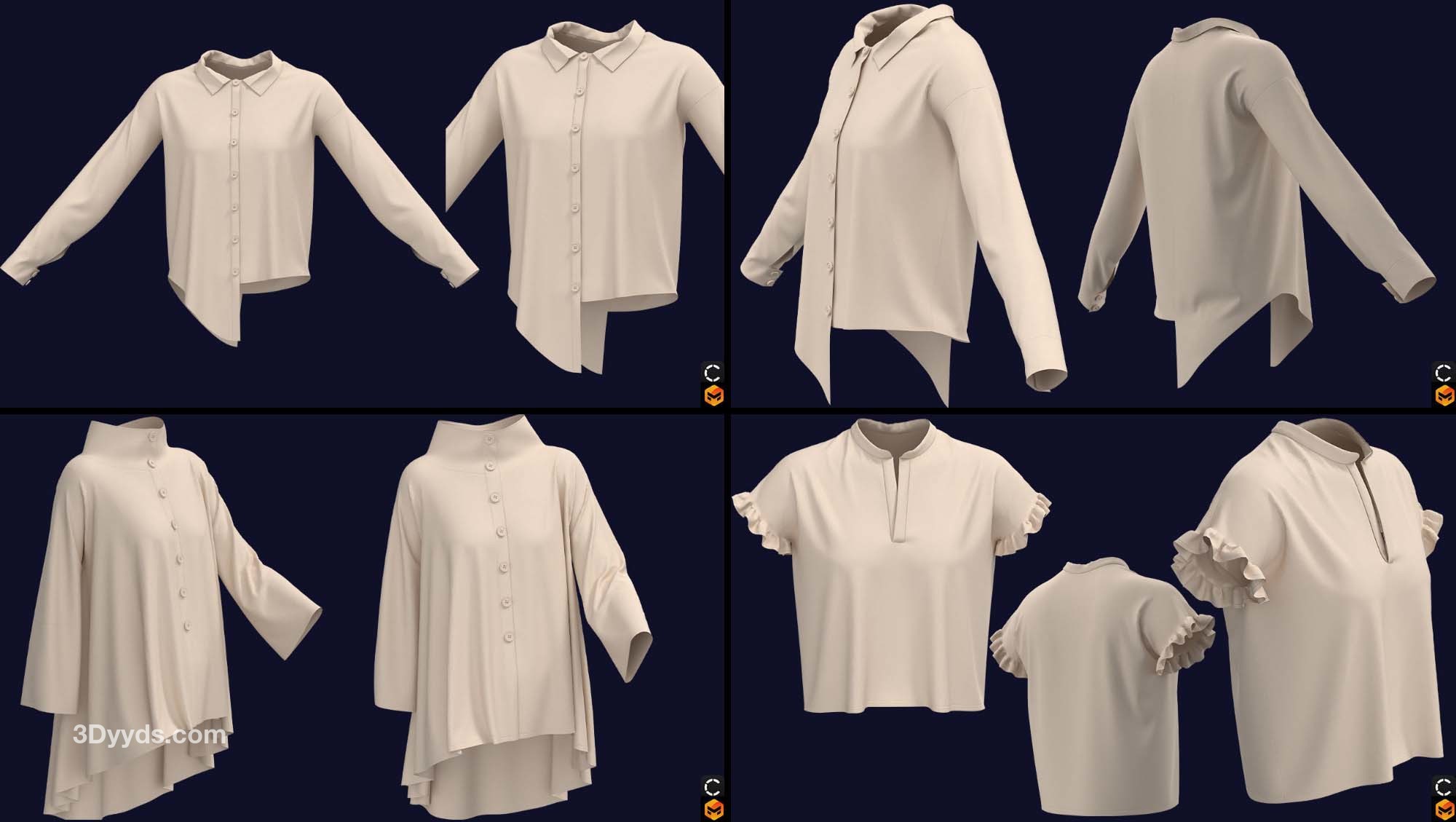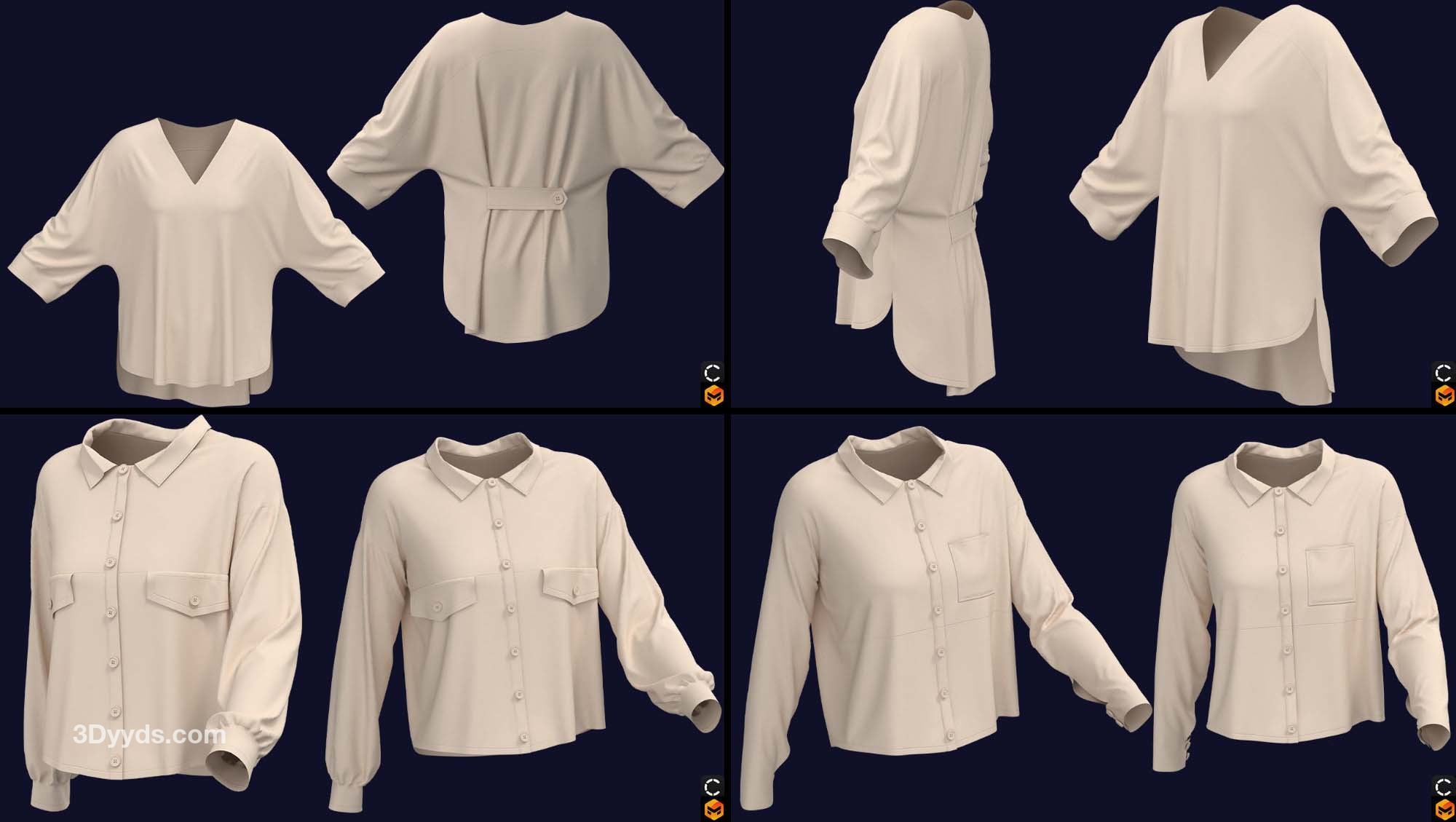 在这个包中,我们准备了 10 款基本款式的女式衬衫(在 clo3d 版本 6.2.234 中设计):