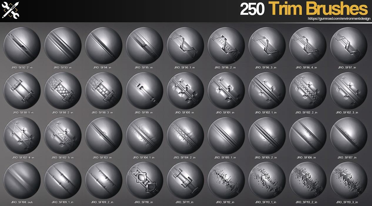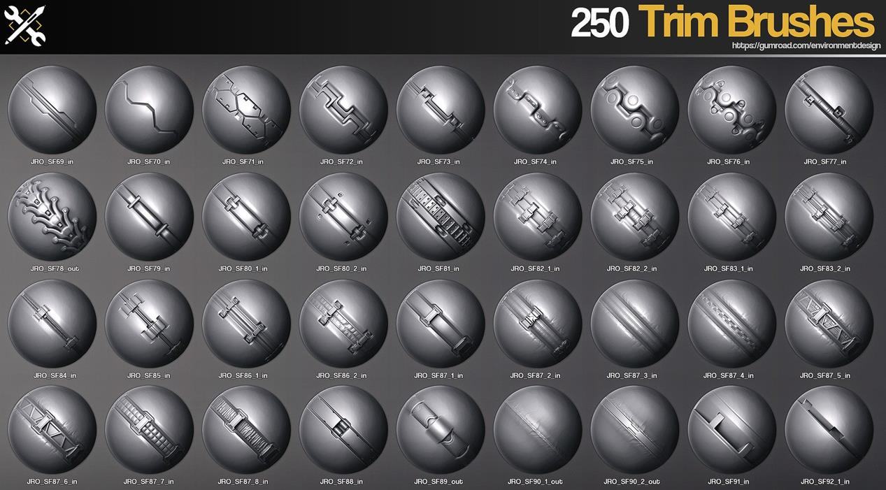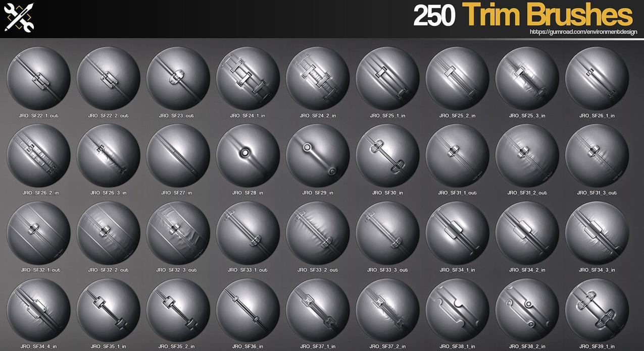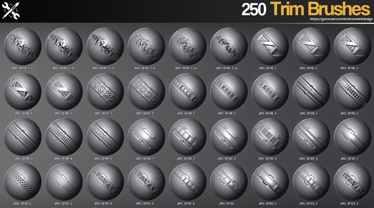 这是一套为ZBrush设计的256个SF修剪笔刷,所有笔刷都使用2048x2048的16位Alpha通道,并包含PSD、Tiff、Jpeg格式的Alpha图像。这些笔刷也将在不久的将来可以在Substance Painter中使用,客户将自动获得此功能,并将收到相关的电子邮件通知。