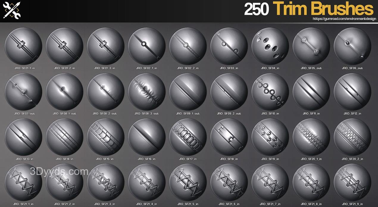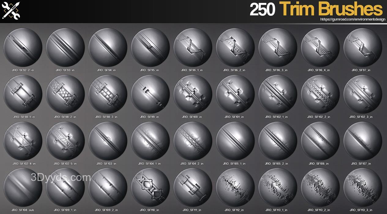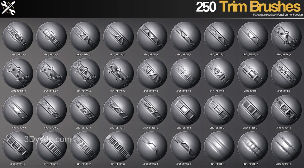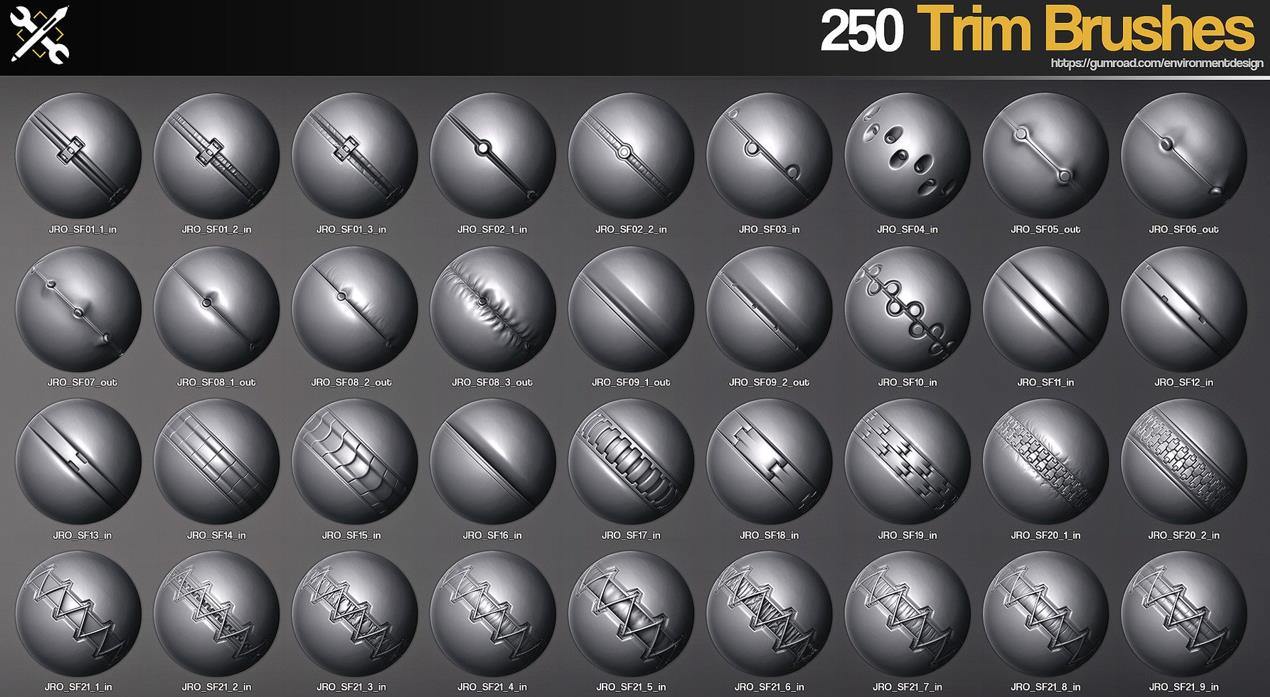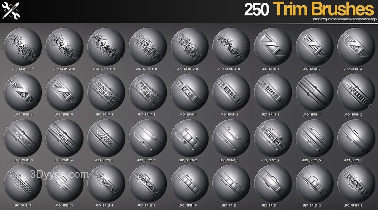 这是一套为ZBrush设计的256个SF修剪笔刷,所有笔刷都使用2048x2048的16位Alpha通道,并包含PSD、Tiff、Jpeg格式的Alpha图像。这些笔刷也将在不久的将来可以在Substance Painter中使用,客户将自动获得此功能,并将收到相关的电子邮件通知。