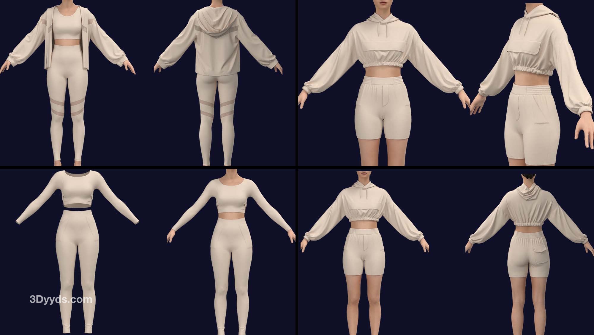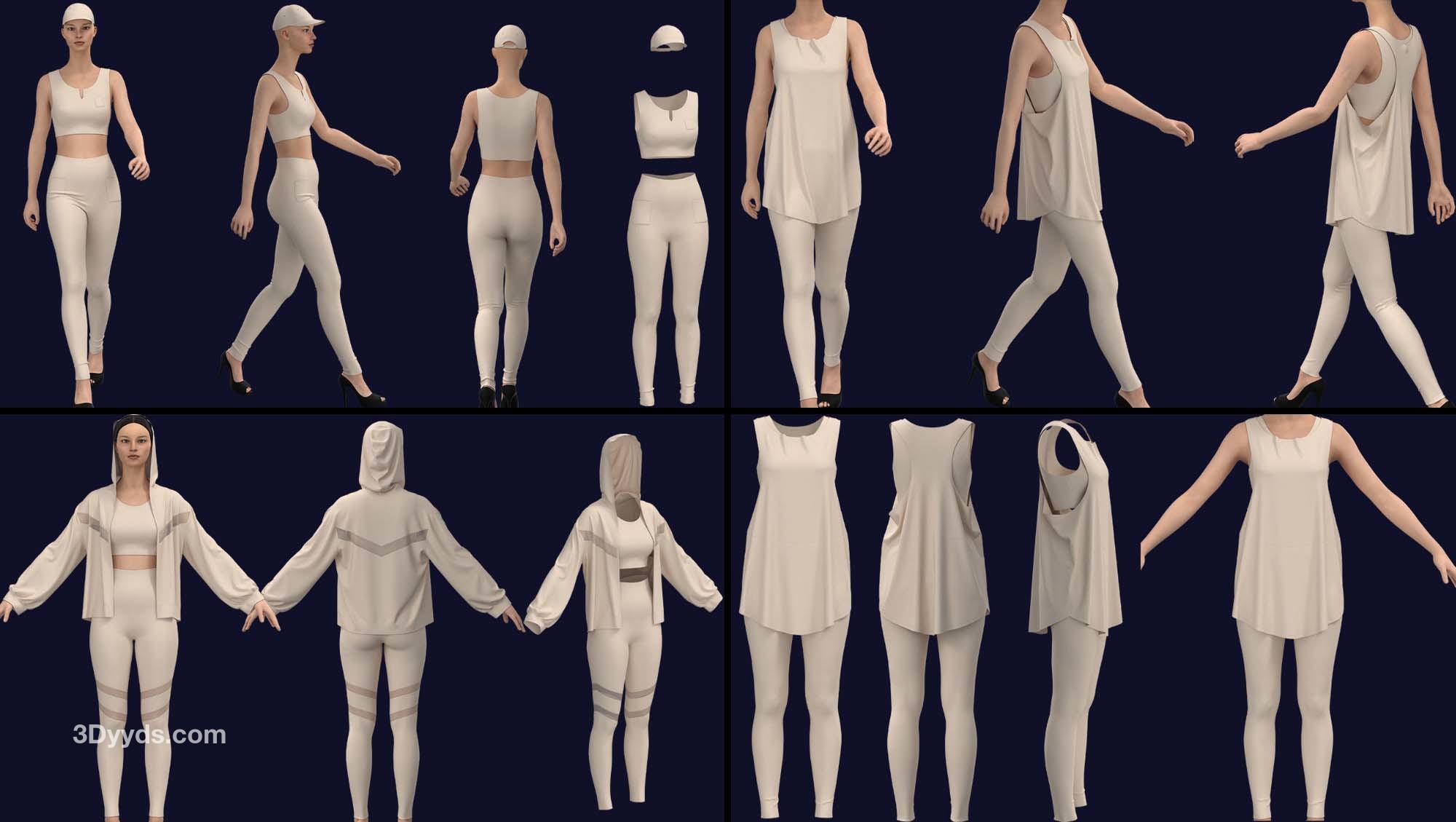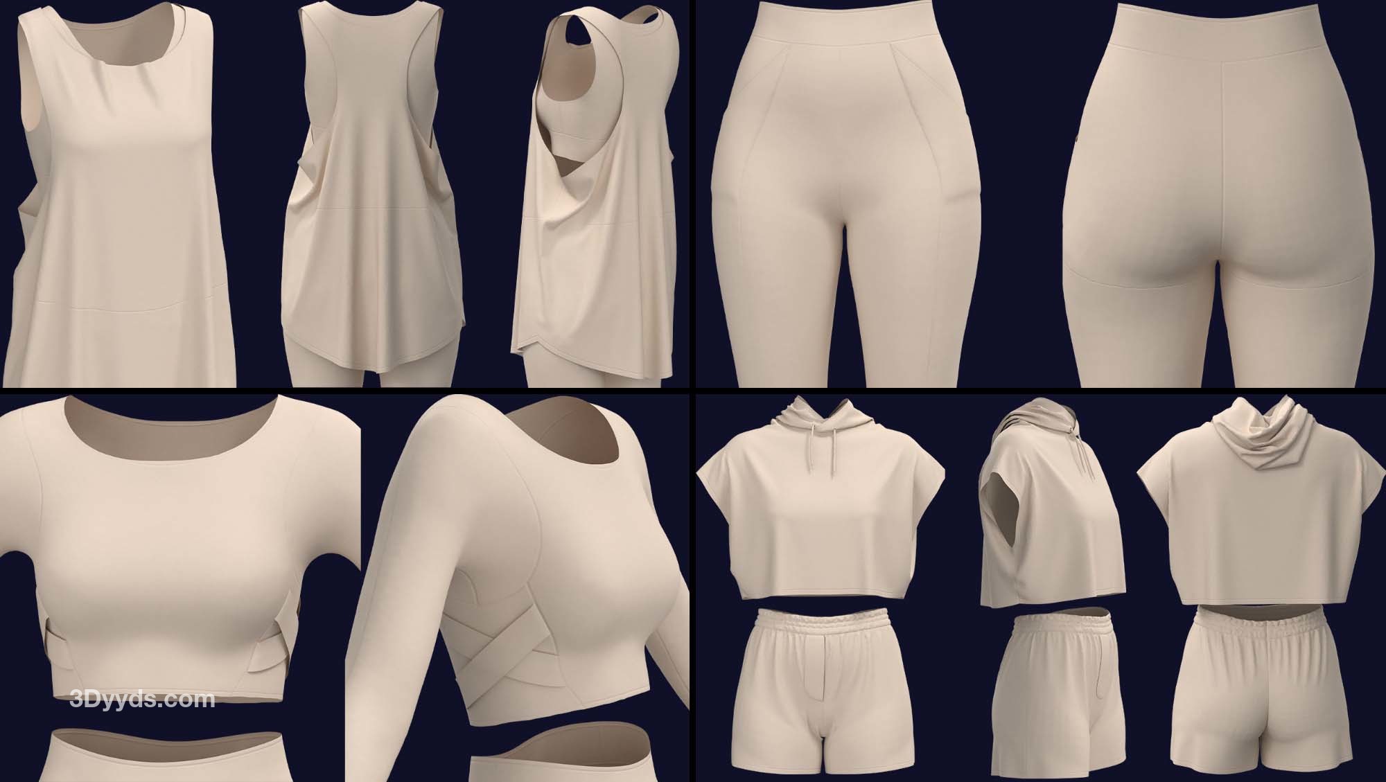 在此包中,我们准备了 10 款基本款式的女士运动服(在 clo3d 版本 6.2.234 中设计):