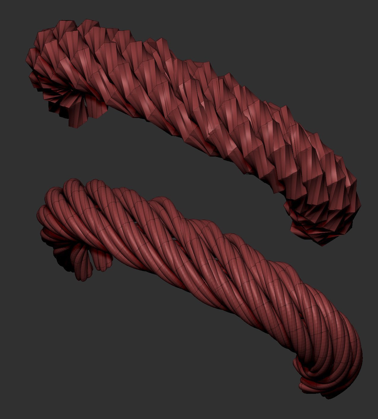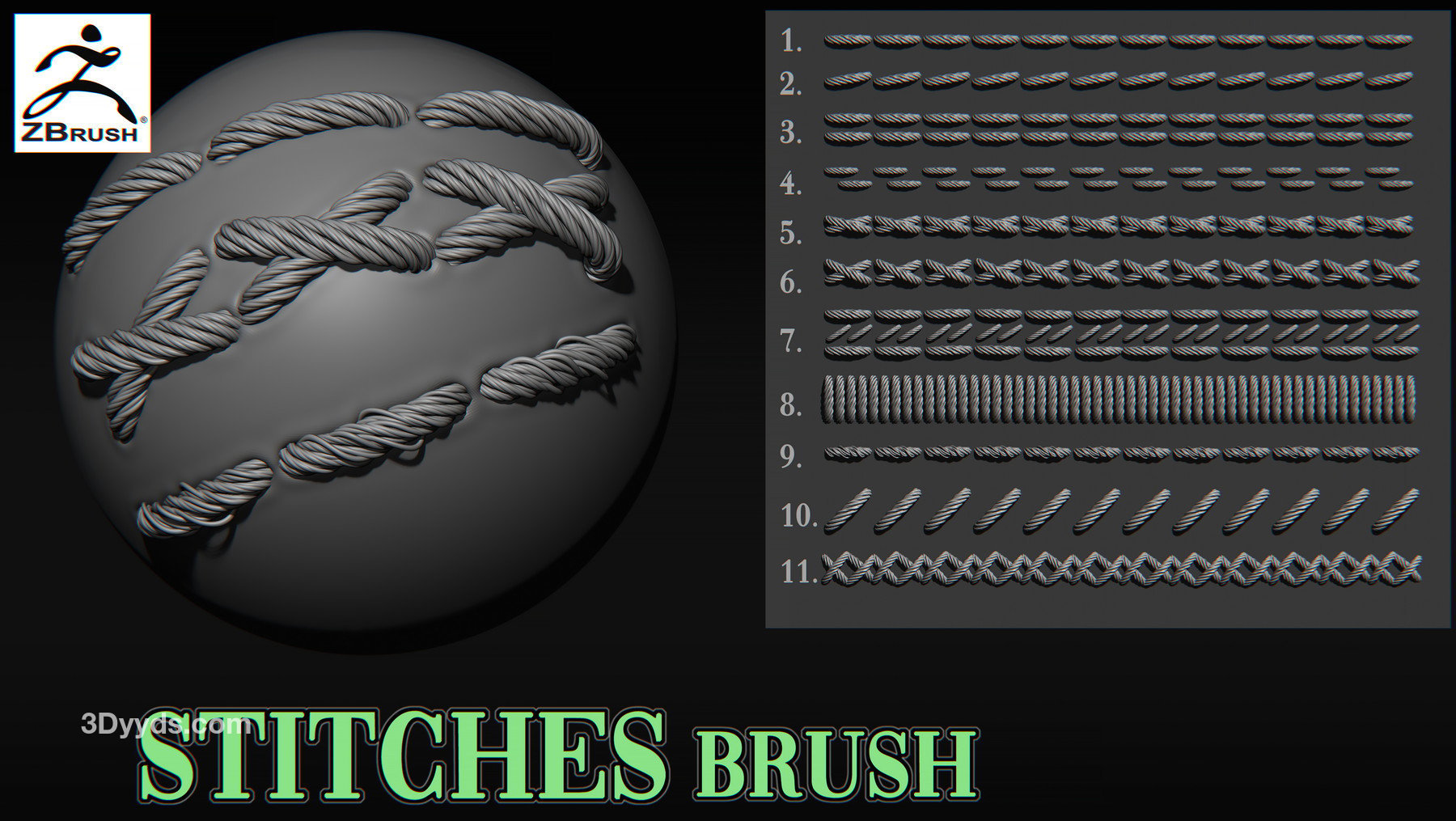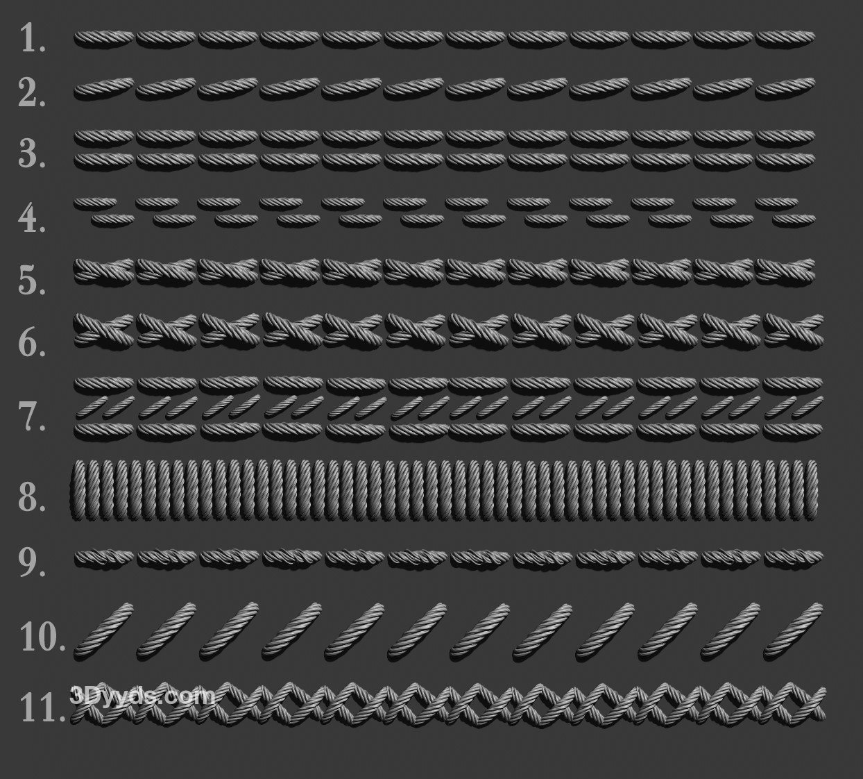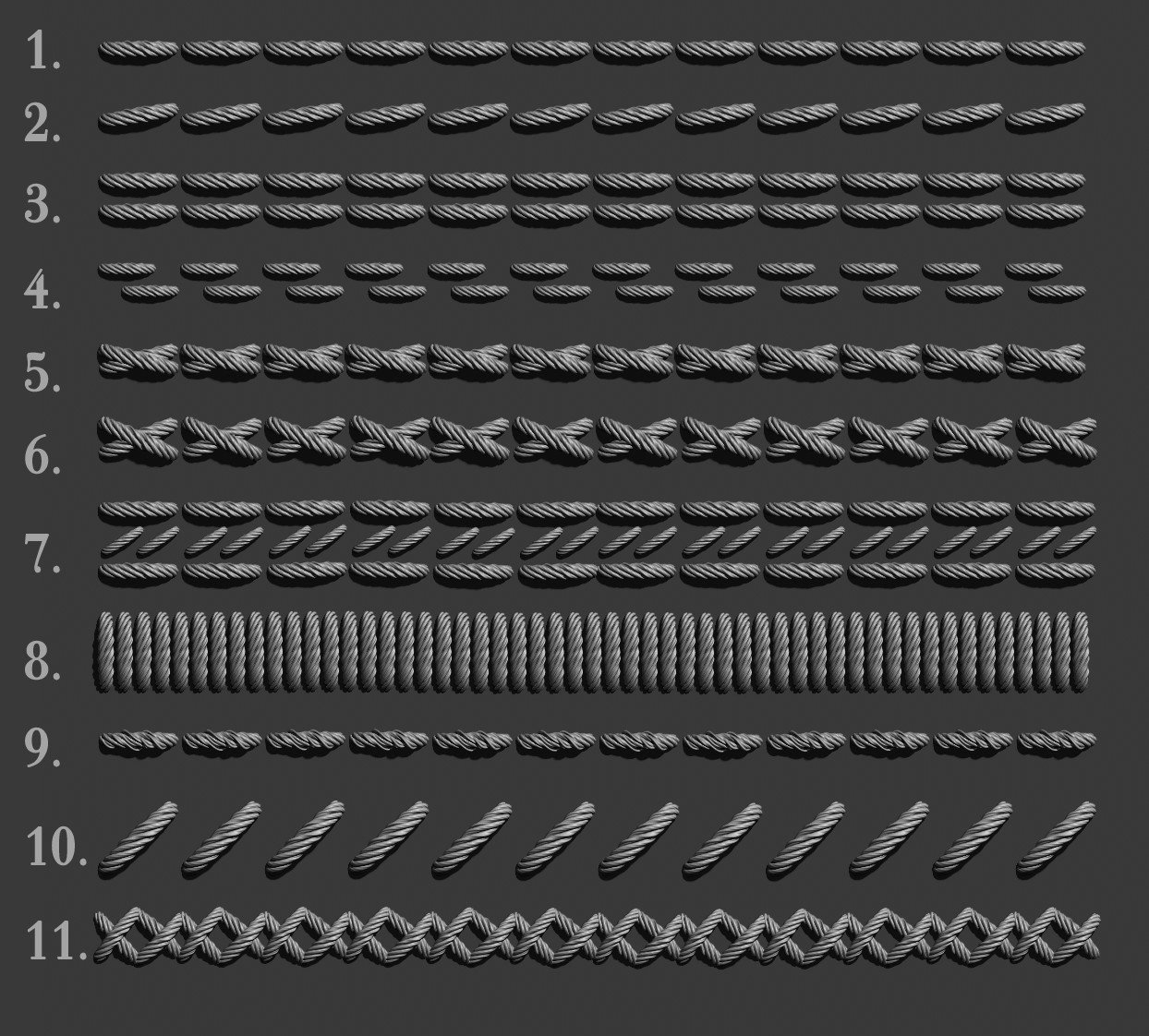 绳子麻绳曲线笔刷用于ZBrush。可在任何ZBrush版本中使用。包括: