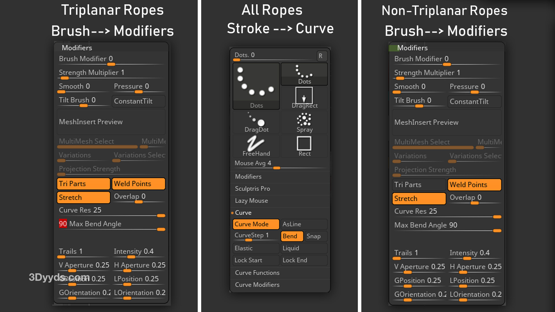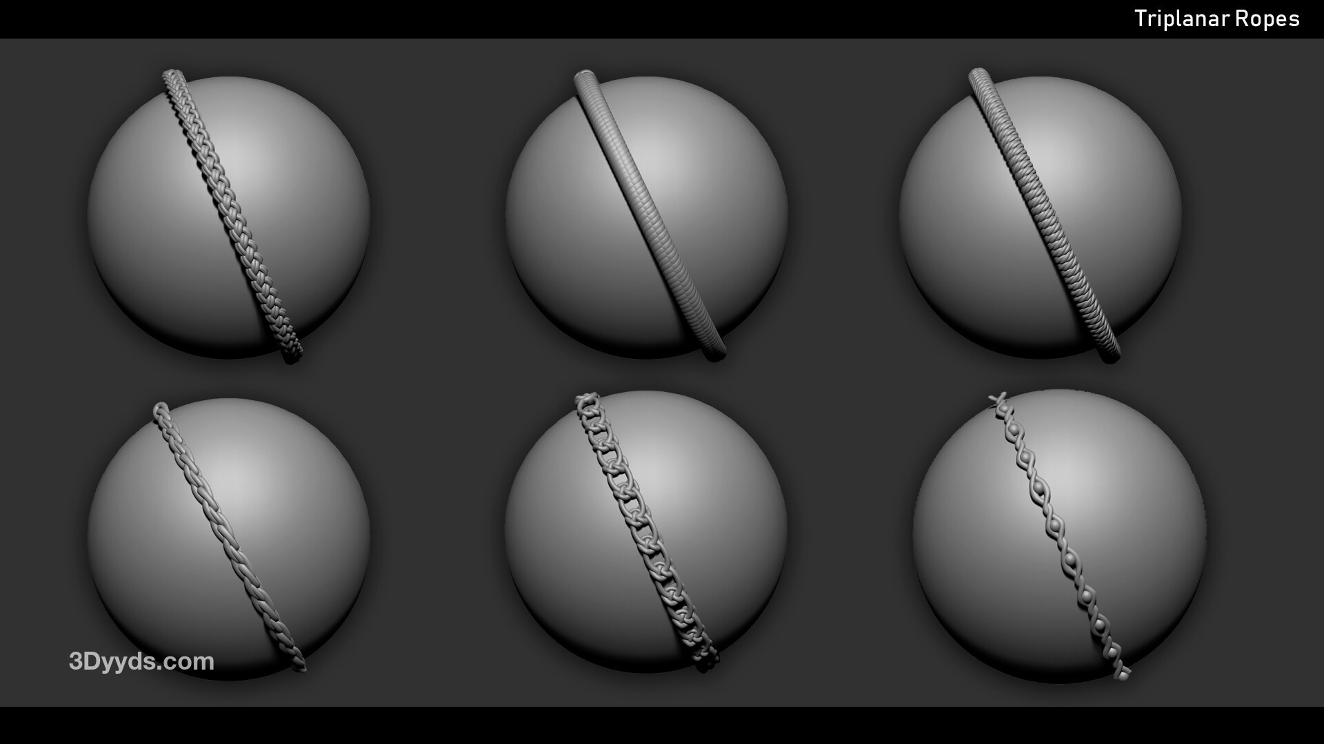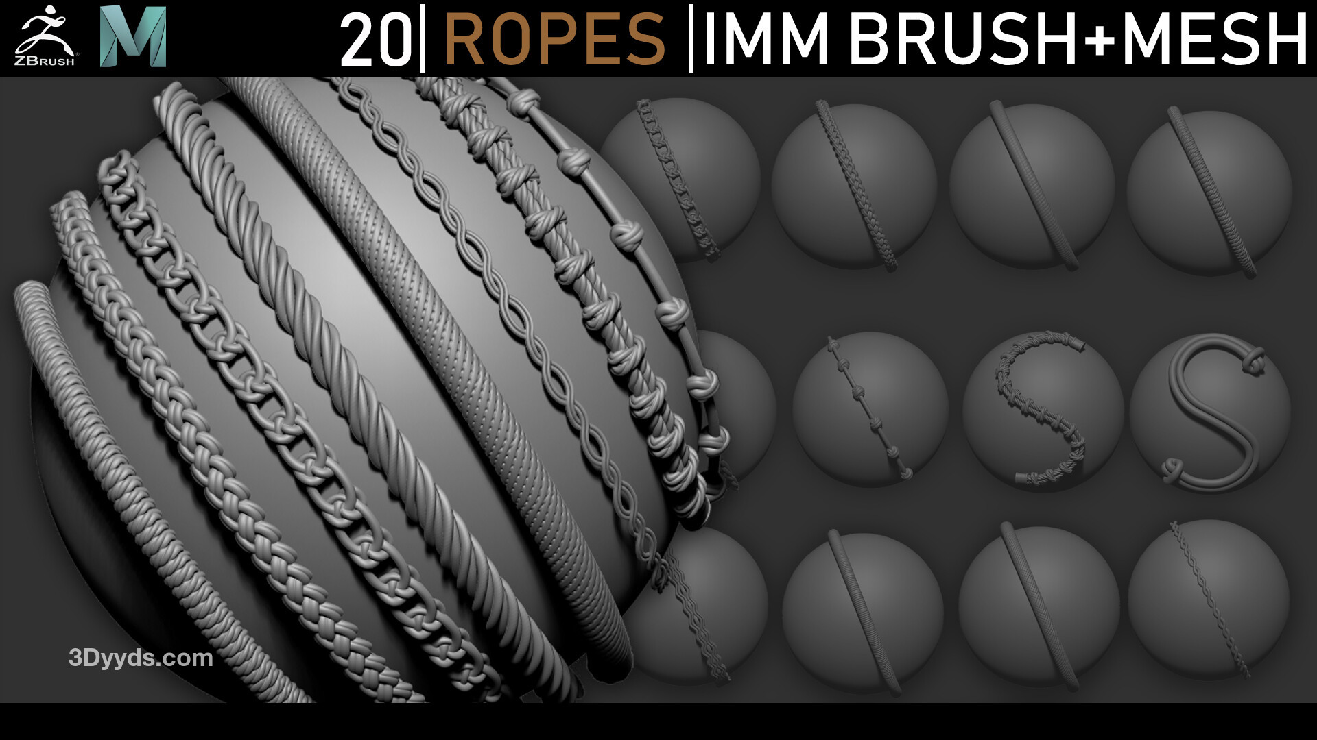 ZBrush - 20 条绳索 Curve 刷子,全部包含在一个多网格刷子和低多边形网格中。