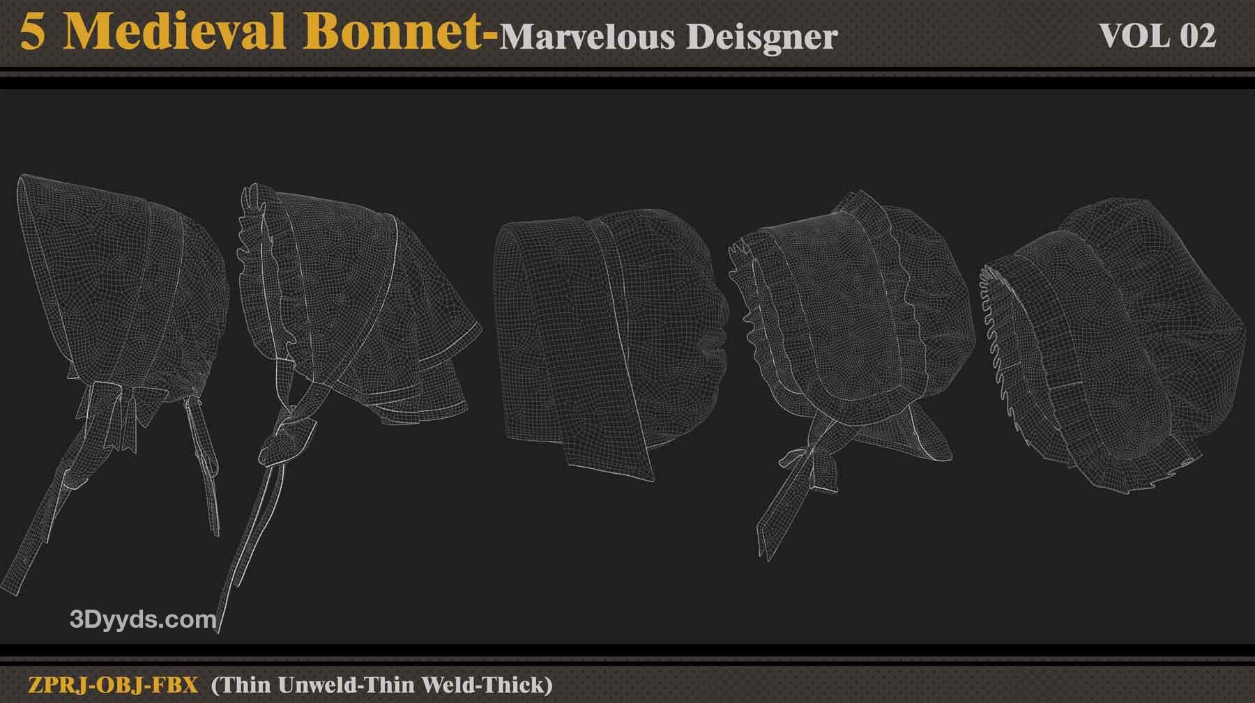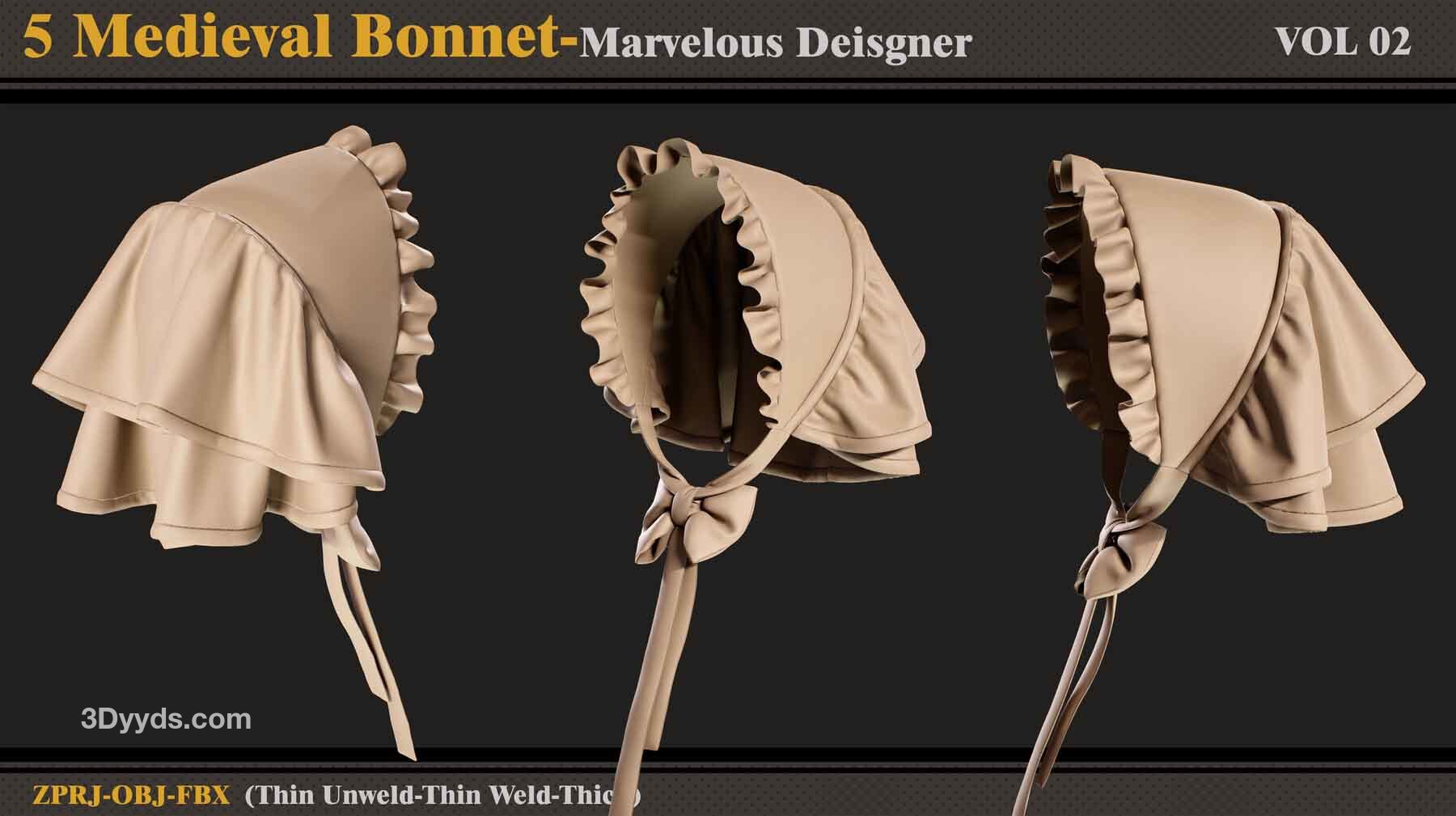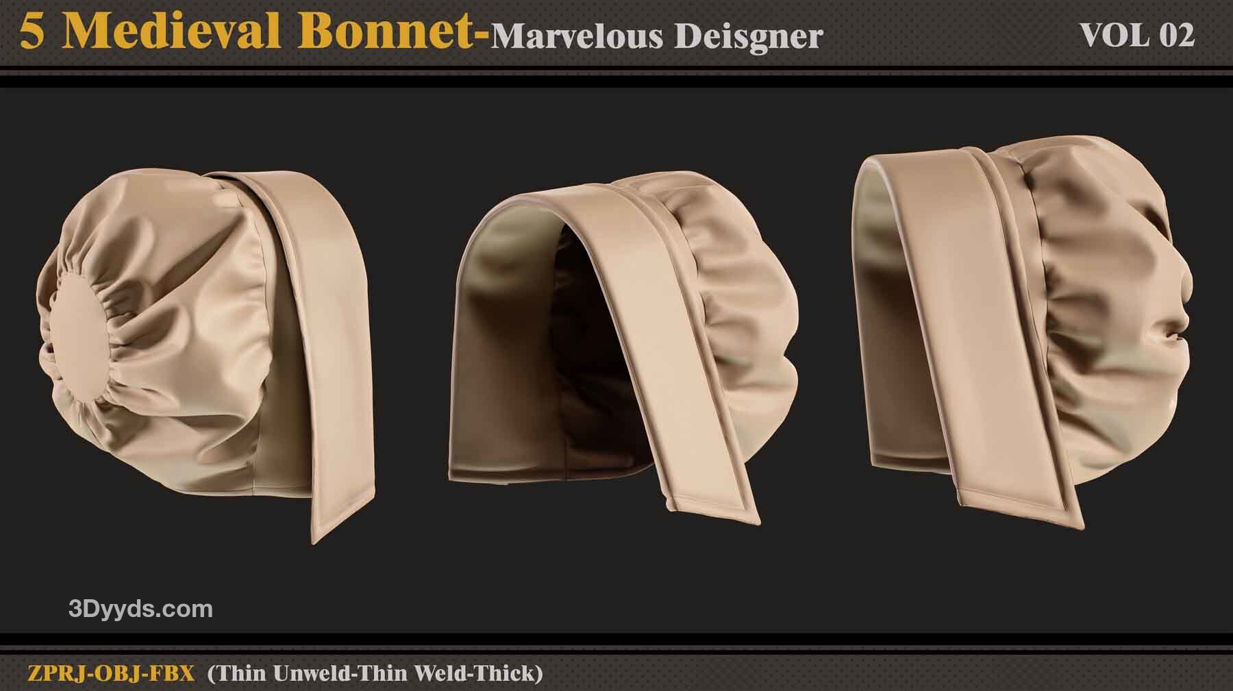 本产品包含 5 个 Medieval Bonnet(VOL 2) 和 5 个文件。在每个文件中,有: