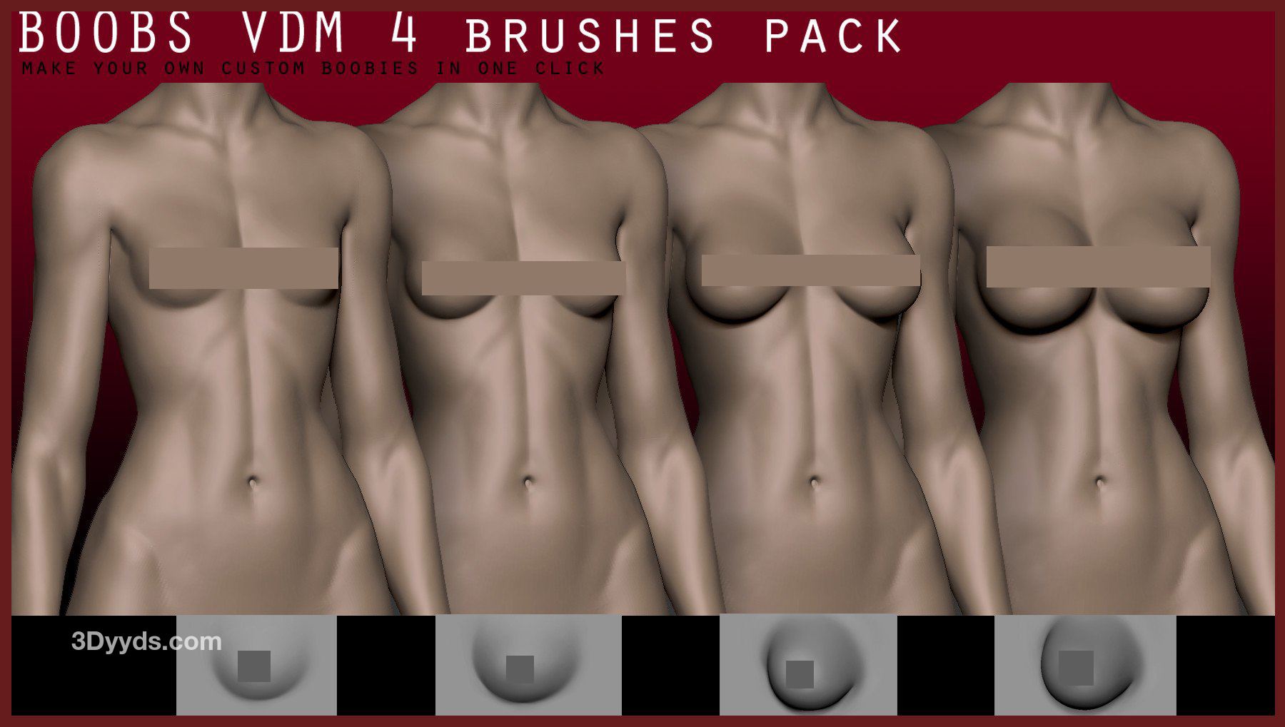 现在有了 BOOBS VDM 包。仅对于 3.50,您可以在 4 种尺寸之间进行选择,并一键将它们拖到您雕刻的女士身上。甚至更多,您可以调整画笔的强度来制作自己的自定义大小。