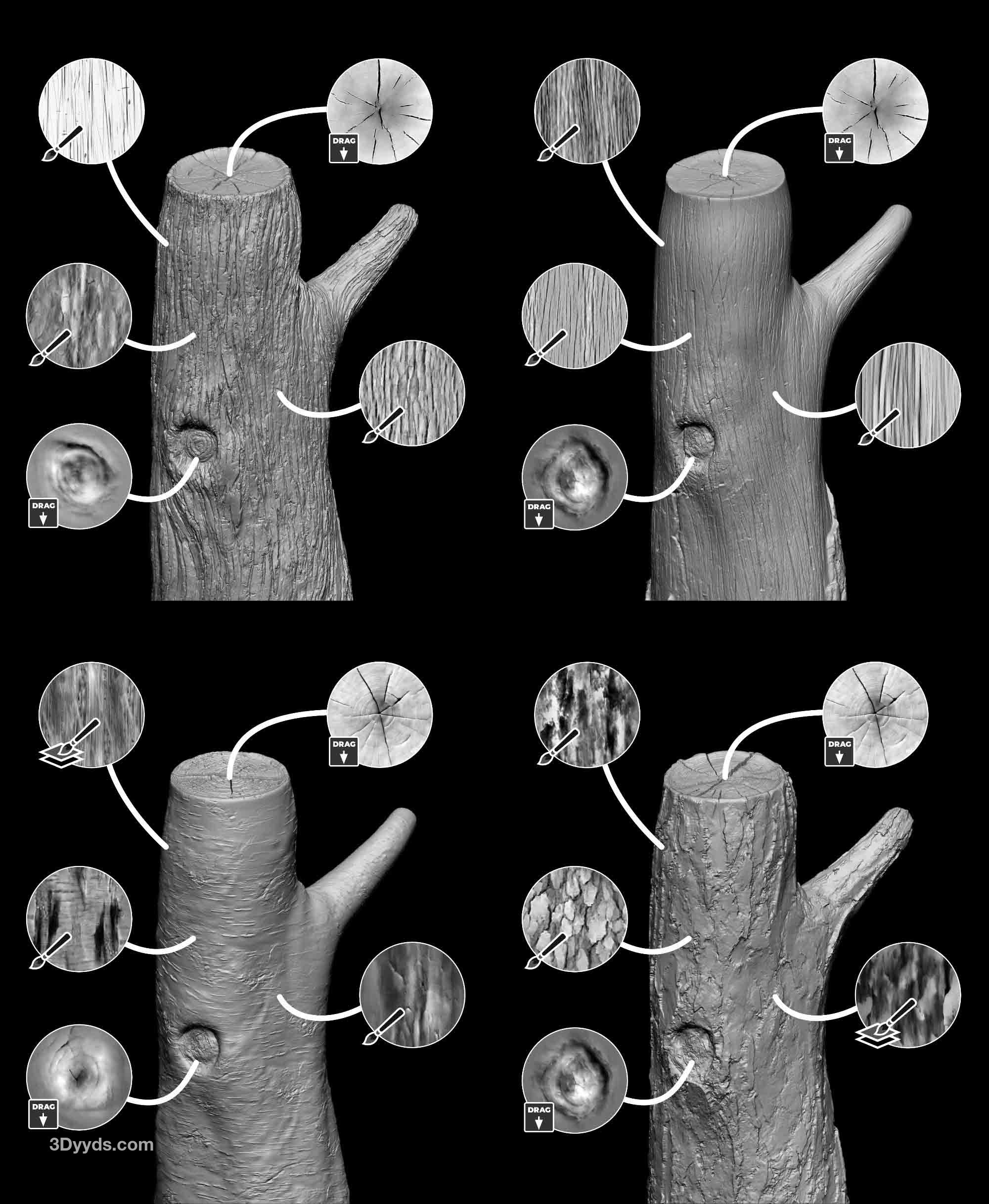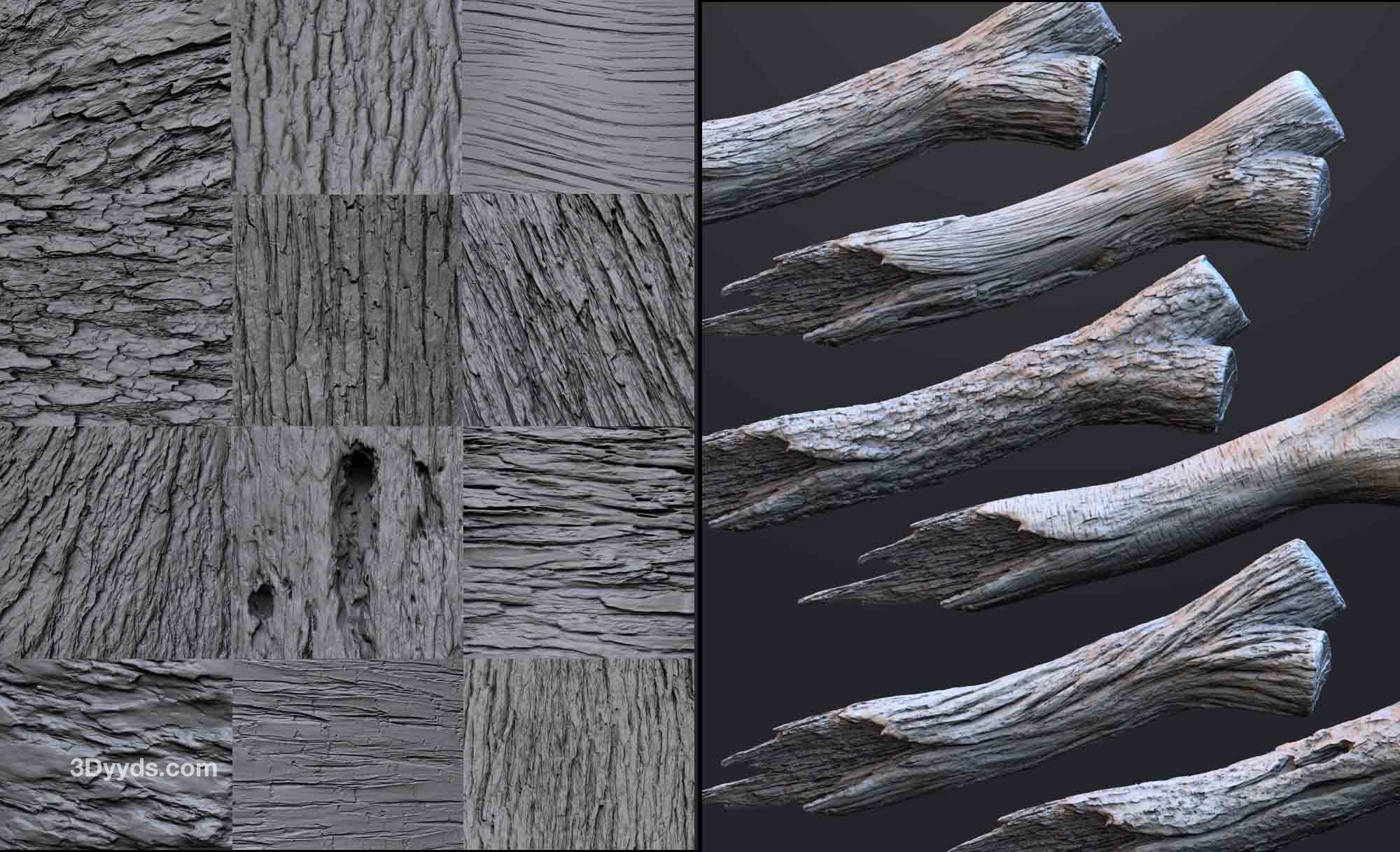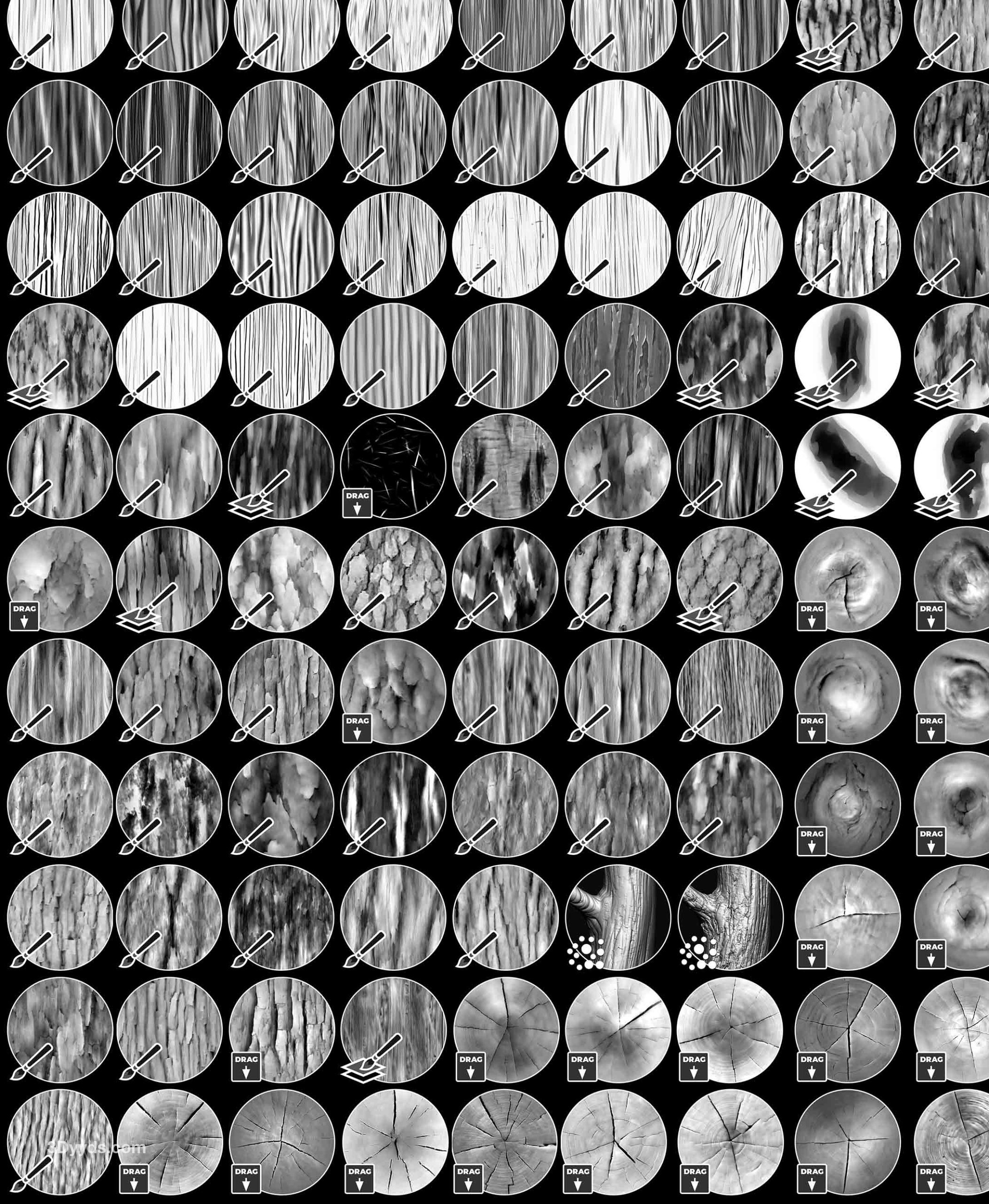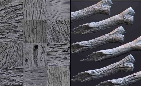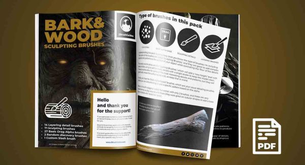这组画笔旨在简化木材和树皮纹理的雕刻和细节处理过程,允许您为网格创建复杂的细节和图案。这个系列包含 115 种雕刻画笔,分为 3 个主要类别:雕刻画笔、分层画笔和基本的基于 alpha 的画笔,还有一些随机的发现画笔只是为了好玩,我还提供了“Pablander_Slash”来帮助您创建非常令人信服的效果。