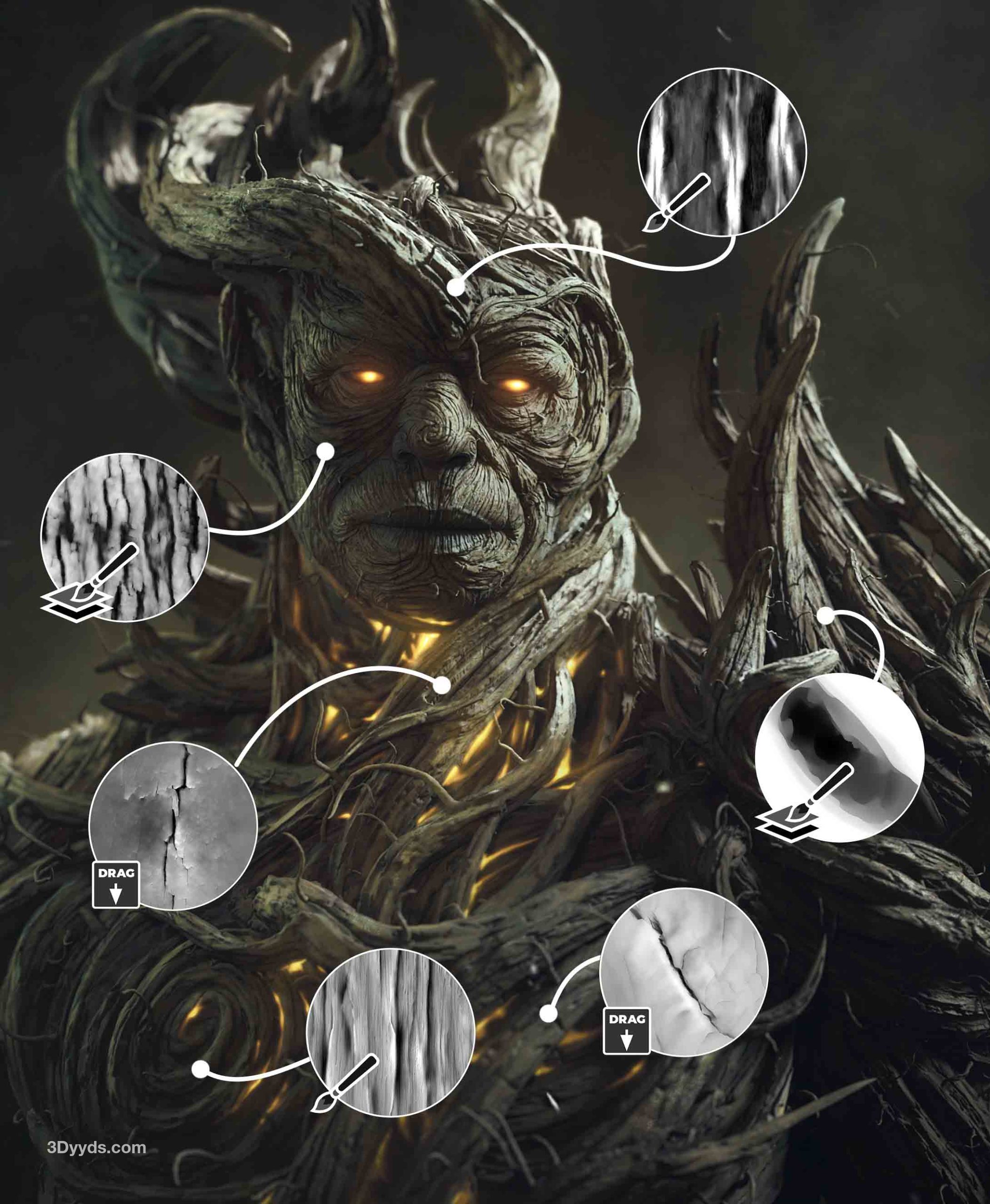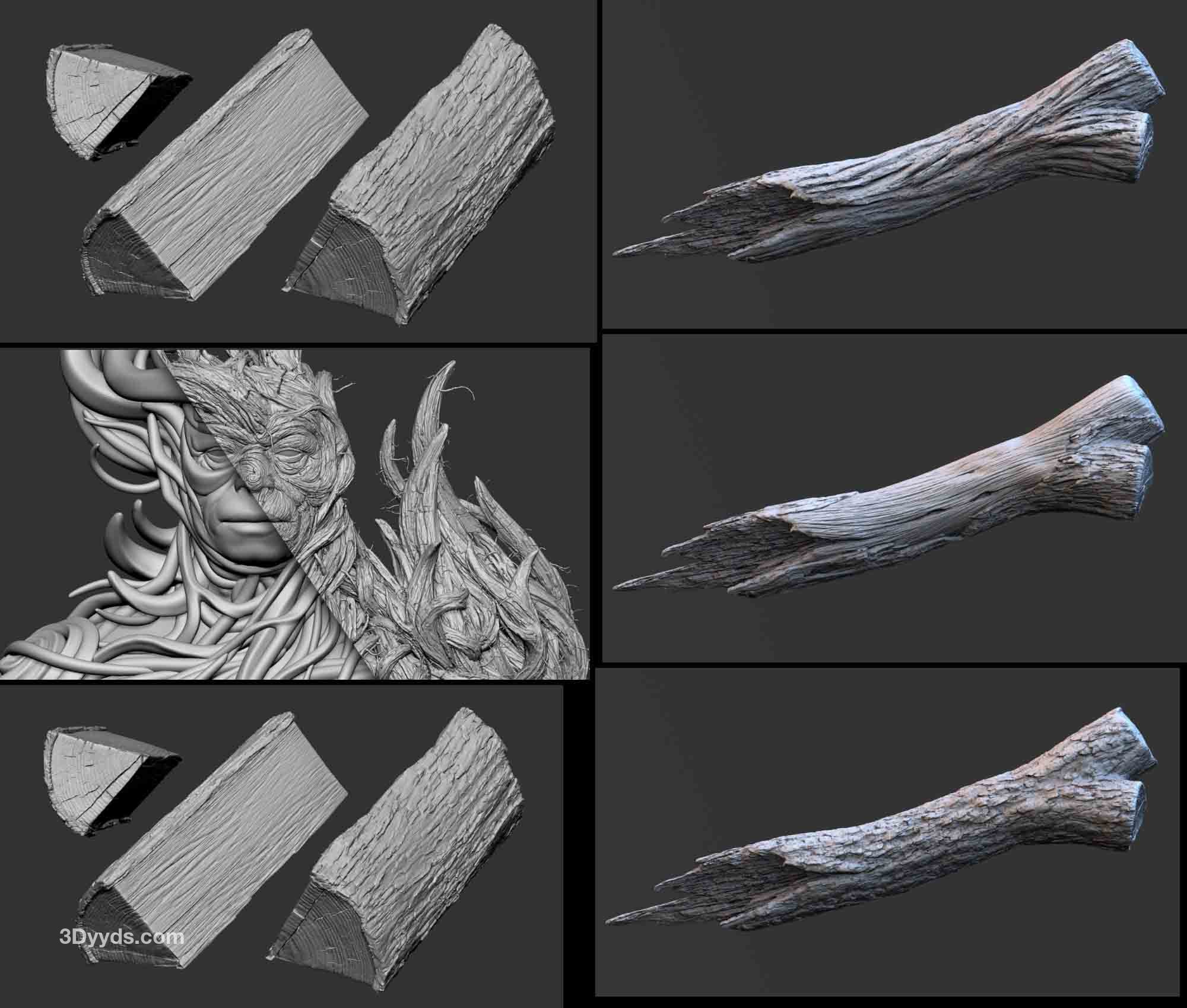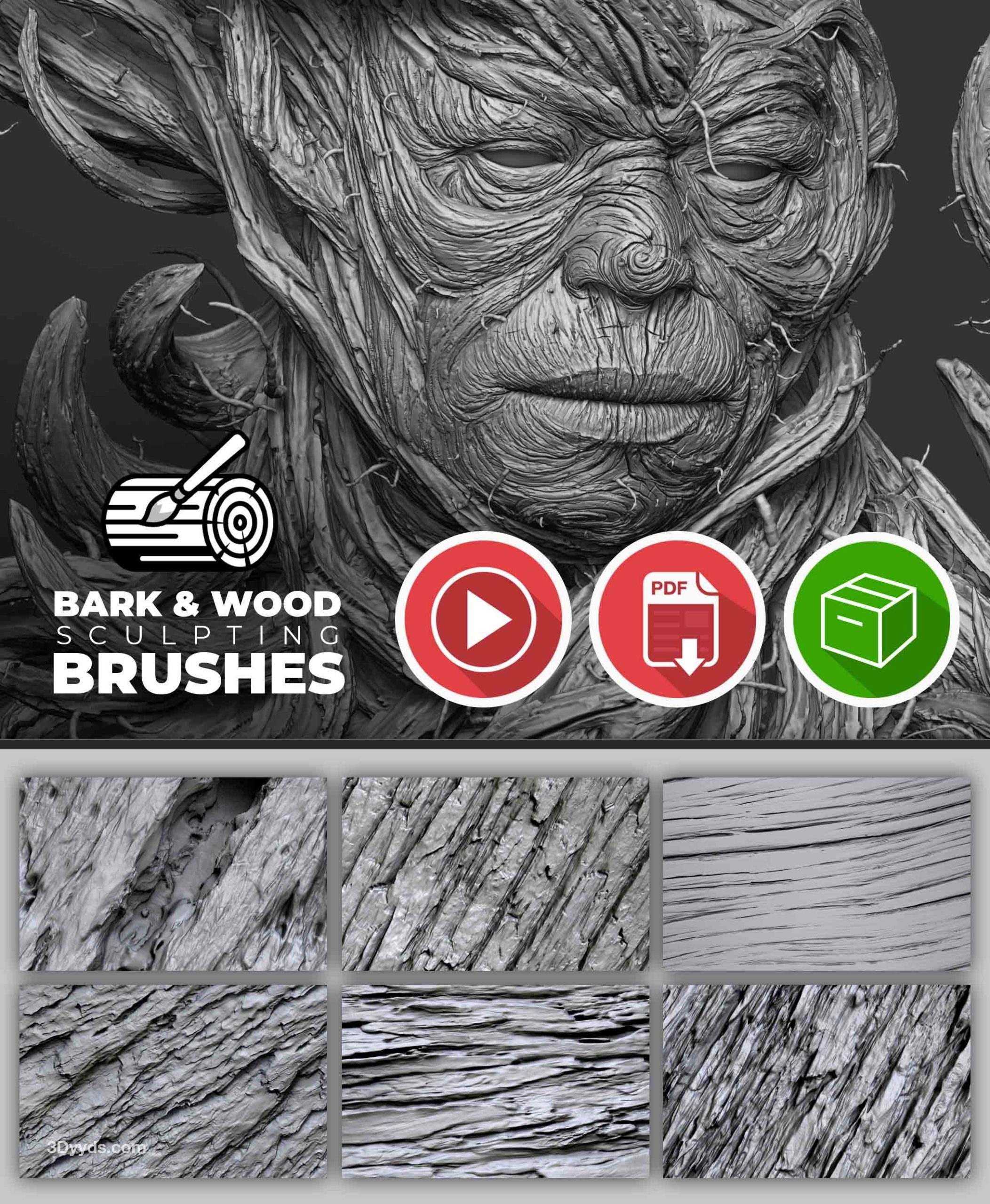 这组画笔旨在简化木材和树皮纹理的雕刻和细节处理过程,允许您为网格创建复杂的细节和图案。这个系列包含 115 种雕刻画笔,分为 3 个主要类别:雕刻画笔、分层画笔和基本的基于 alpha 的画笔,还有一些随机的发现画笔只是为了好玩,我还提供了“Pablander_Slash”来帮助您创建非常令人信服的效果。