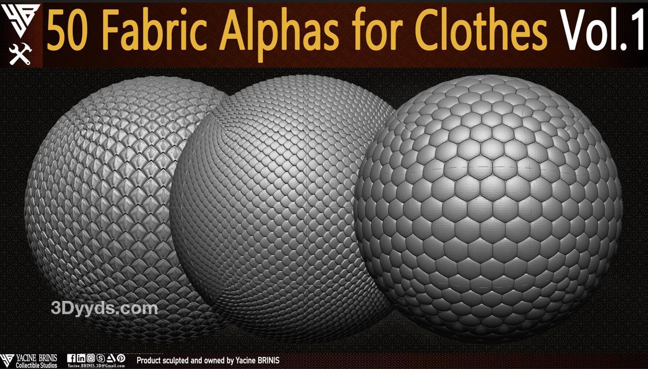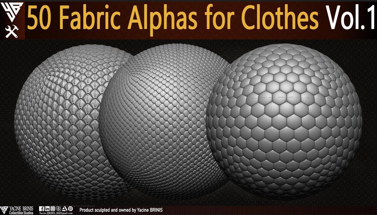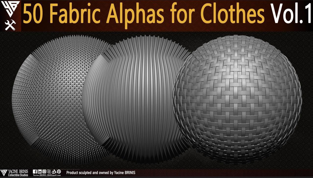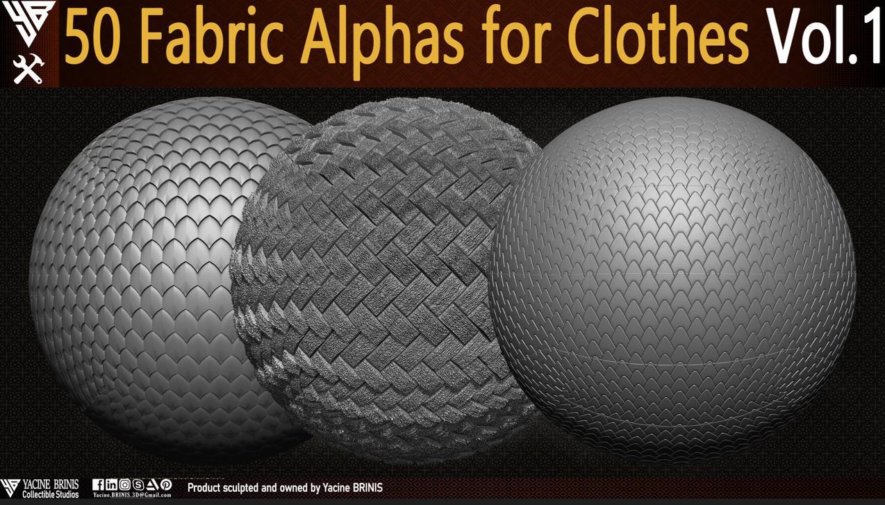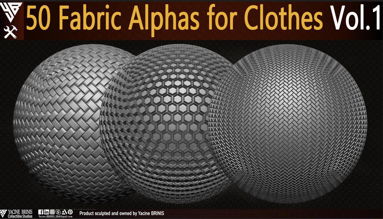 这是一个包含50个布料纹理Alpha贴图的套装,你可以在ZBrush、3D Coat、Substance Painter、3ds Max、Maya、Cinema 4d和Blender等3D软件中使用在衣服上。