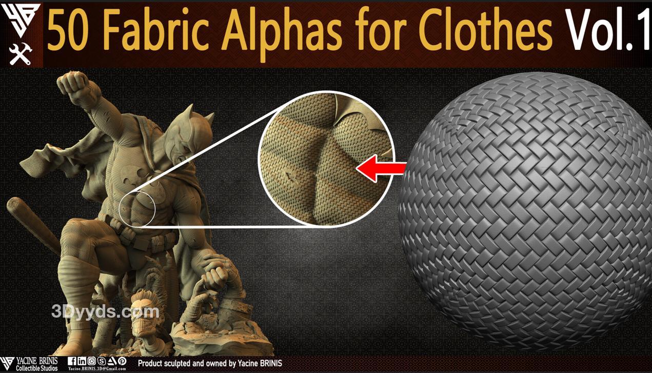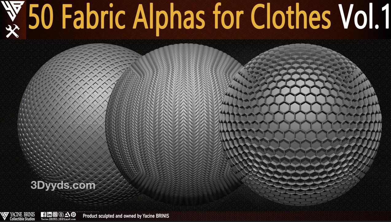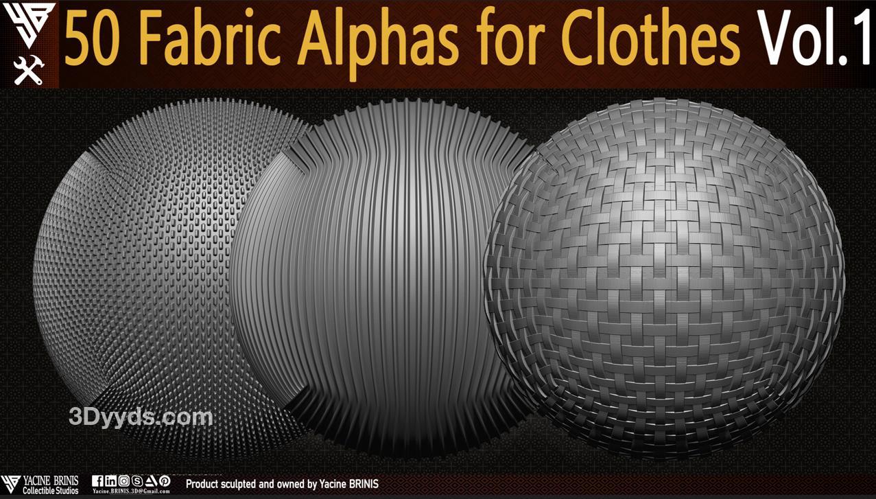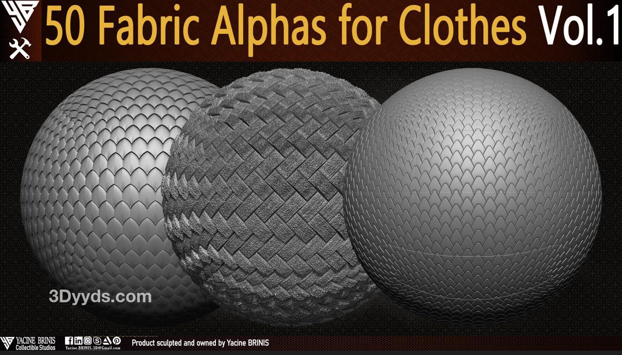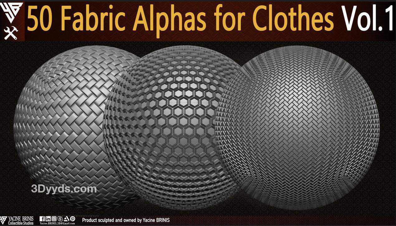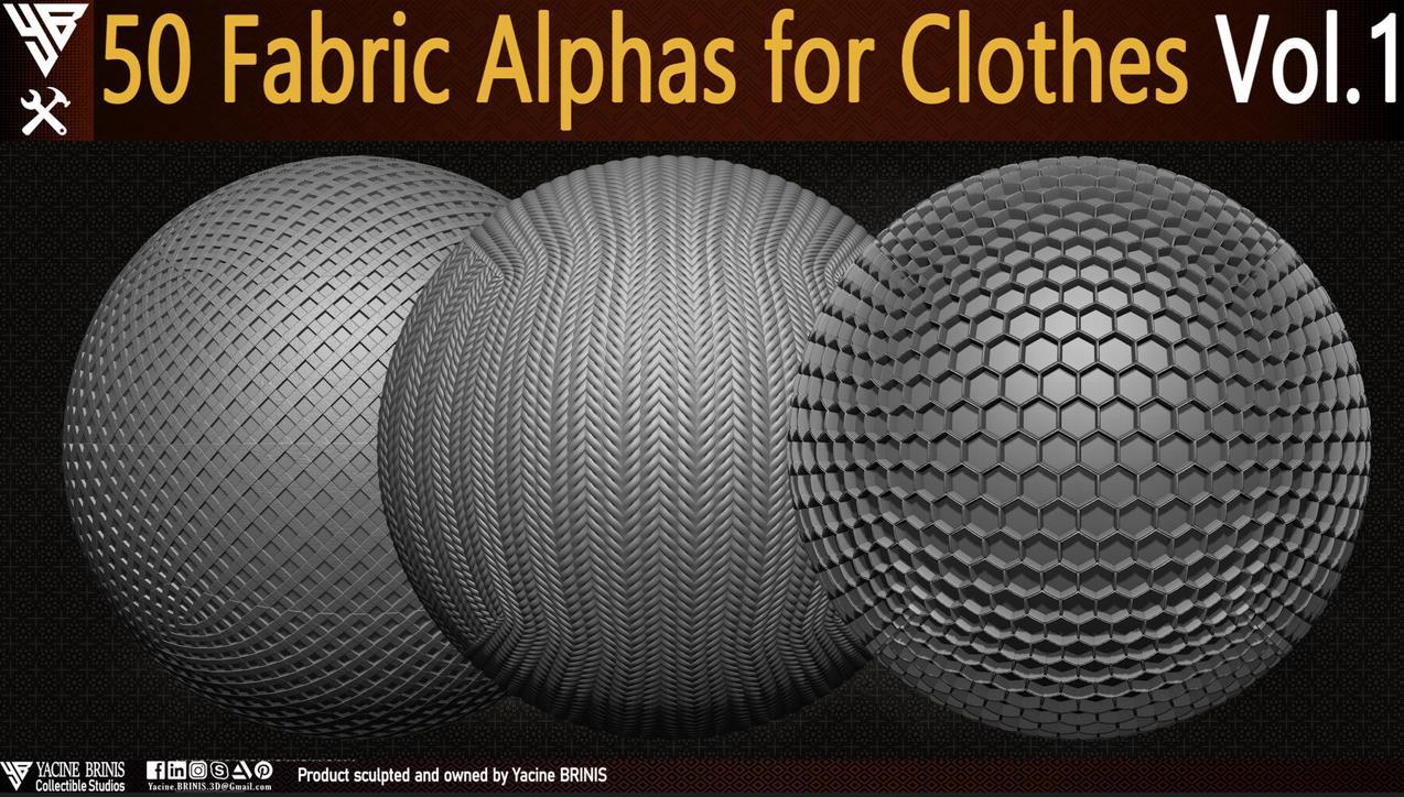 这是一个包含50个布料纹理Alpha贴图的套装,你可以在ZBrush、3D Coat、Substance Painter、3ds Max、Maya、Cinema 4d和Blender等3D软件中使用在衣服上。