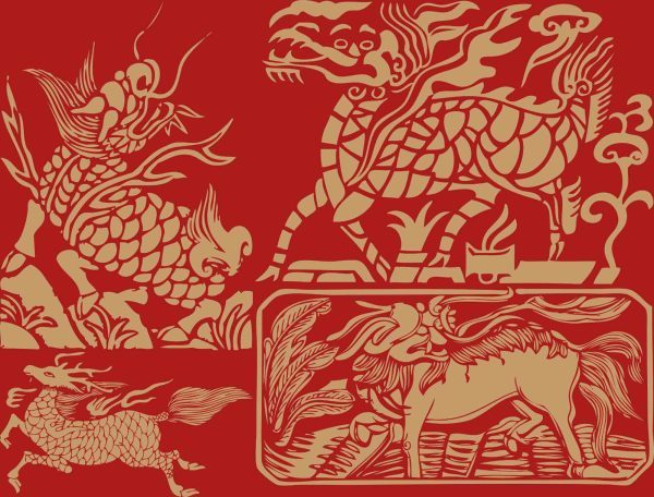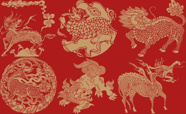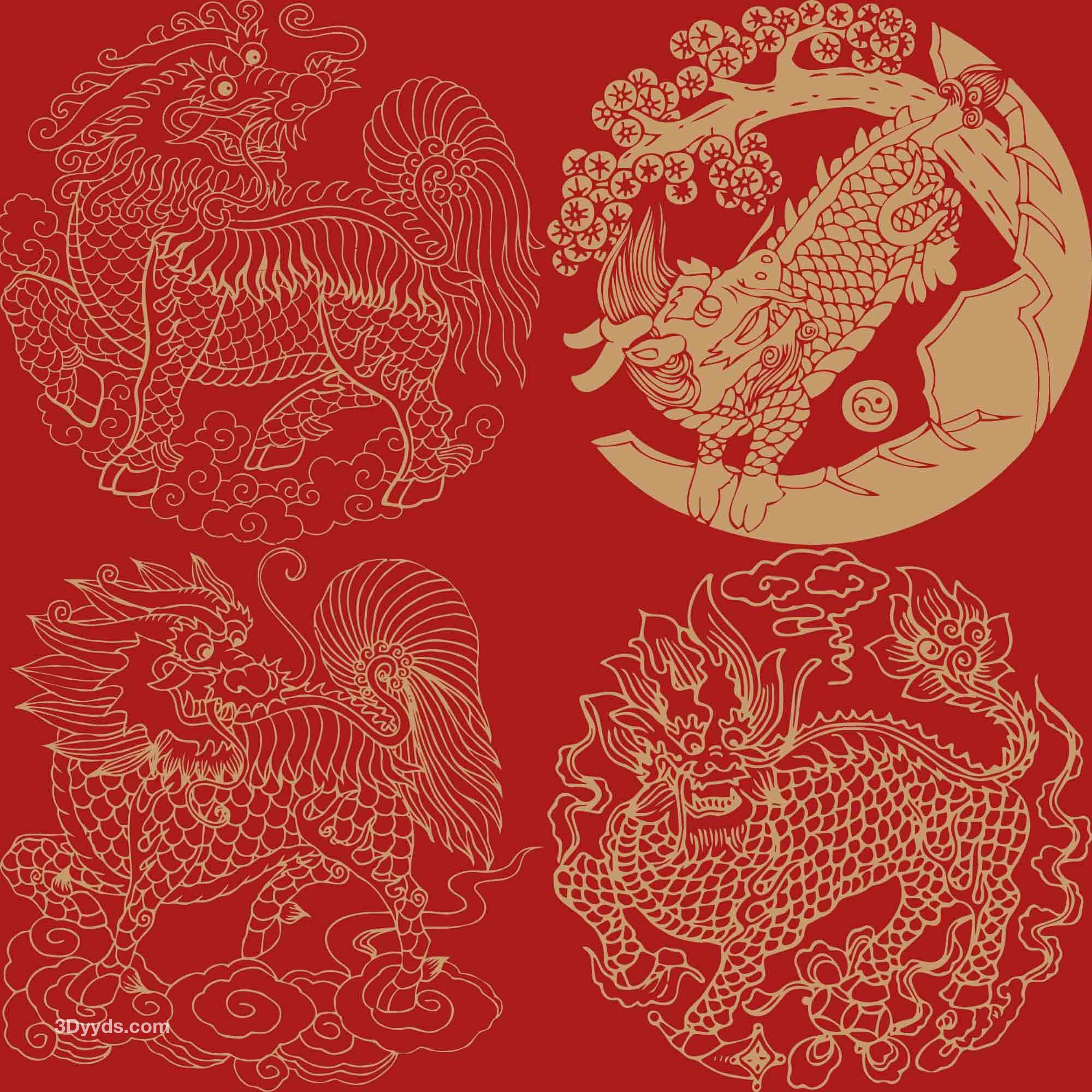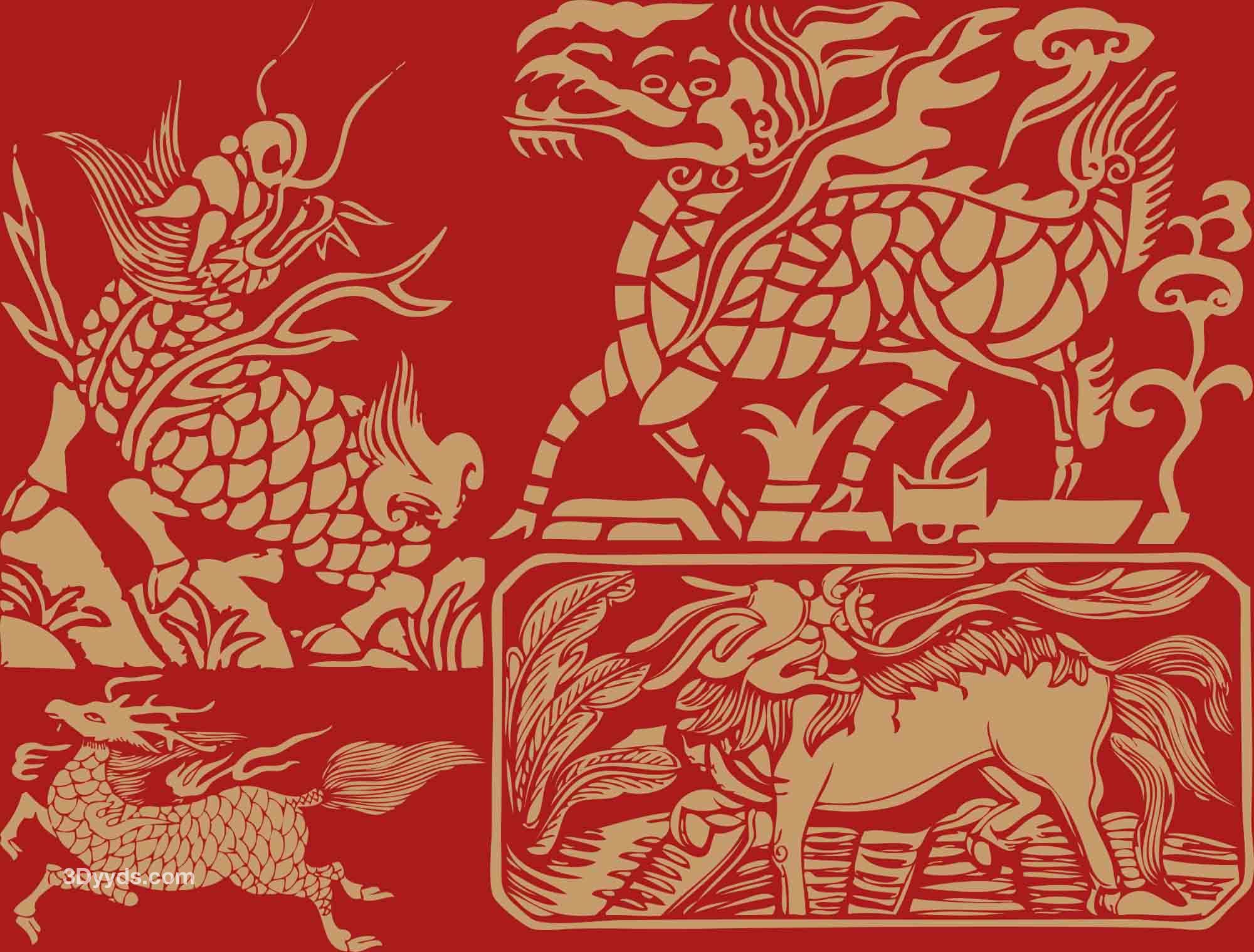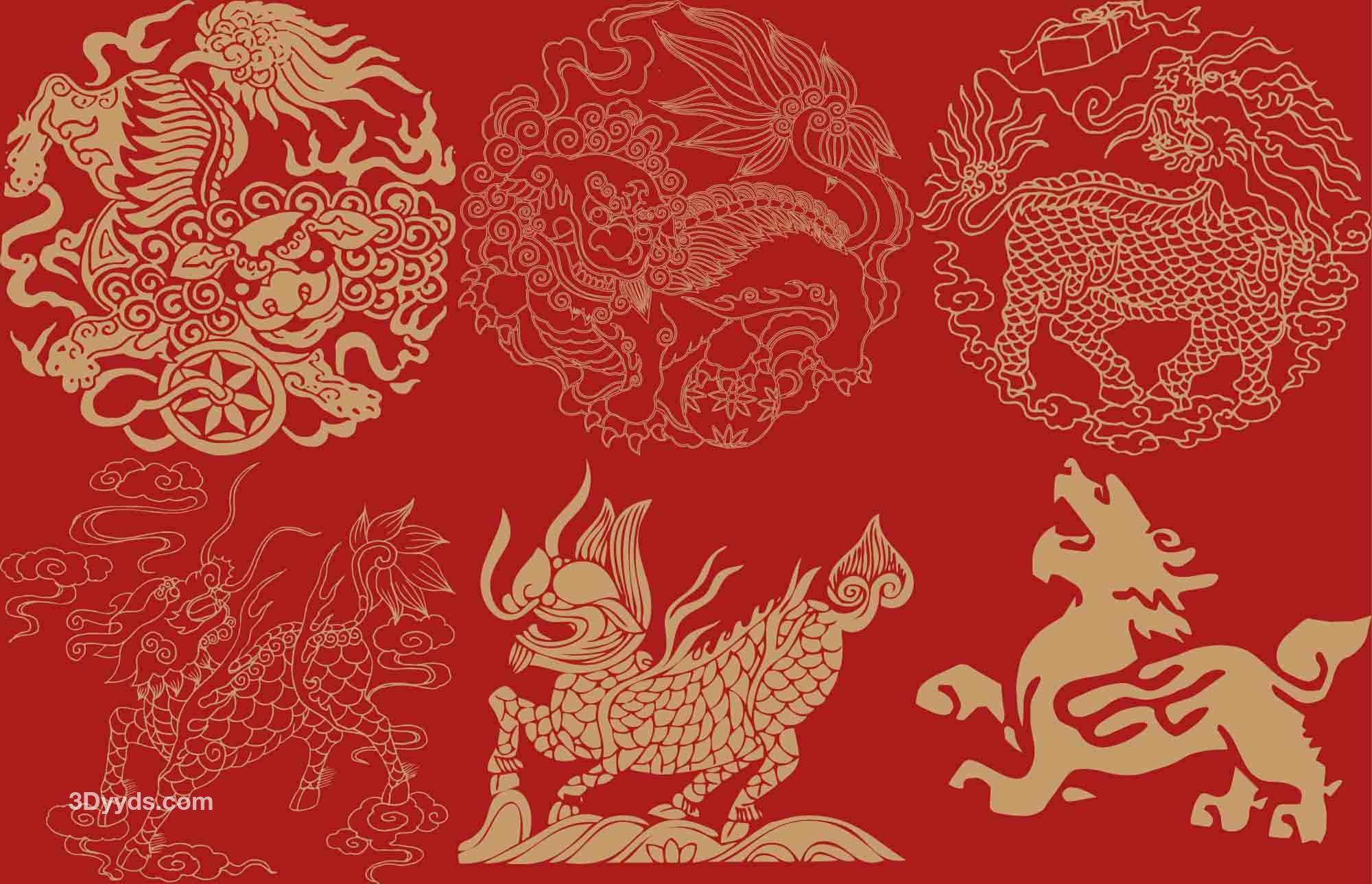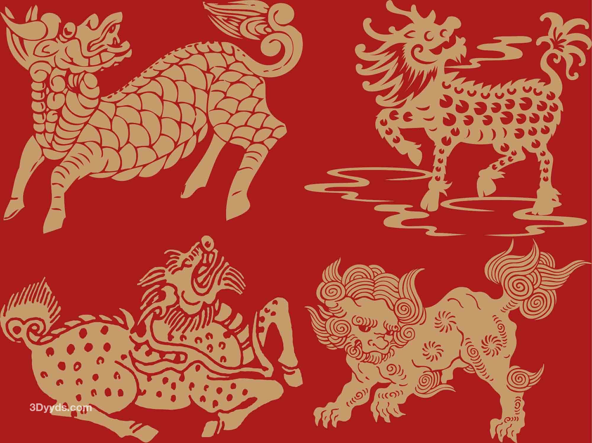 中式传统麒麟狮子神话古典神兽图案瑞兽图腾纹样PNG矢量设计素材
