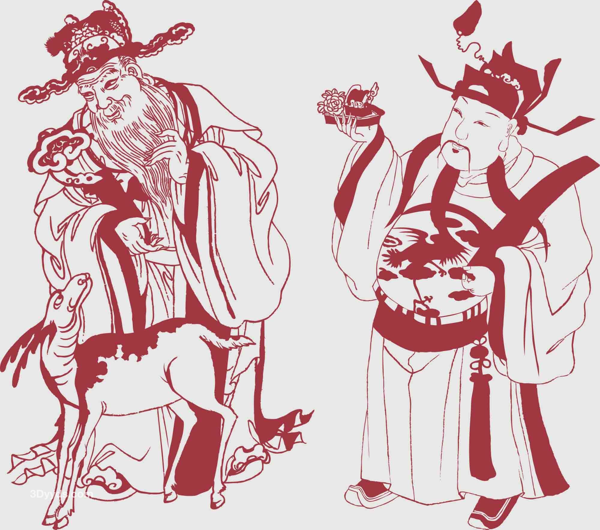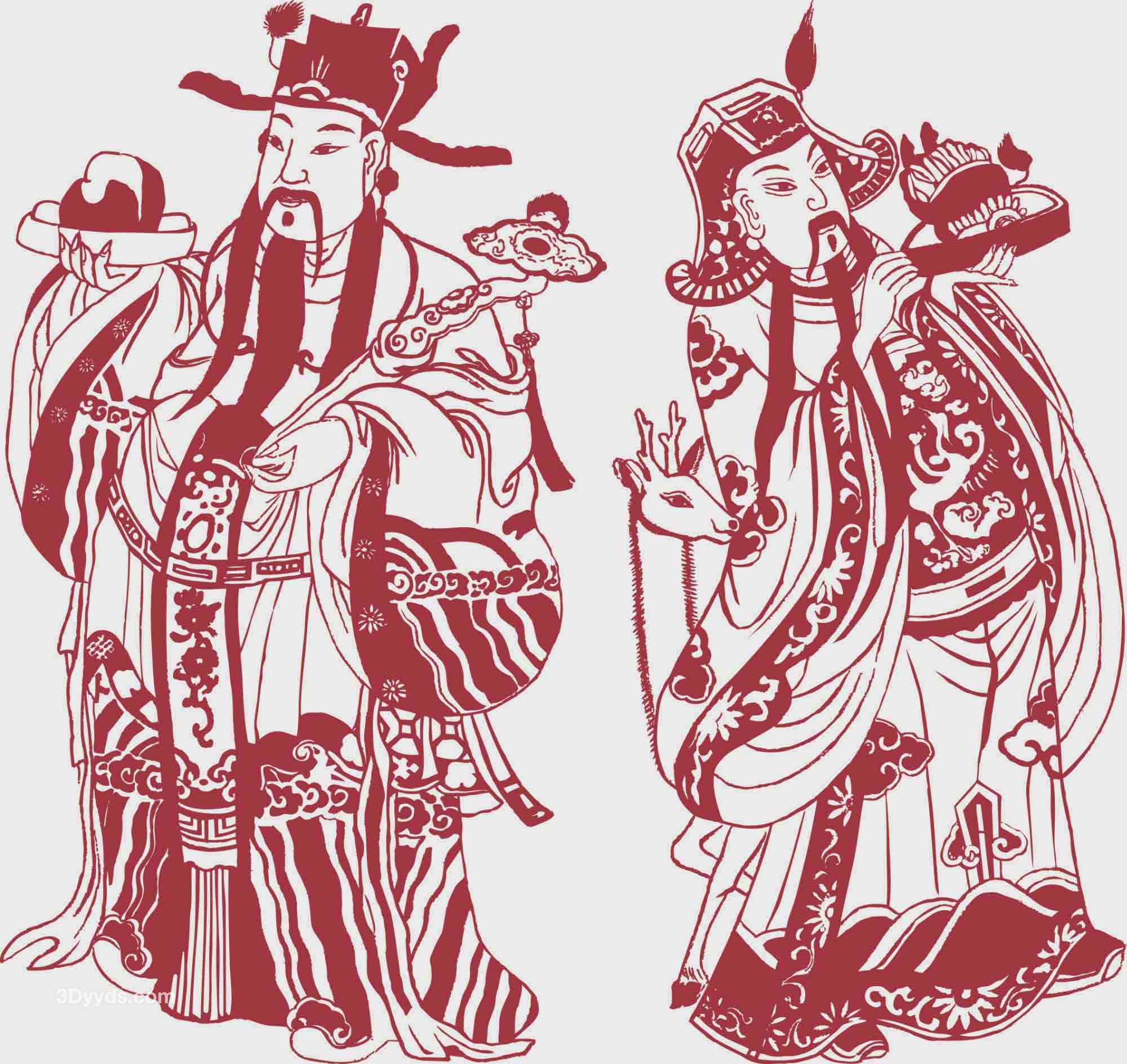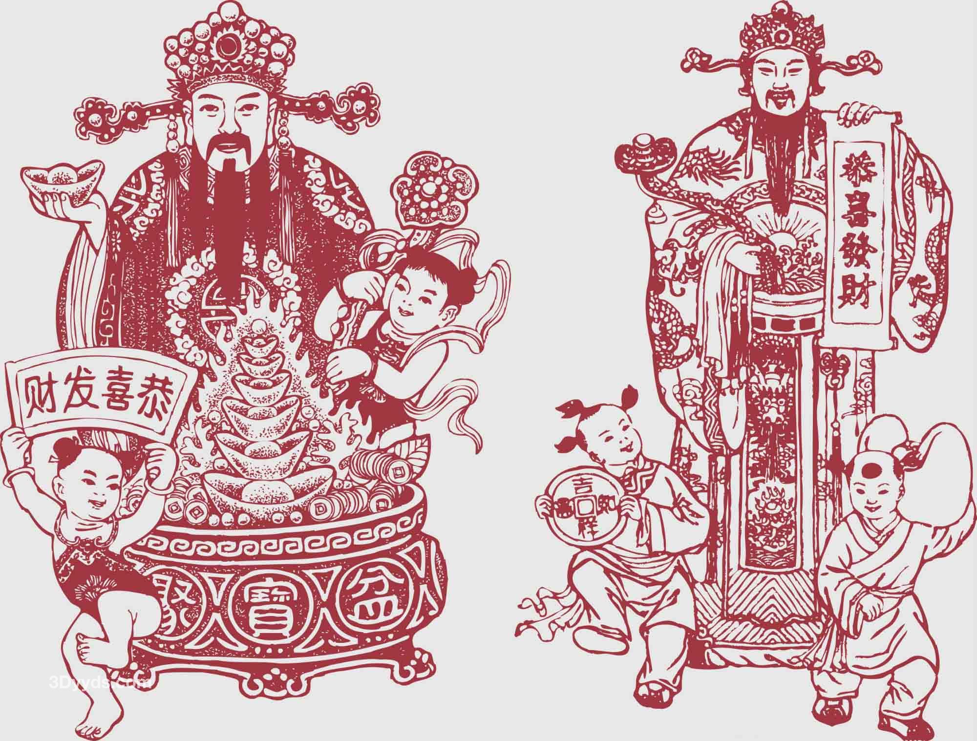 中国财神传统民间手绘财神仙剪纸年画线稿图案矢量PNG免抠素材
