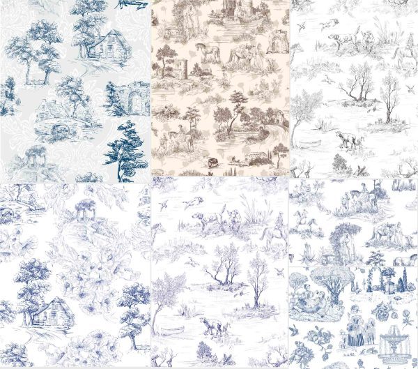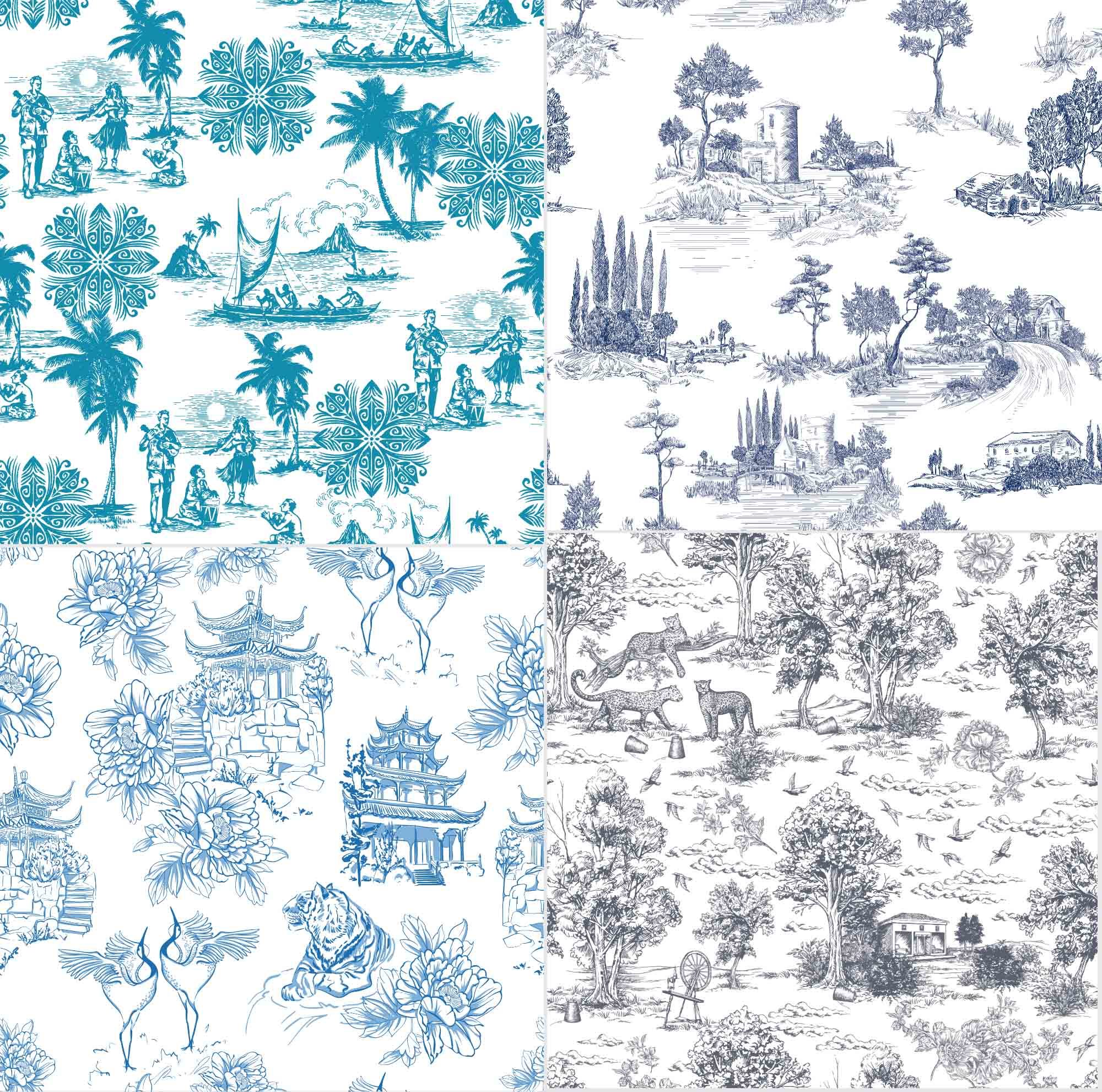 古典乡村宫廷庄园树林蓝色手绘素描草图印花图案AI矢量设计素材