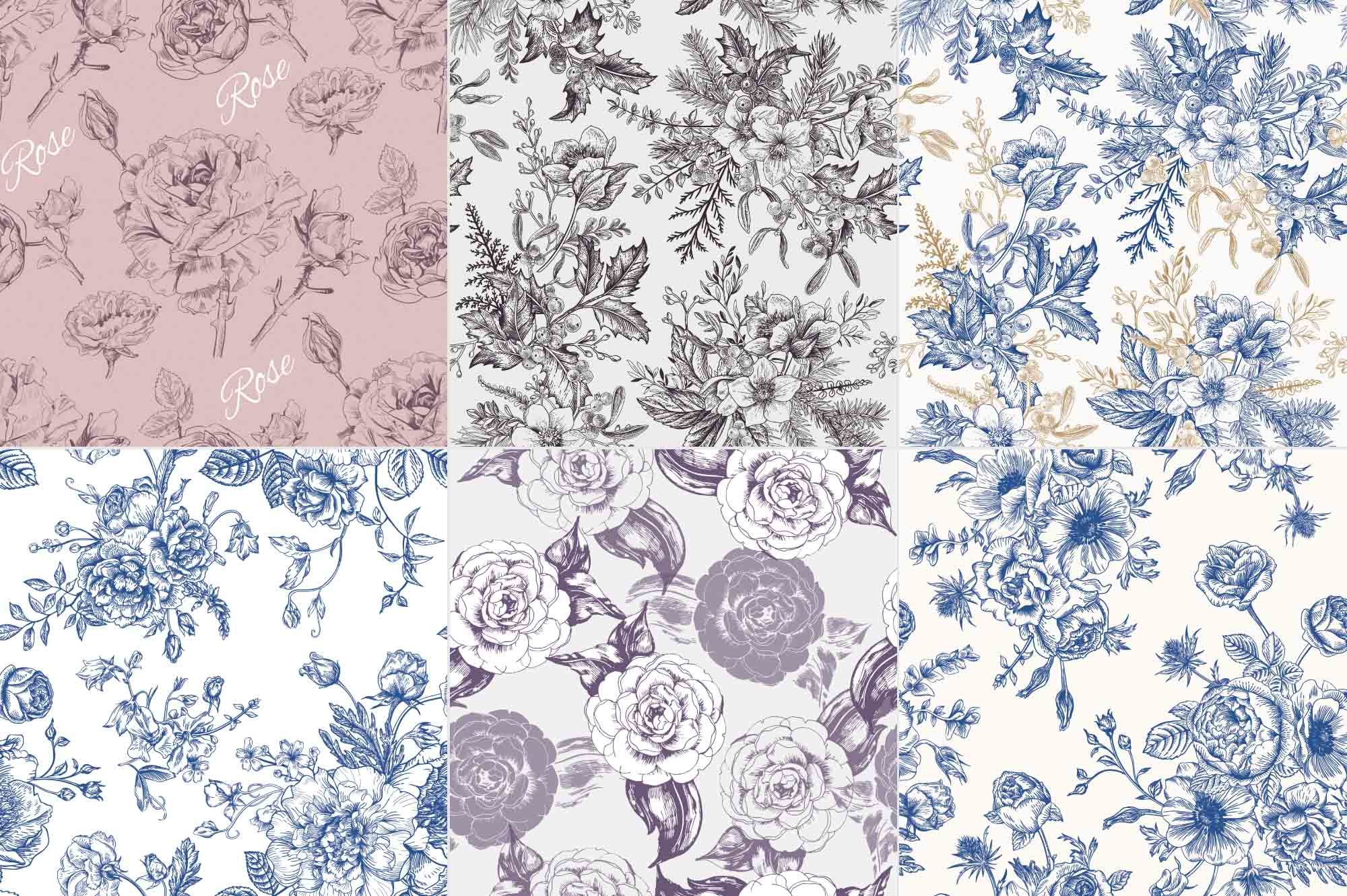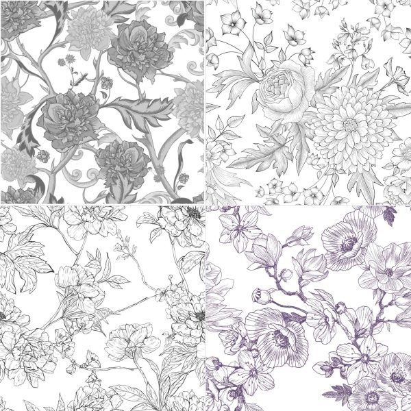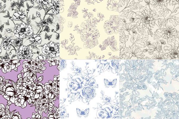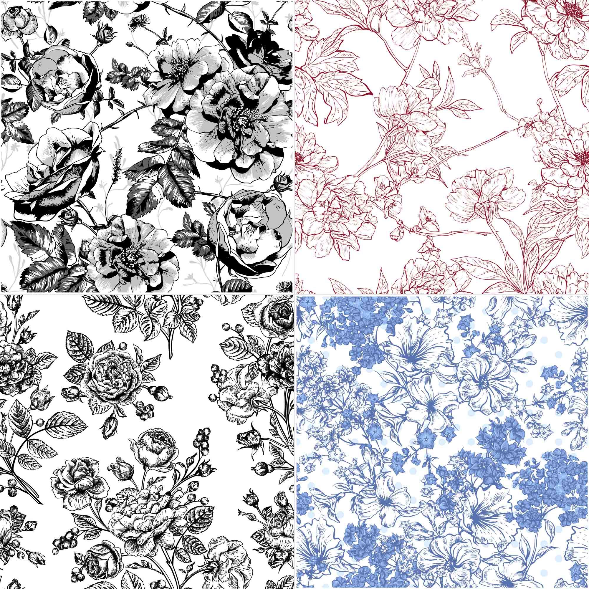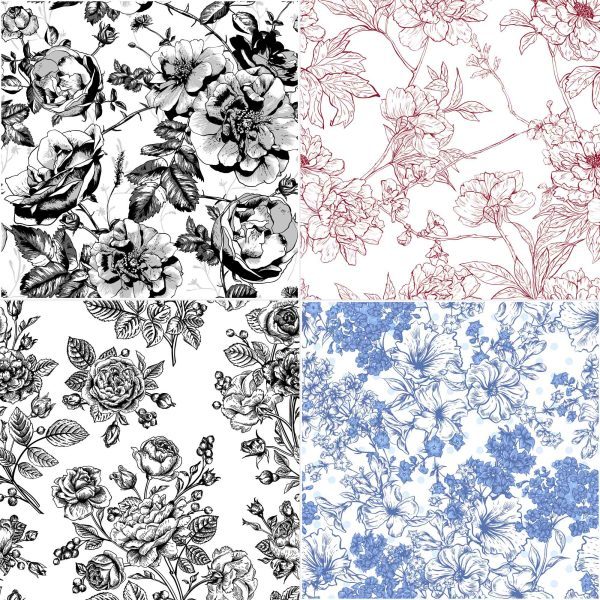 手绘花卉素描线描玫瑰牡丹蜜蜂蝴蝶印花无缝拼接矢量设计素材图