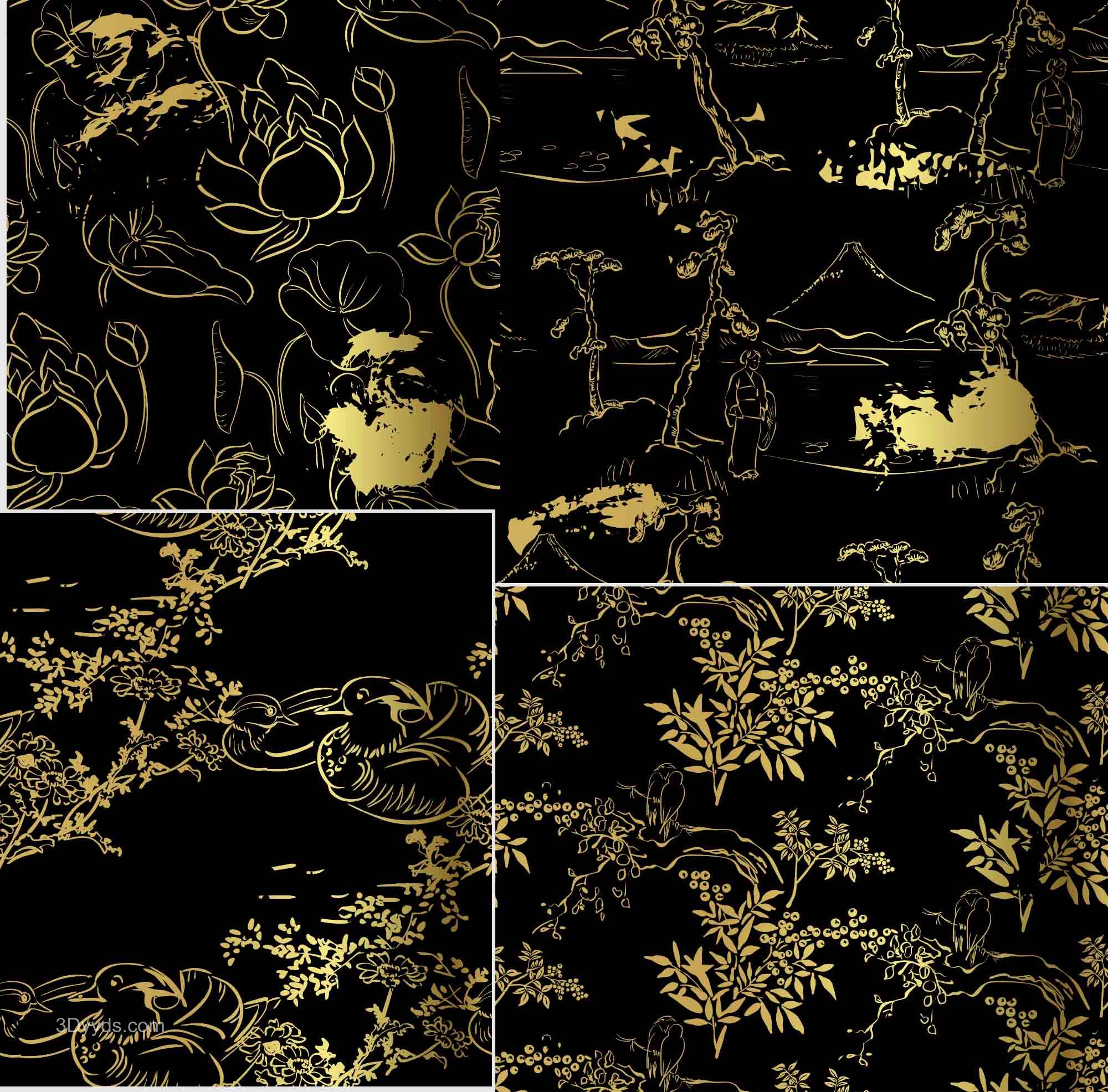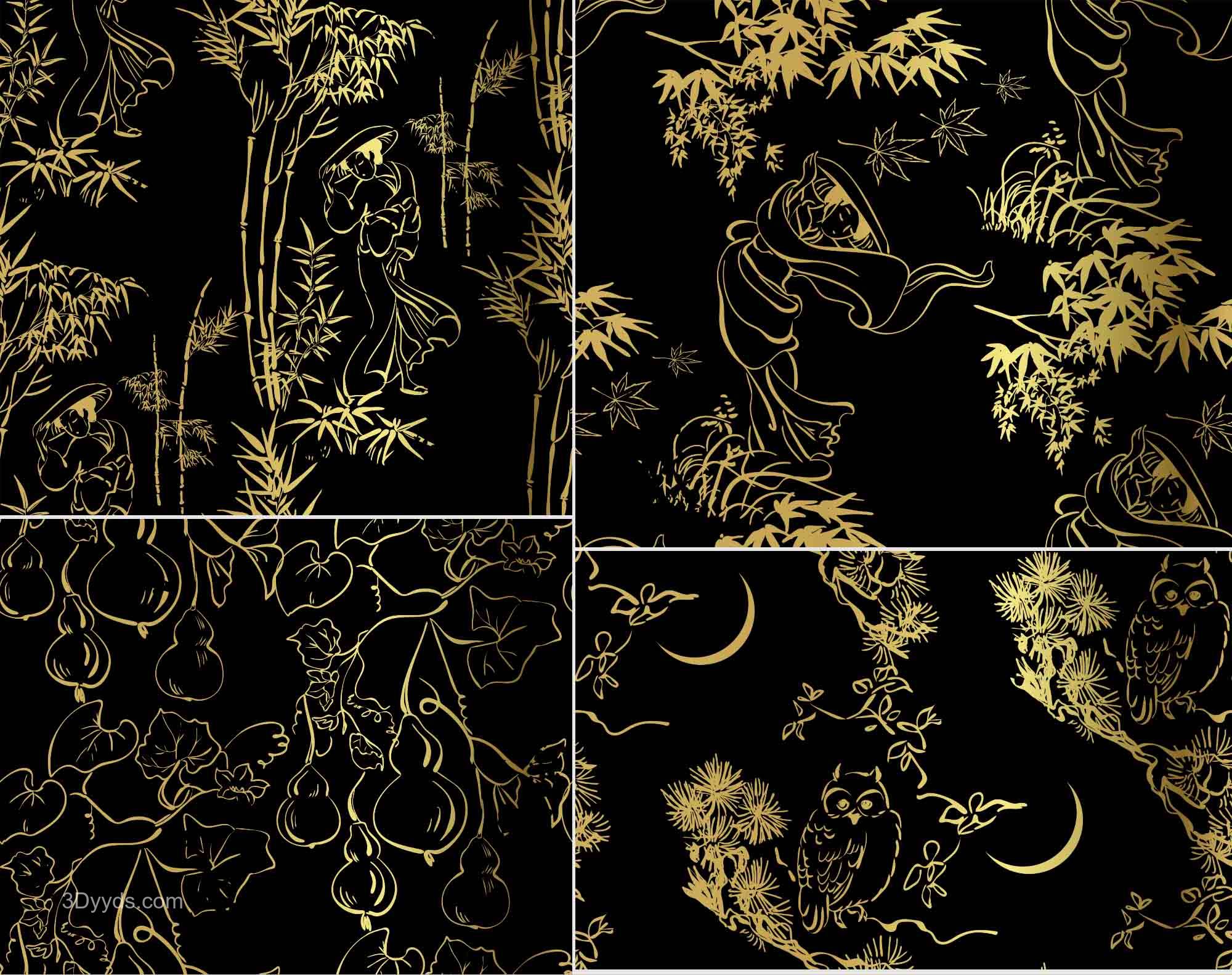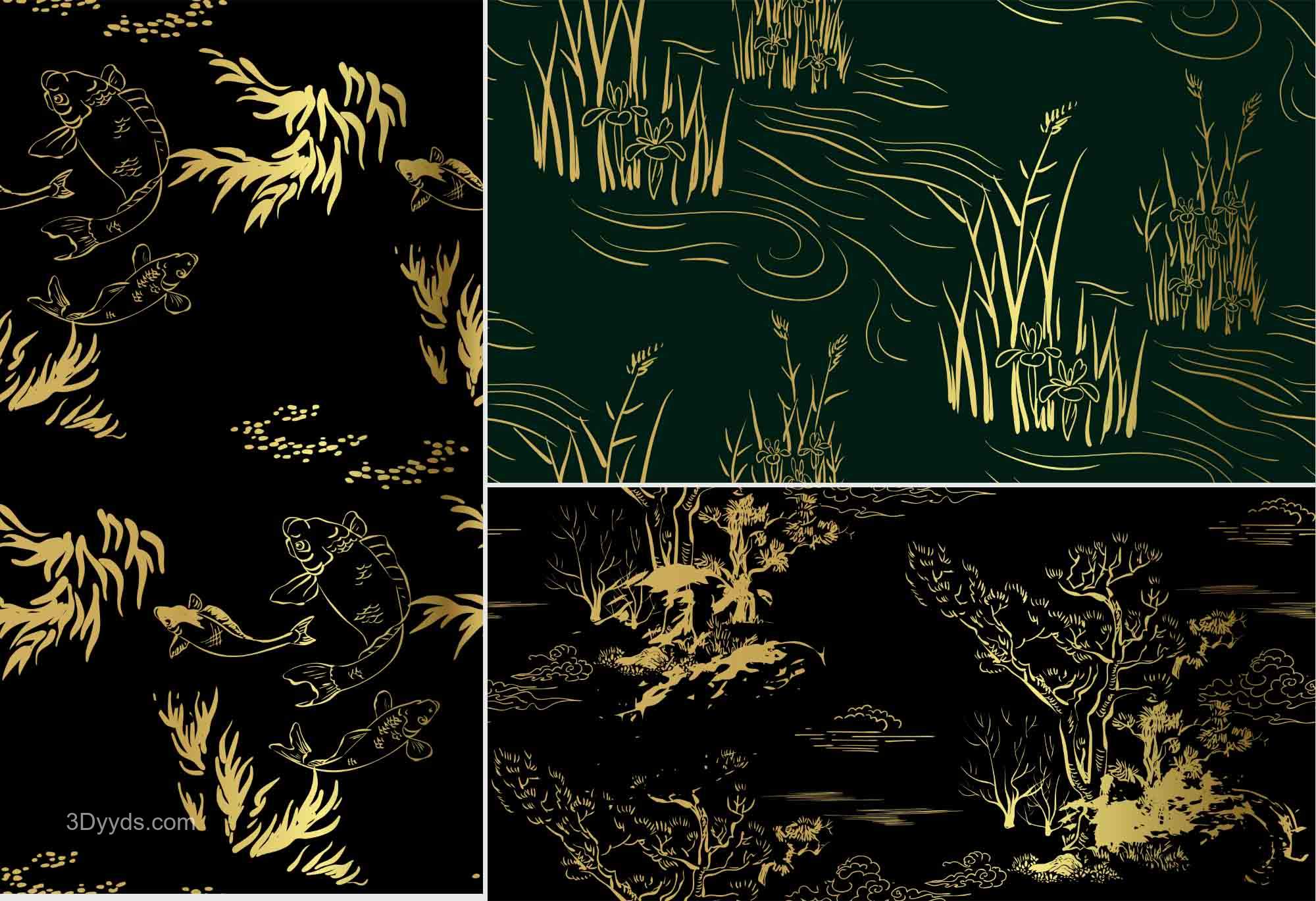 矢量AI手绘传统烫金无缝古典复古植物线描背景包装纹理底纹素材