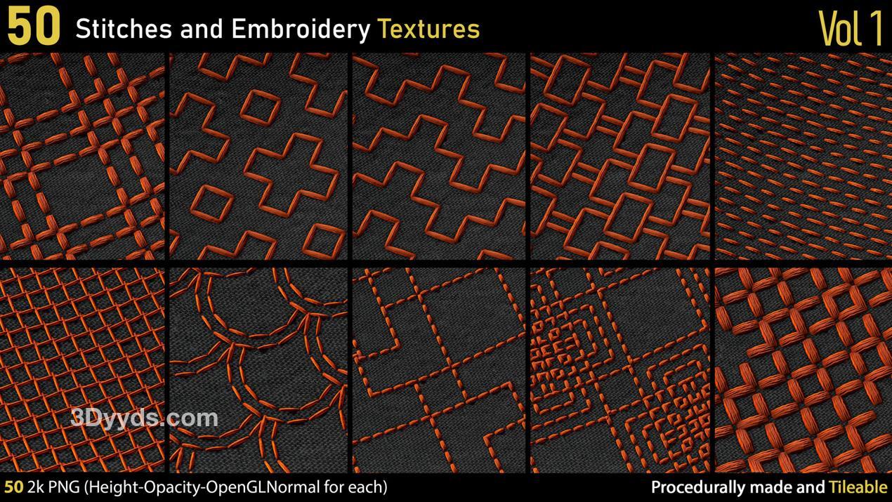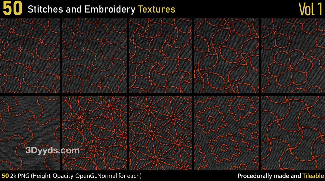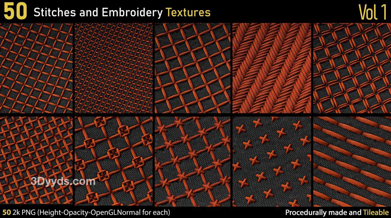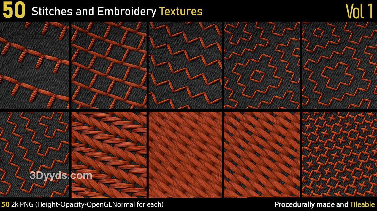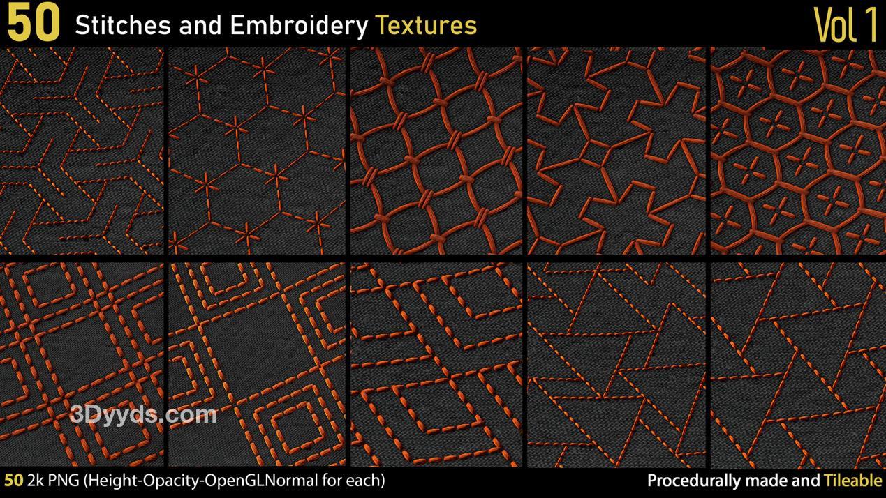 这里有一套包含50种不同的2k刺绣和针线PNG纹理。
