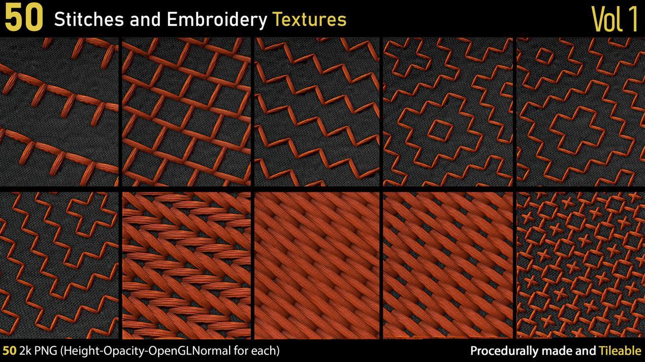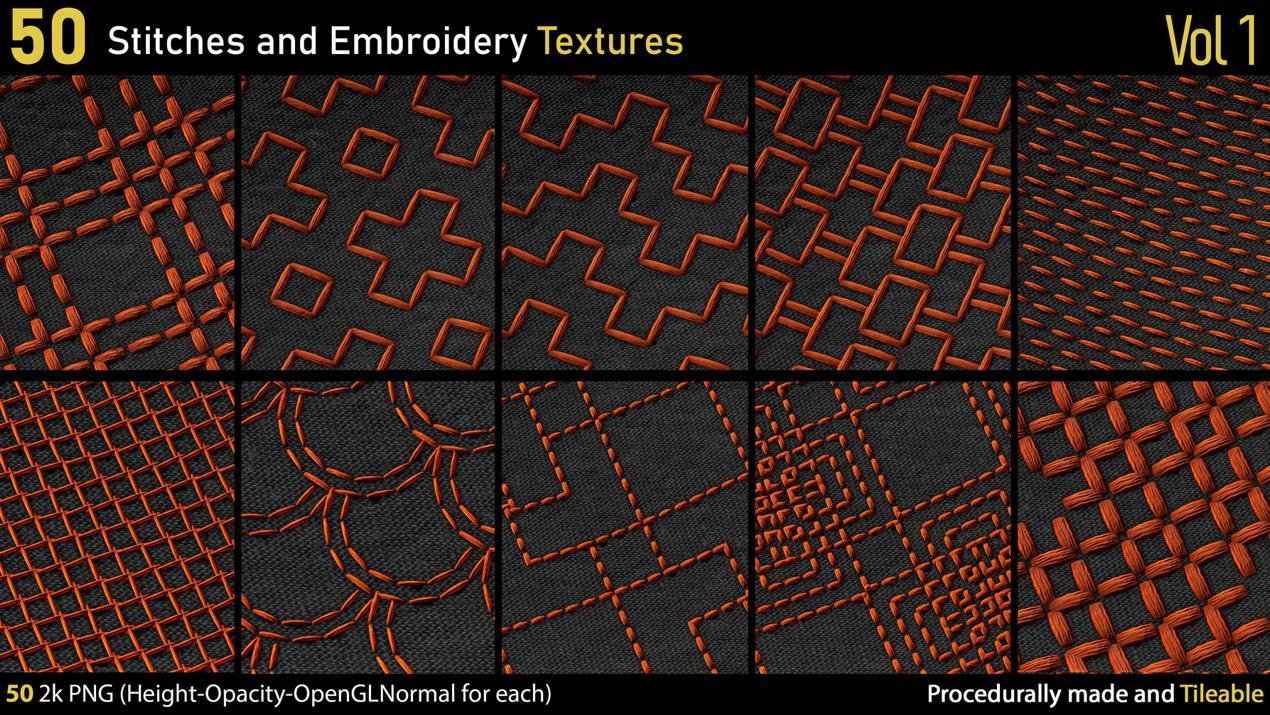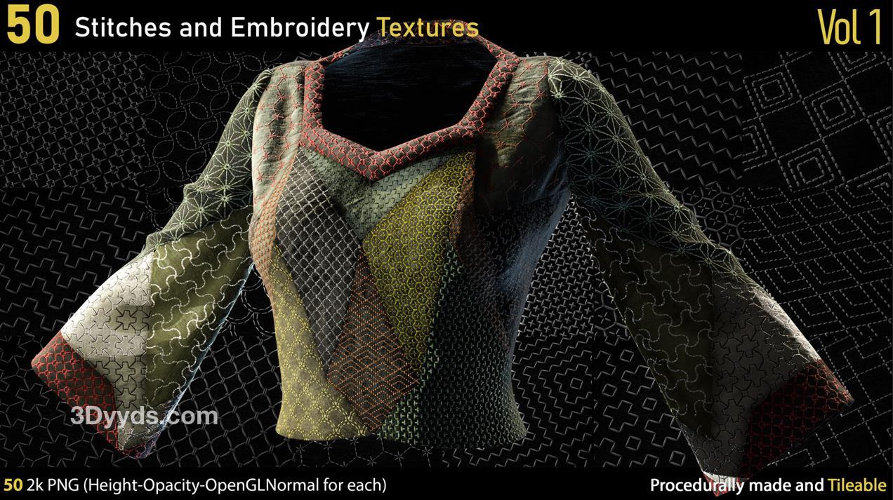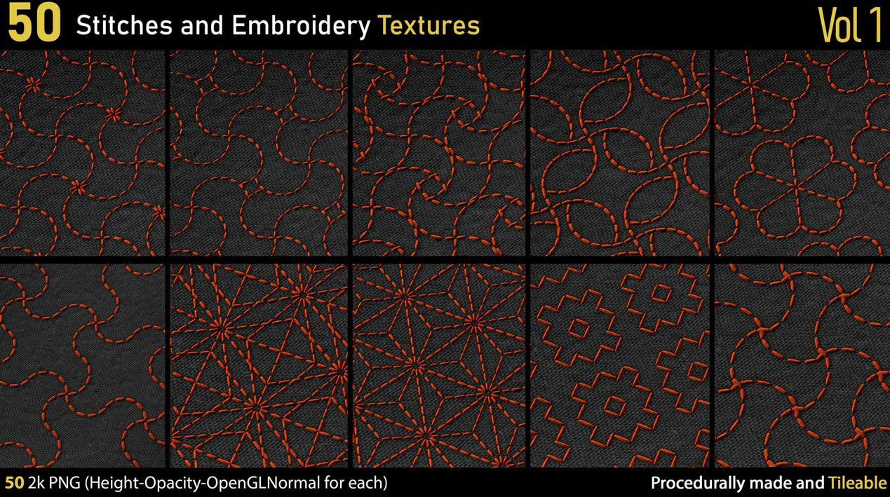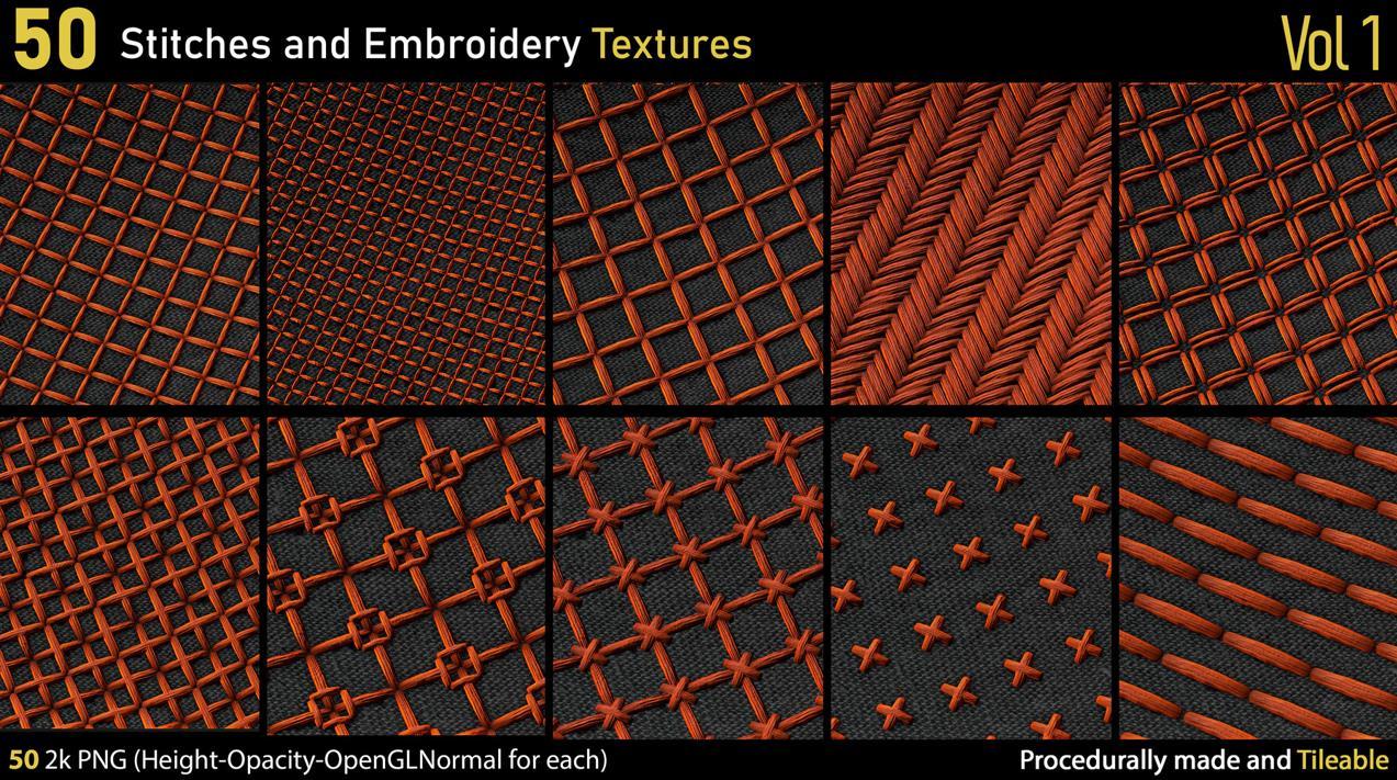这里有一套包含50种不同的2k刺绣和针线PNG纹理。