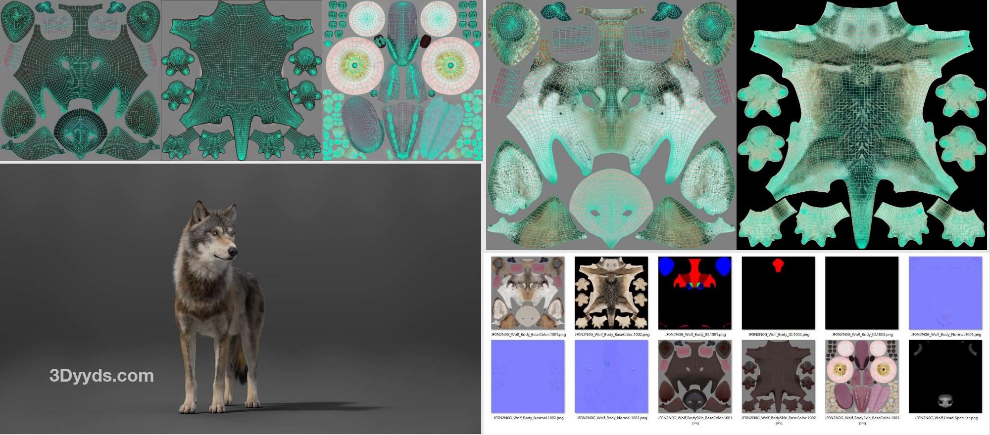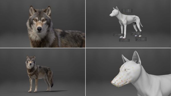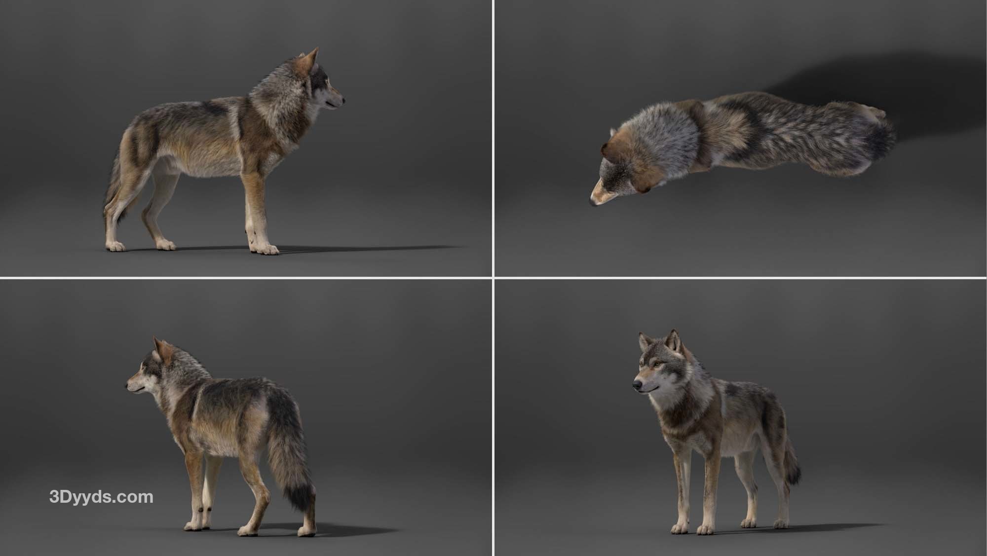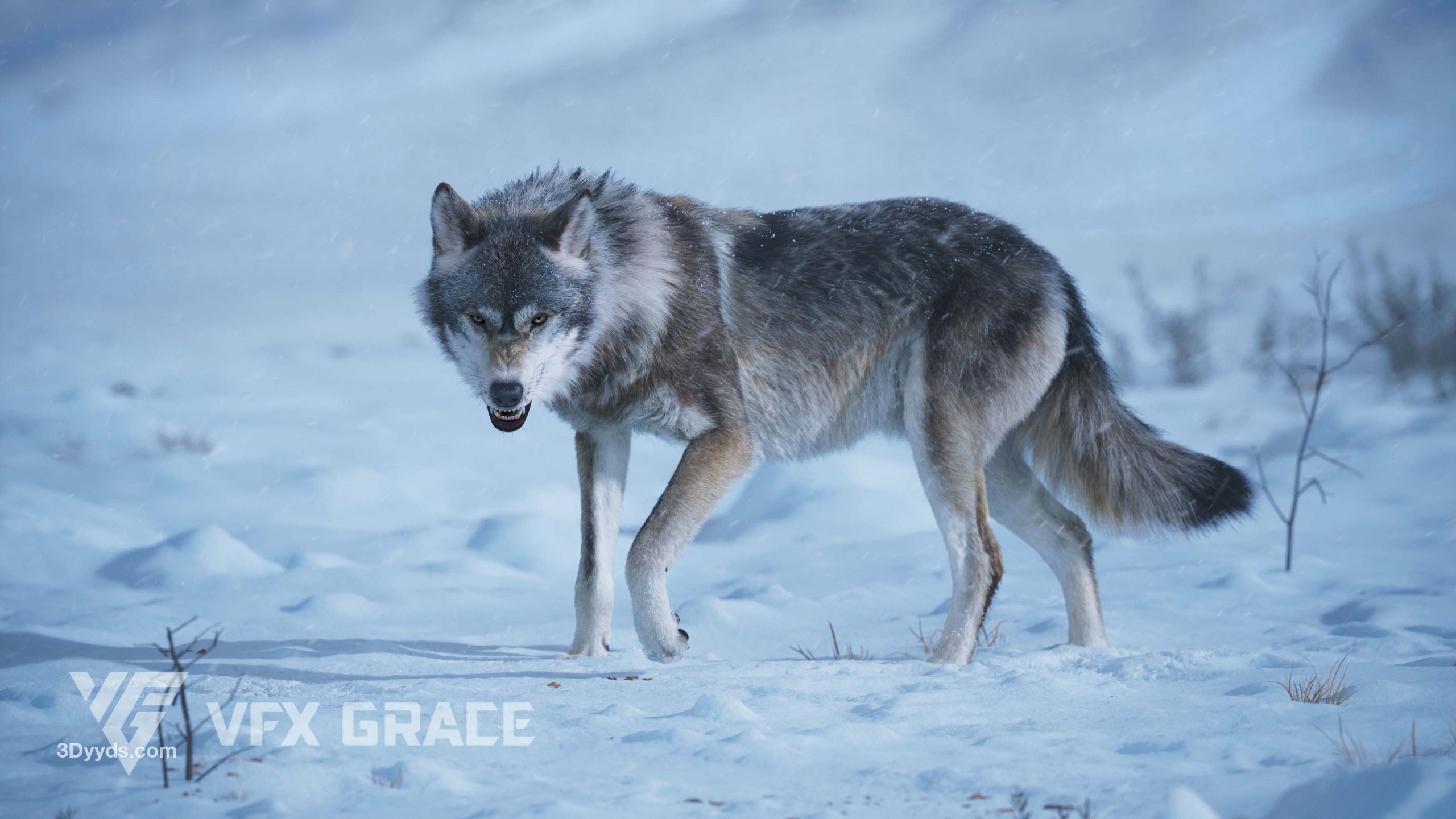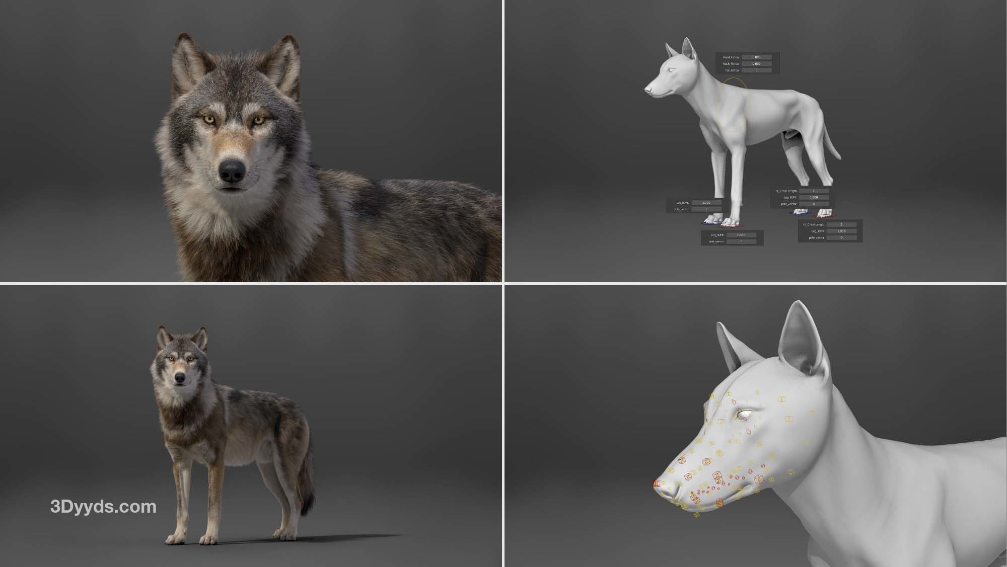这是一个高质量的狼模型,具有 4K UDIM 地图、毛皮、索具和三个逼真的动画。该模型具有逼真的肌肉结构,在 Blender 中创建的复杂头发系统使头发自然逼真,以及详细的面部表情控制系统。此模型是使用 Blender 和 Cycles 渲染器以真实世界比例制作的。